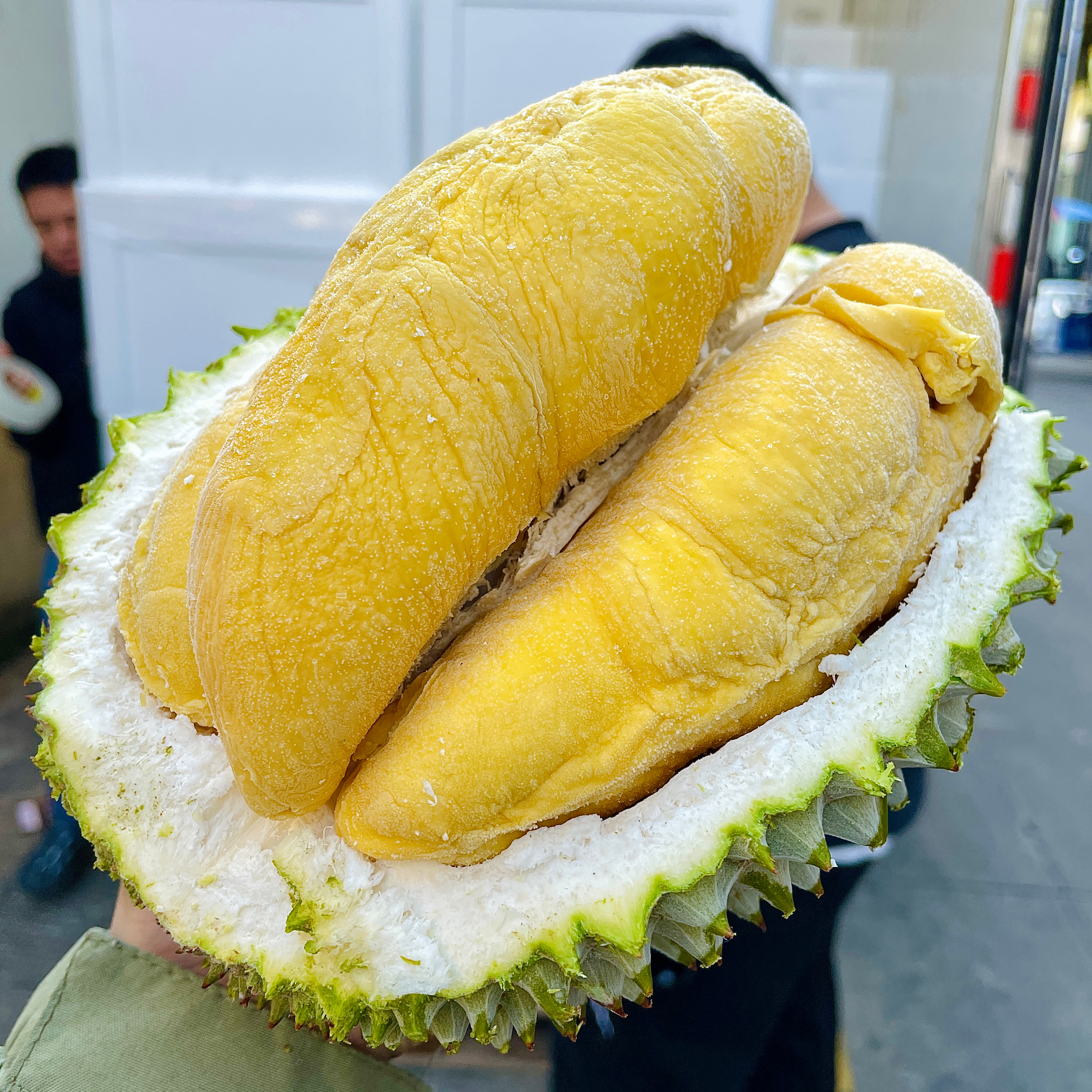 与大部分榴莲不一样的是,猫山王的刺是大大的,但是不尖锐,是属于钝刺的榴莲。猫山王榴莲以其独特的风味而闻名于世。还没有入口就可以感受到它所散发出浓郁的香气,让人迷醉其中
