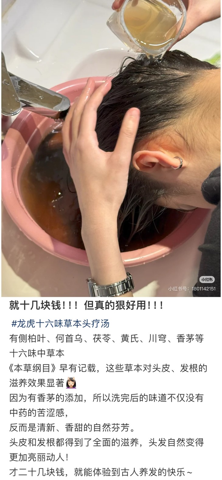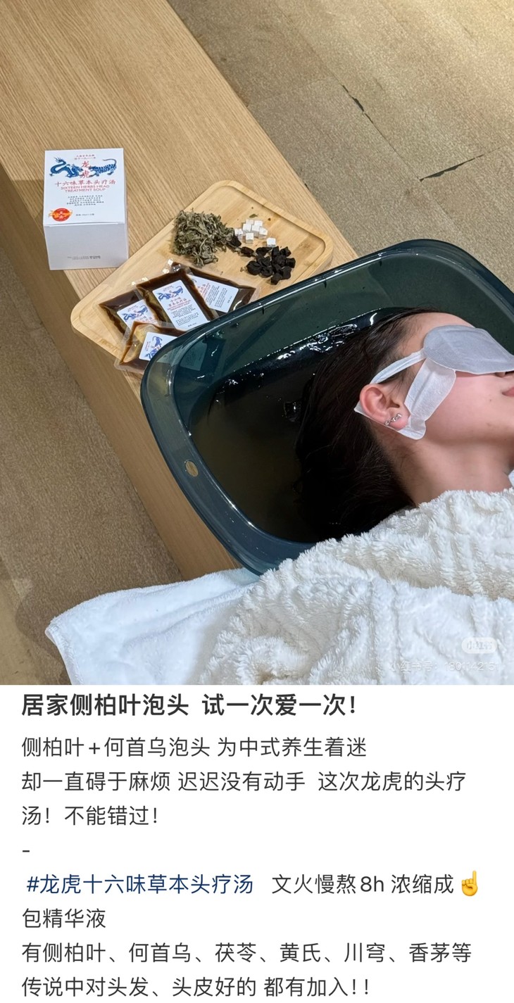 龙虎十六味草本头疗汤,真真是草本精华的大集合,除了艾草、生姜、侧柏叶、女贞子、黄芪、当归、何首乌…… 再无任何其他添加!侧柏叶自古以来就被奉为护发必备良方,《本草纲目》记载其能主治 “头发不生”,晋・葛洪《肘后方》里也有 “生发方,取侧柏叶,阴干作末,和油涂之” 的说法,古人的智慧在这小小侧柏叶上体现得淋漓尽致。千百年来,何首乌在乌发界的地位也从未动摇,一直为乌发助力,让毛发重焕乌黑亮泽的光彩。还有生姜,刺激毛囊活跃,发根得以更加坚固,牢牢抓住头皮。还有当归、女贞子多种草本精华也齐齐上阵协同作用,让头皮环境得到改善,秀发也有了强韧的 “地基”,从根儿上变得乌黑强健,这和染发是有着本质区别的哦,从内而外散发出健康之美。