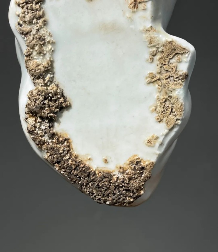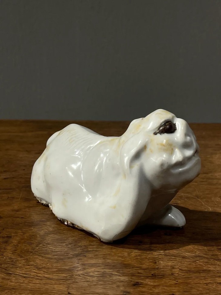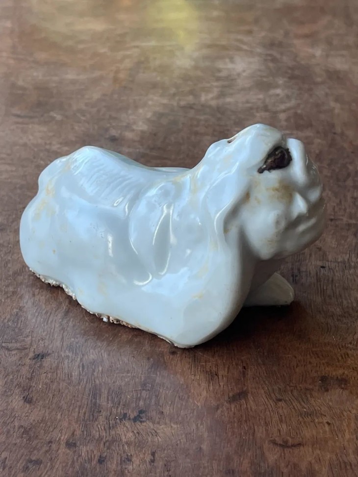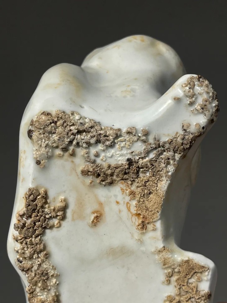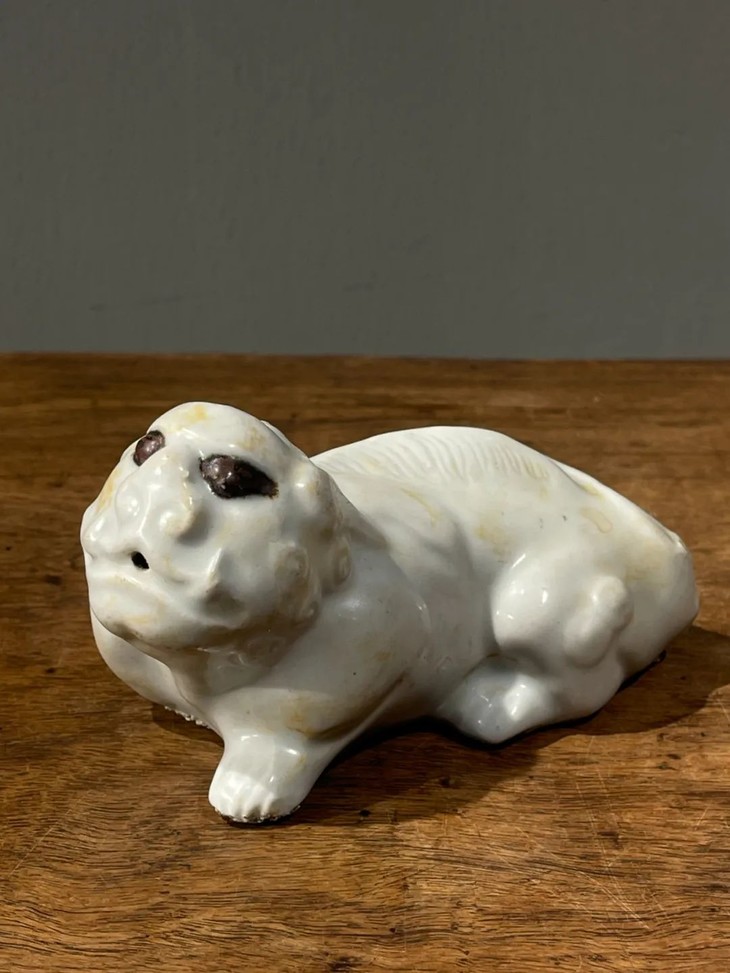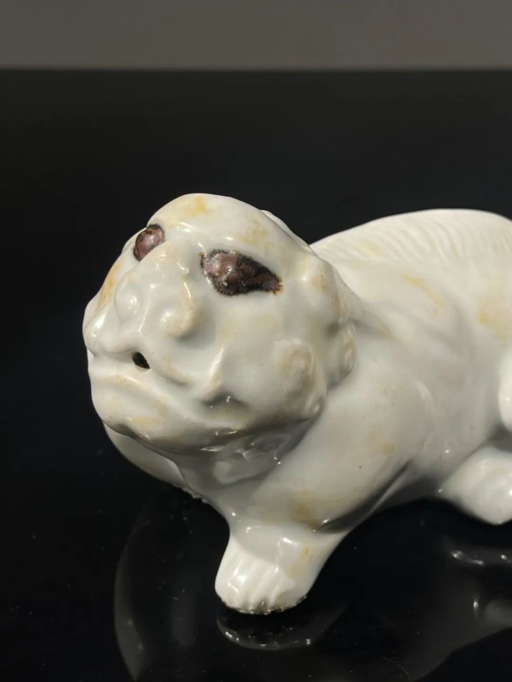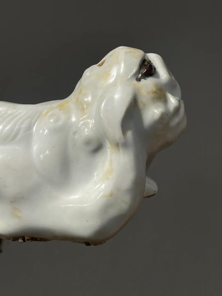 此白瓷褐彩瑞狮形水注,经历逾百年,如图所示,除底部黏着石英沙以及釉表磨损痕外,保存基本完好。