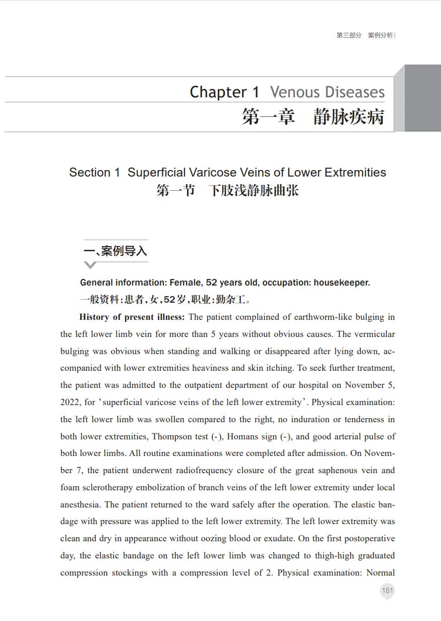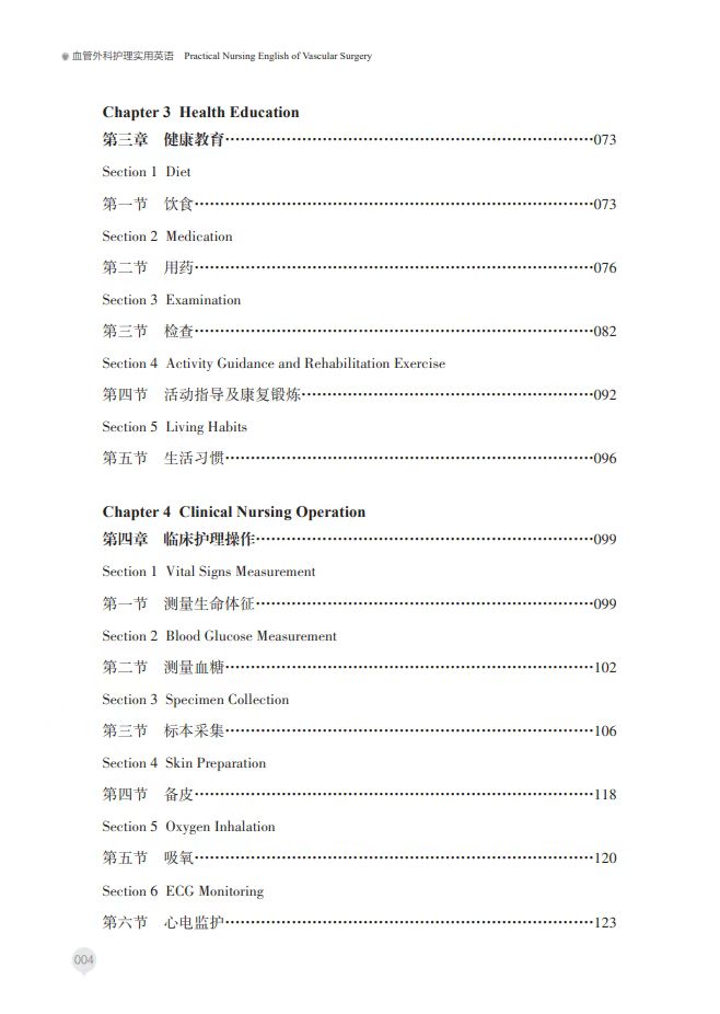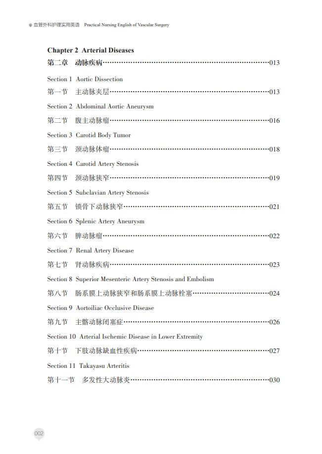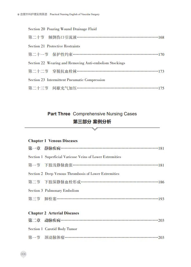 第三部分为案例分析, 包含静脉、动脉和动静脉疾 病案例。如静脉疾病有下肢 浅静脉曲张、下肢深静脉血 栓形成等;动脉疾病有颈动 脉体瘤、颈动脉狭窄等;动 静脉疾病有动静脉瘘。本书 为血管外科护理人员提供了 专业英语学习的实用资料。