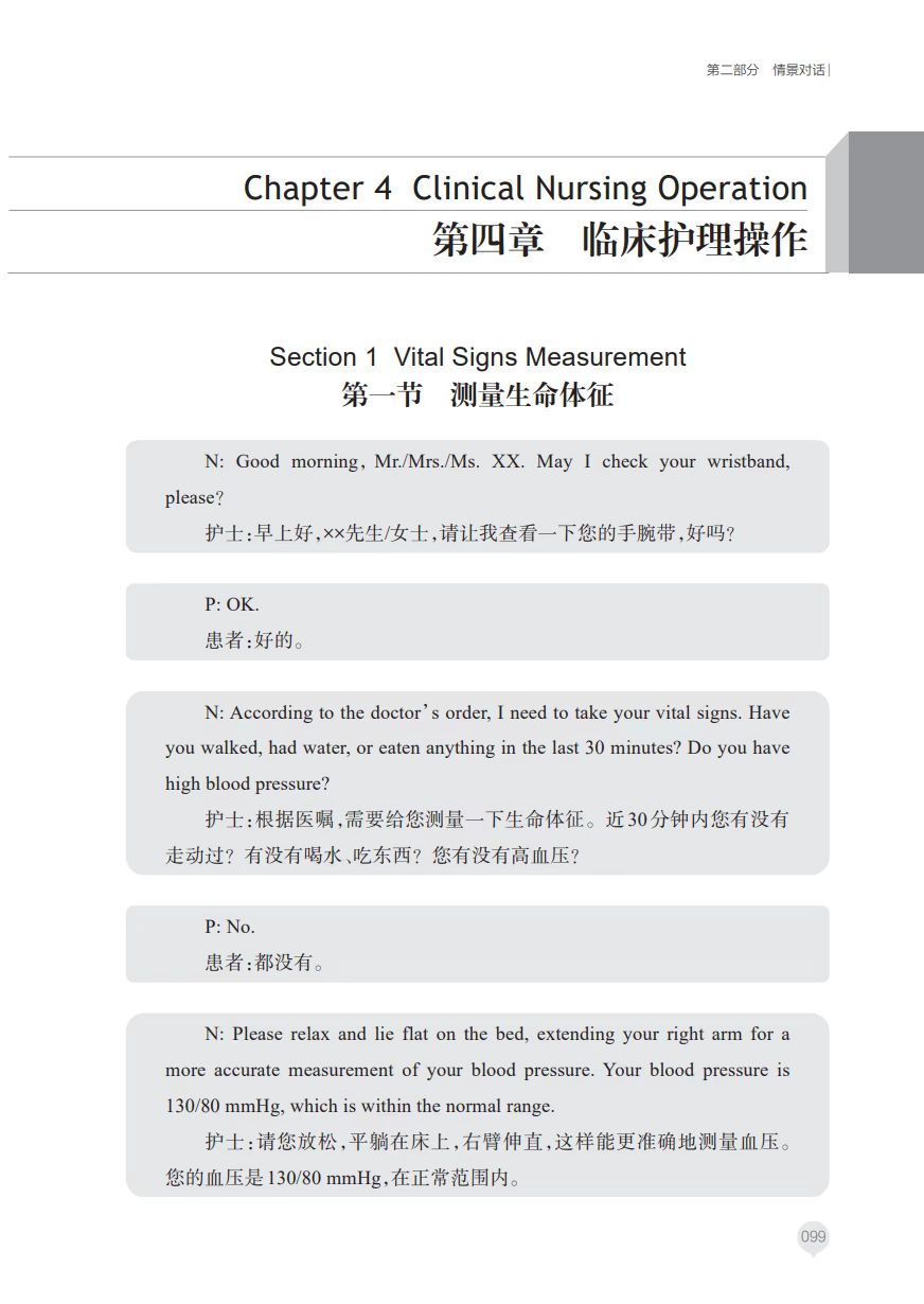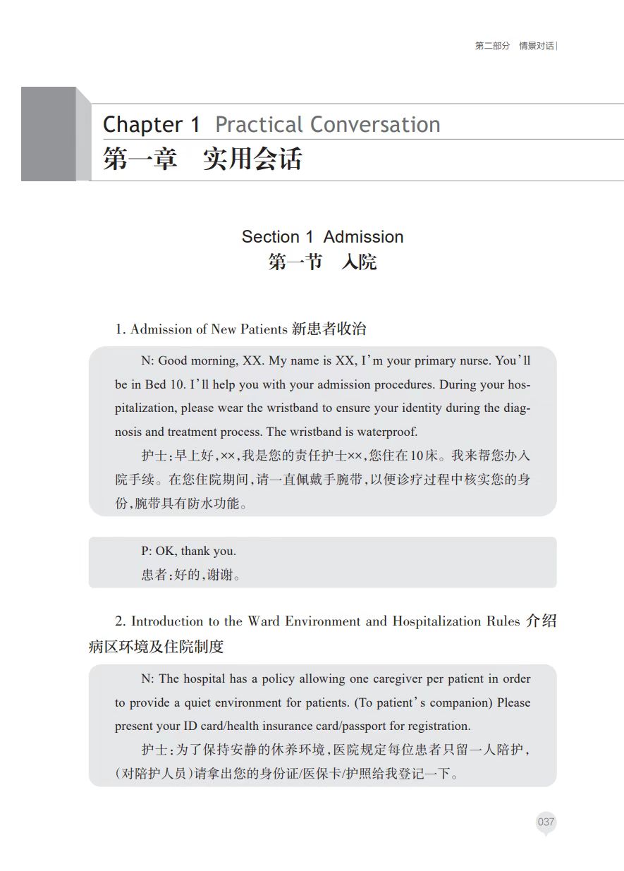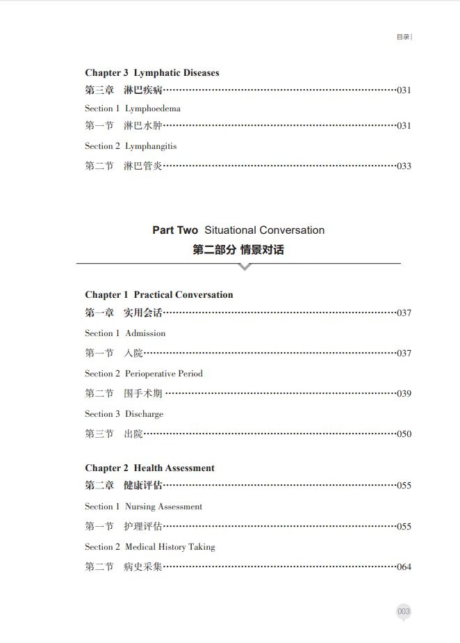 第二部分是情景对话, 涉及实用会话、健康评估、 健康教育和临床护理操作。