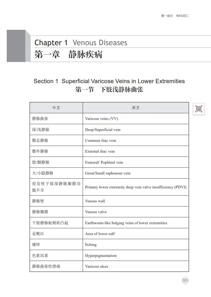 部分为专科词汇, 涵盖静脉、动脉和淋巴疾病 相关词汇。其中静脉疾病包 含下肢浅静脉曲张、深静脉 血栓形成等;动脉疾病有主 动脉夹层、腹主动脉瘤等; 淋巴疾病包括淋巴水肿、淋 巴管炎。