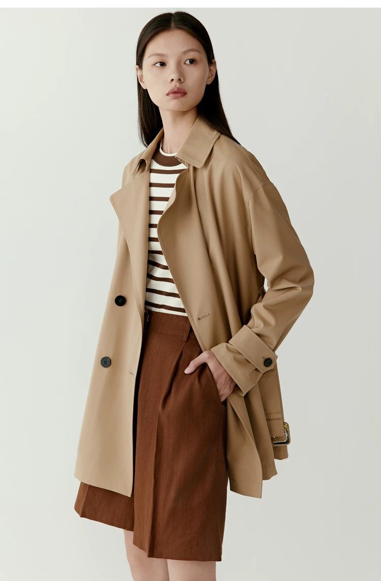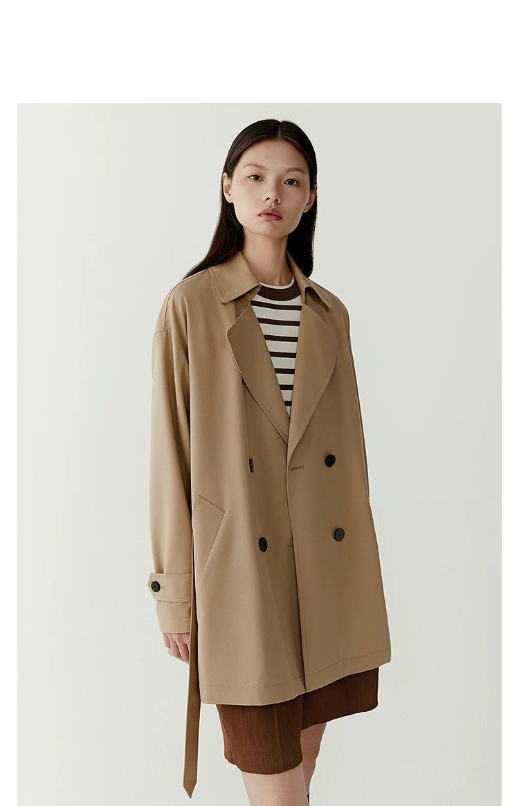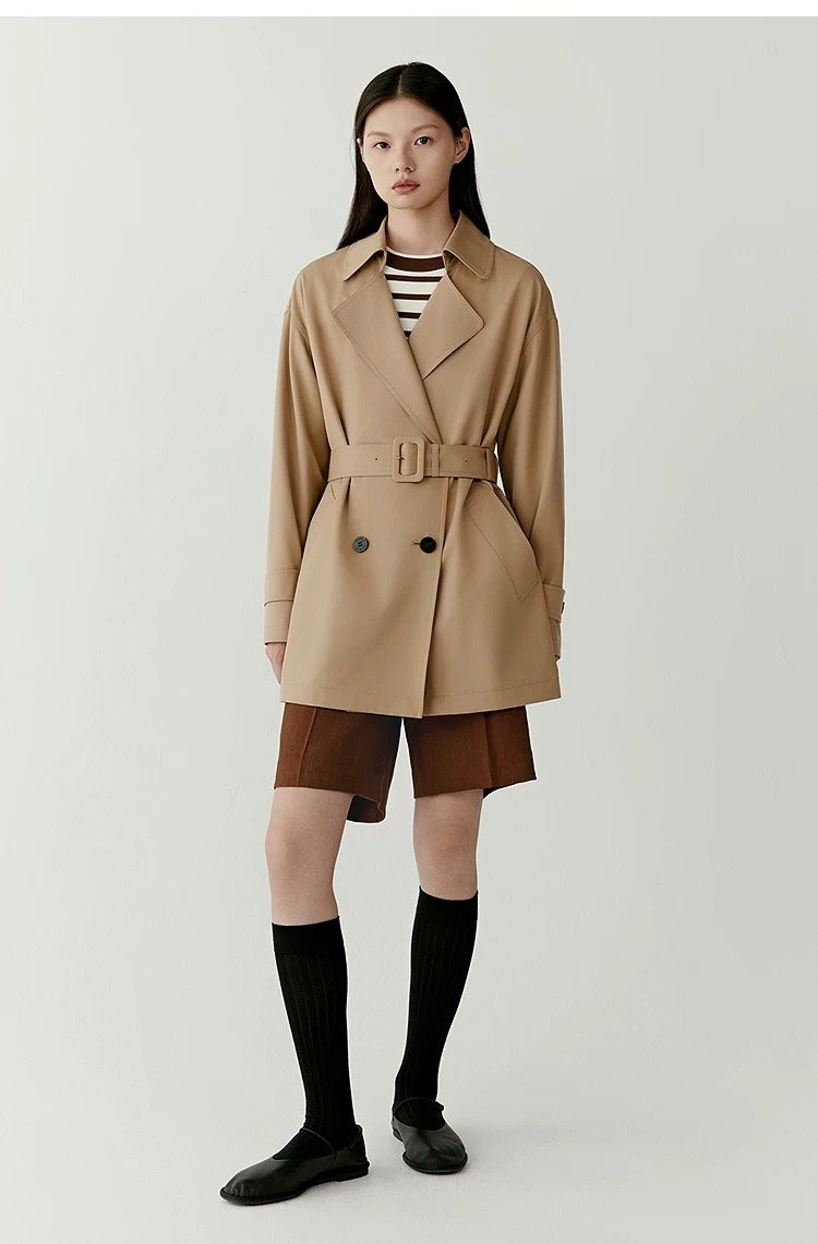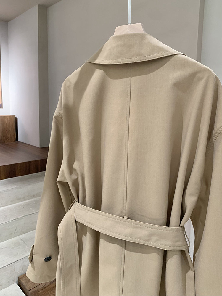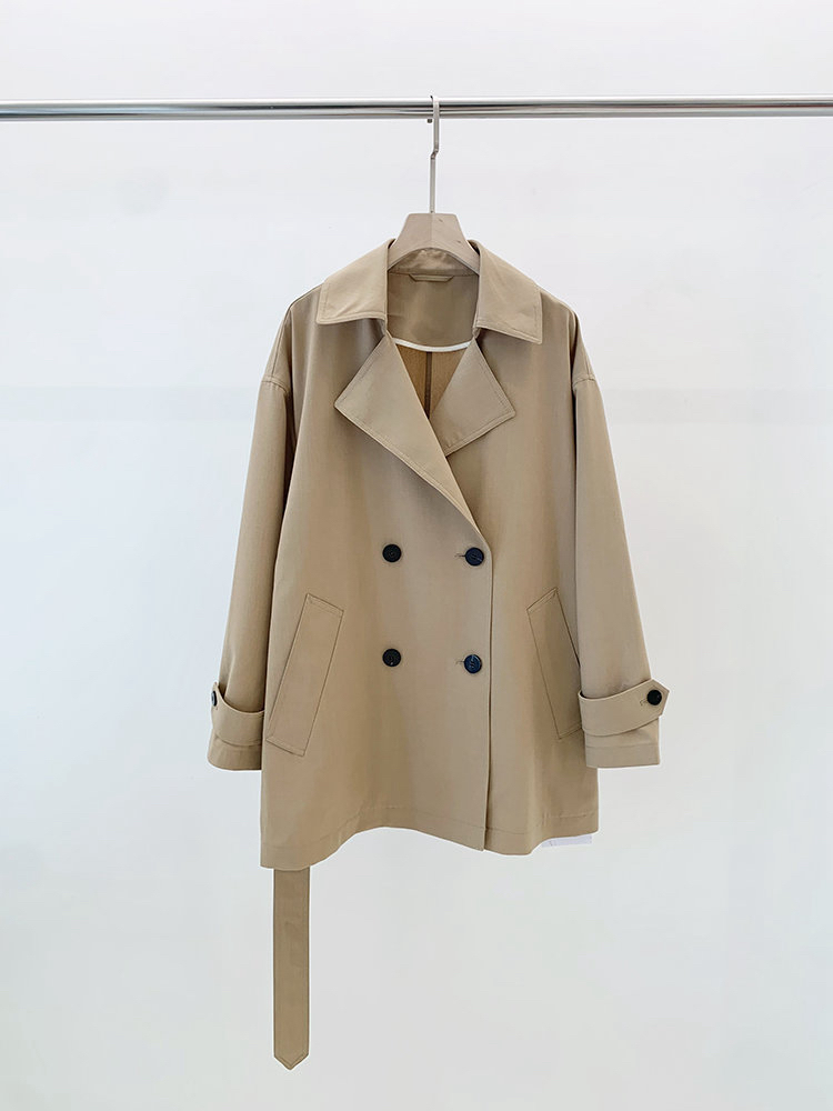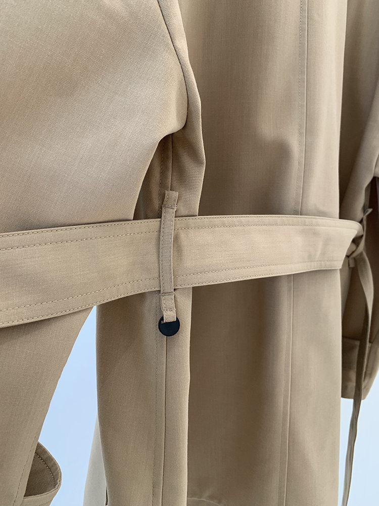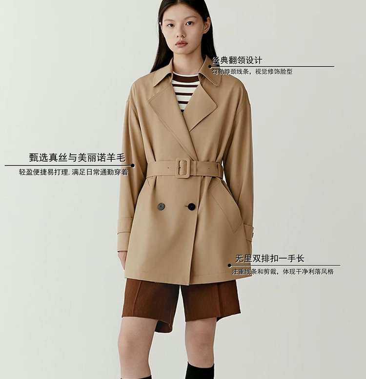丝羊毛精纺平纹布双排扣风衣 经典简约一手长长度 线条剪裁干净利落 经典翻领设计 搭配本布腰带 风格随心切换