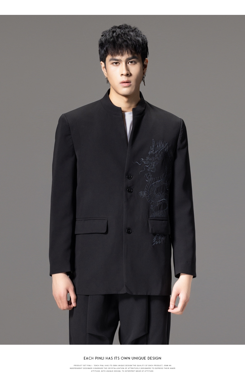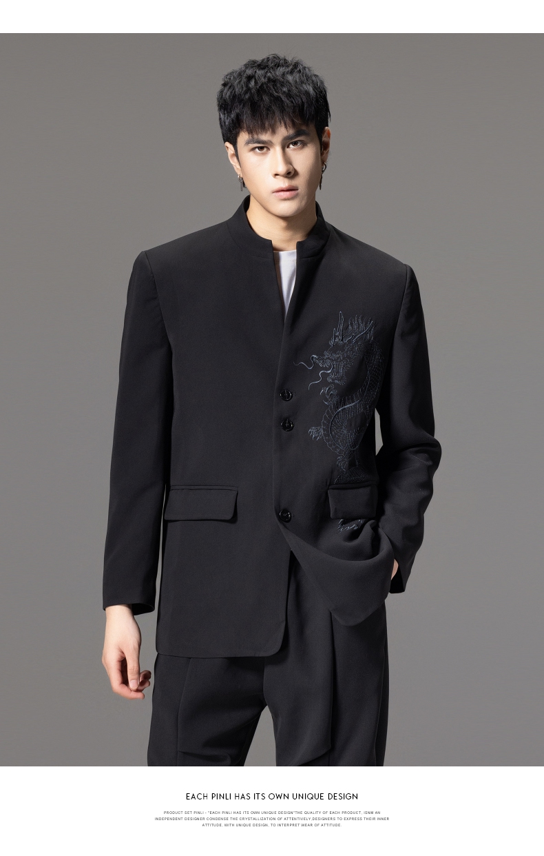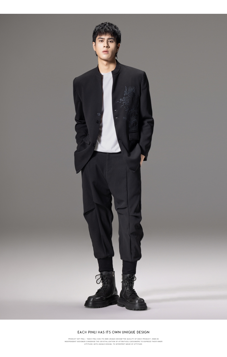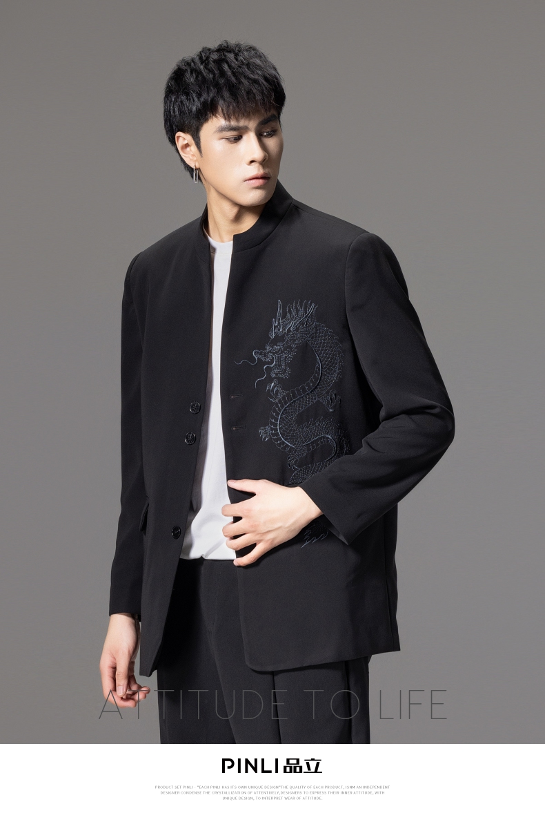PINLI品立秋季新款立领新中式刺绣休闲西服男士国潮西装外套B243106027