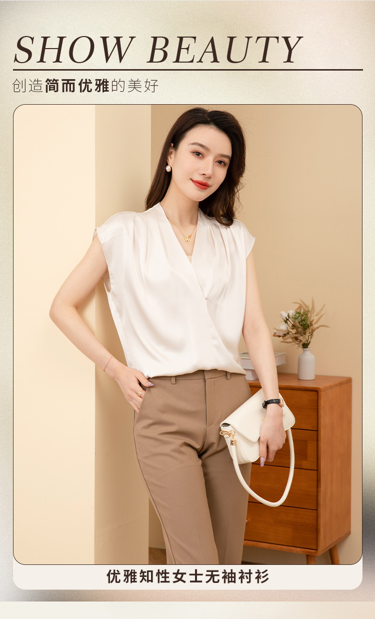 罗蒙夏季女装V领缎面衬衫无袖设计优雅时尚知性百搭衬衣女