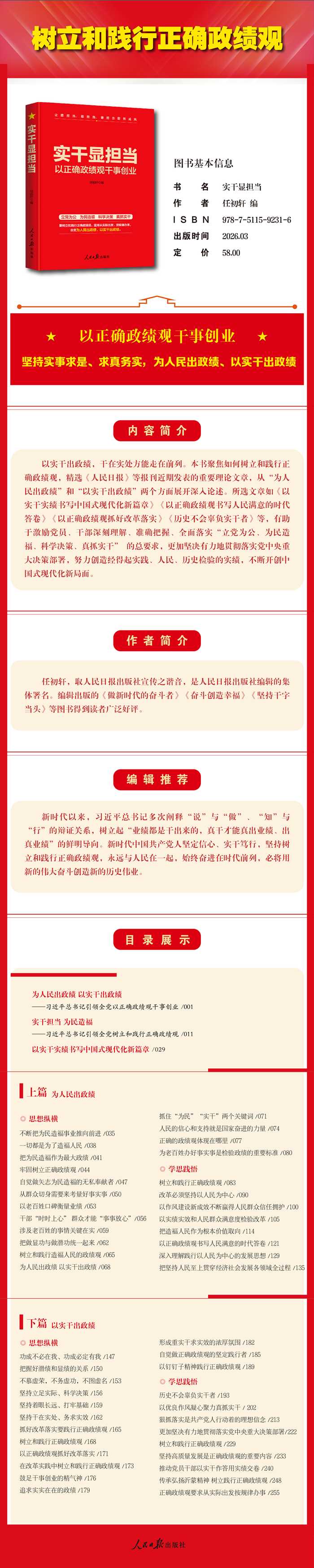 以实干出政绩,干在实处方能走在前列。本书聚焦如何树立和践行正确政绩观,精选《人民日报》等报刊近期发表的重要理论文章,从;为人民出政绩和;以实干出政绩两个方面展开深入论述。所选文章如《以实干实绩书写中国式现代化新篇章》《以正确政绩观书写人民满意的时代答卷》《以正确政绩观抓好改革落实》《历史不会辜负实干者》等,有助于激励党员、干部深刻理解、准确把握、全面落实;立党为公、为民造福、科学决策、真抓实干 的总要求,更加坚决有力地贯彻落实党中央重大决策部署,努力创造经得起实践、人民、历史检验的实绩,不断开创中国式现代化新局面。