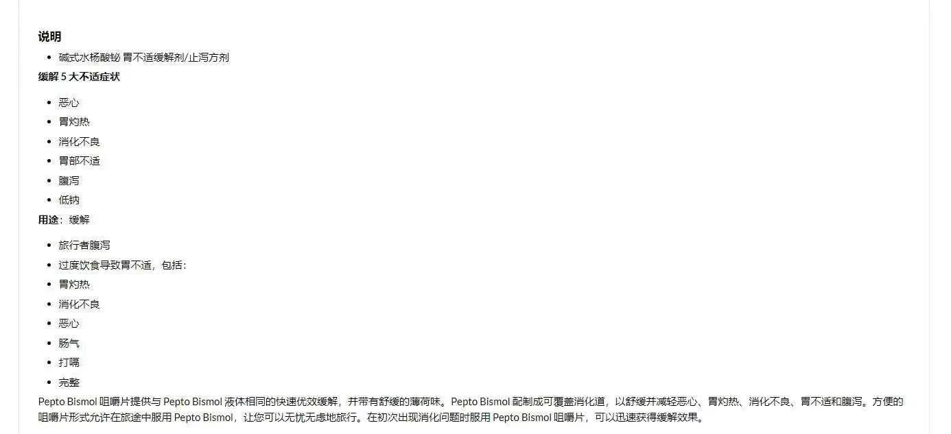 Pepto Bismo 是美国医生经常推荐的强效止泻💊旗下有止泻水、止泻胶囊、止泻片、止泻咀嚼片等,可以快速缓解因消化不良引起的腹泻等肠道问题。这款💊不仅可以做为止泻💊消化不良也可以吃,对烧心、恶心、胃部不适、消化不良、低钠都有很好的缓解作用。