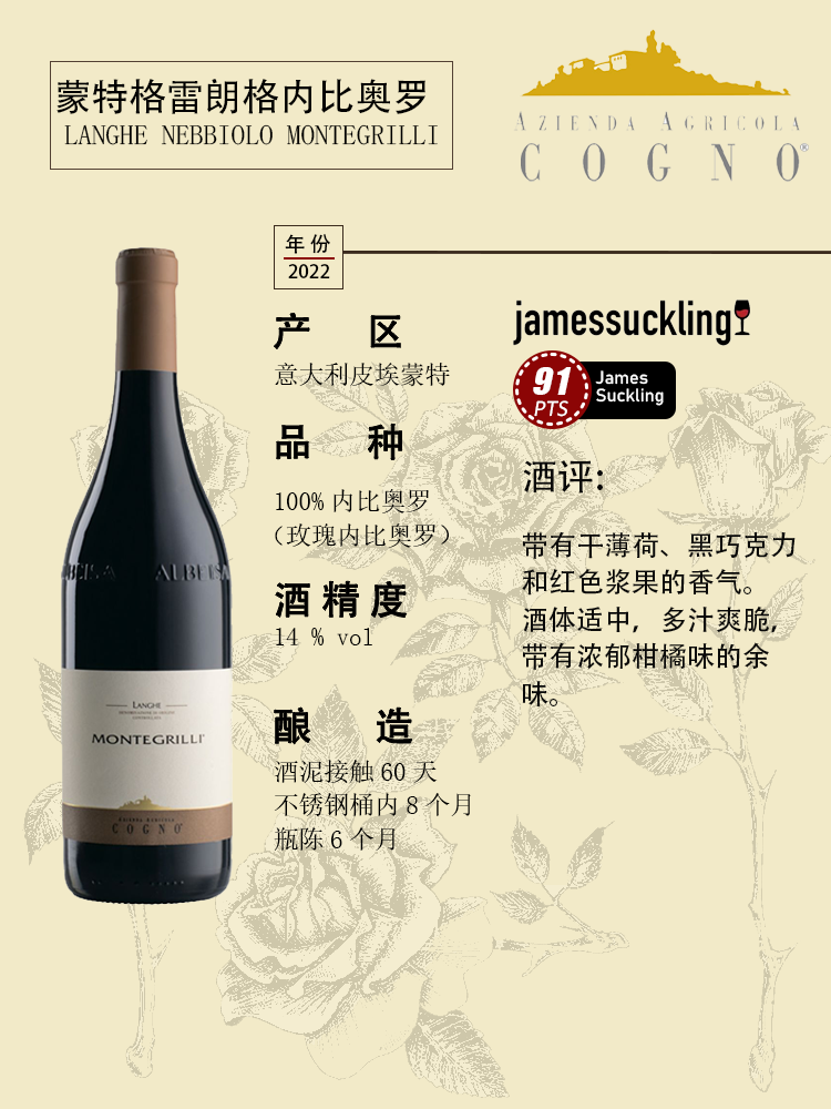 科诺蒙特格雷朗格内比奥罗红葡萄酒 2022 750mlELVIO COGNO LANGHE NEBBIOLO MONTEGRILLI
