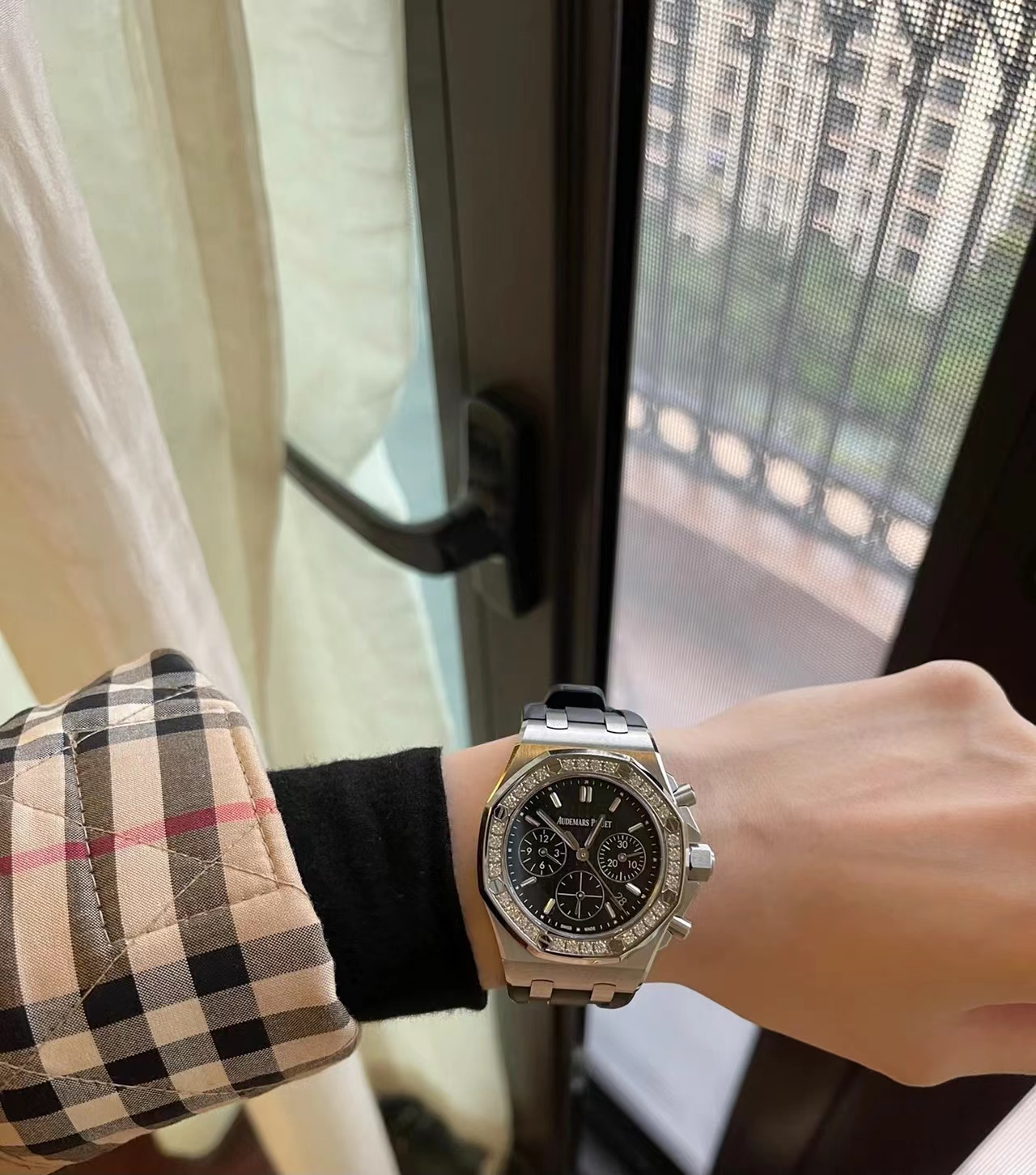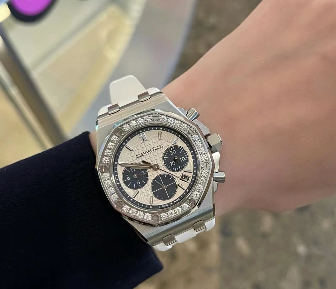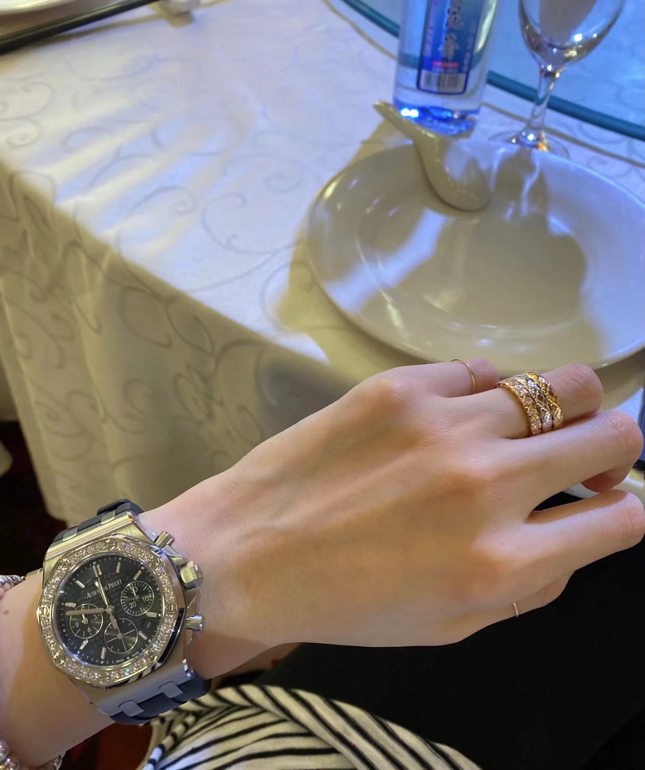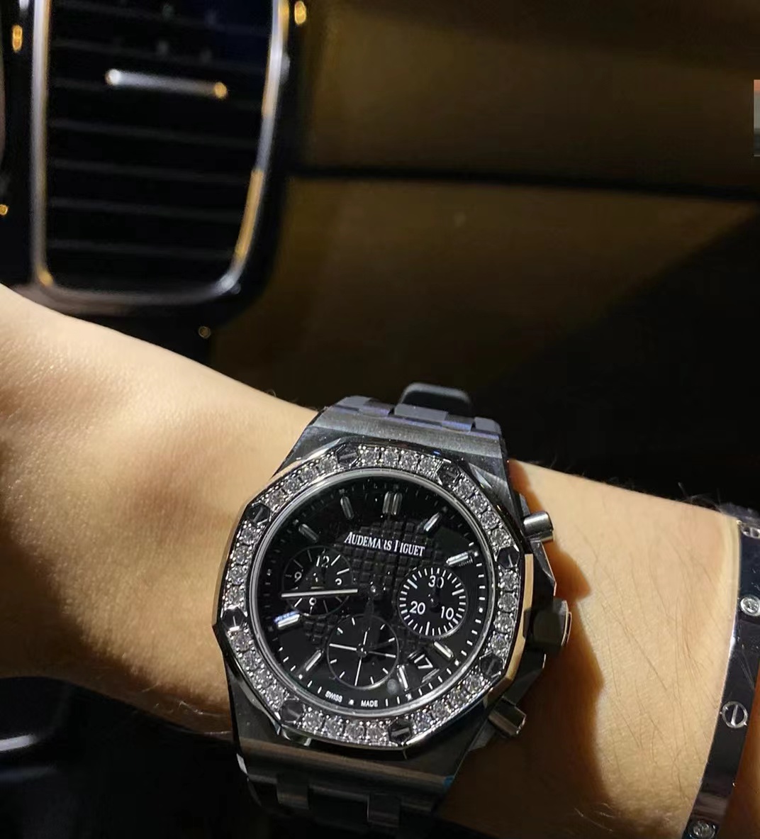 炸街款!此表在手气场全开!316L精钢表壳,圈口镶钻,蓝宝石水晶镜面,进口计时多功能机芯,双层字面双圈夜光刻度钉,原装一致。