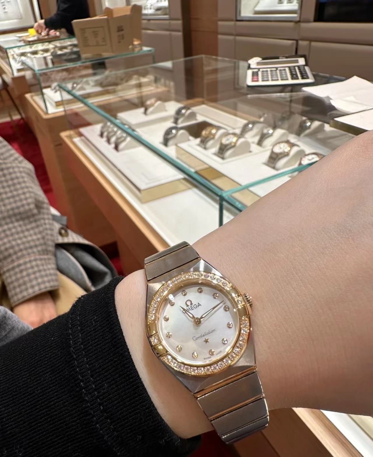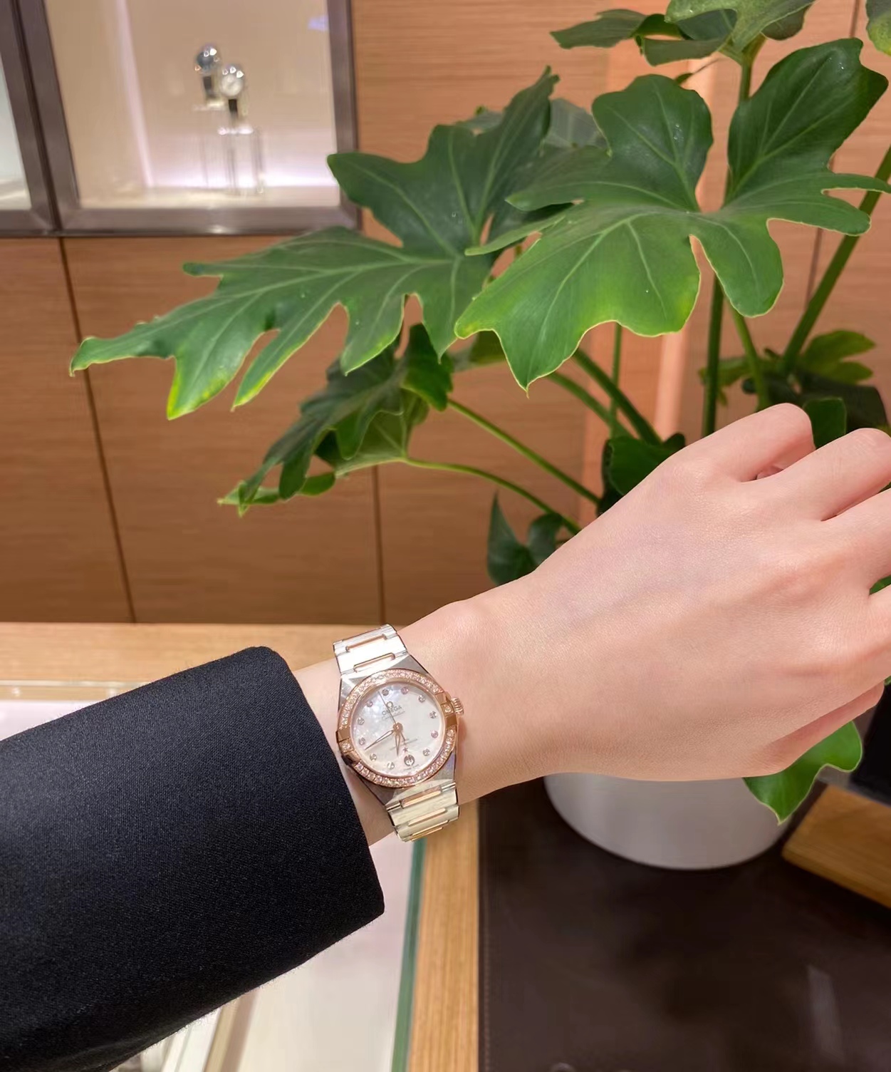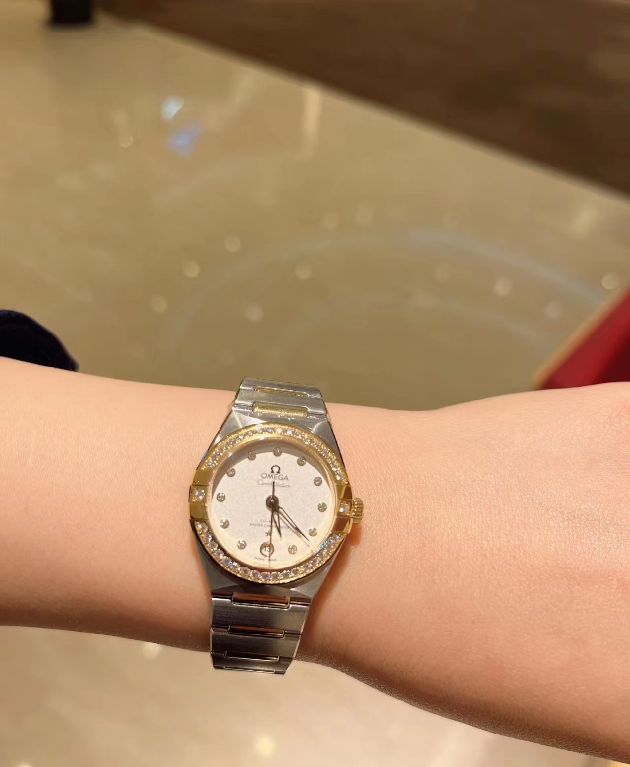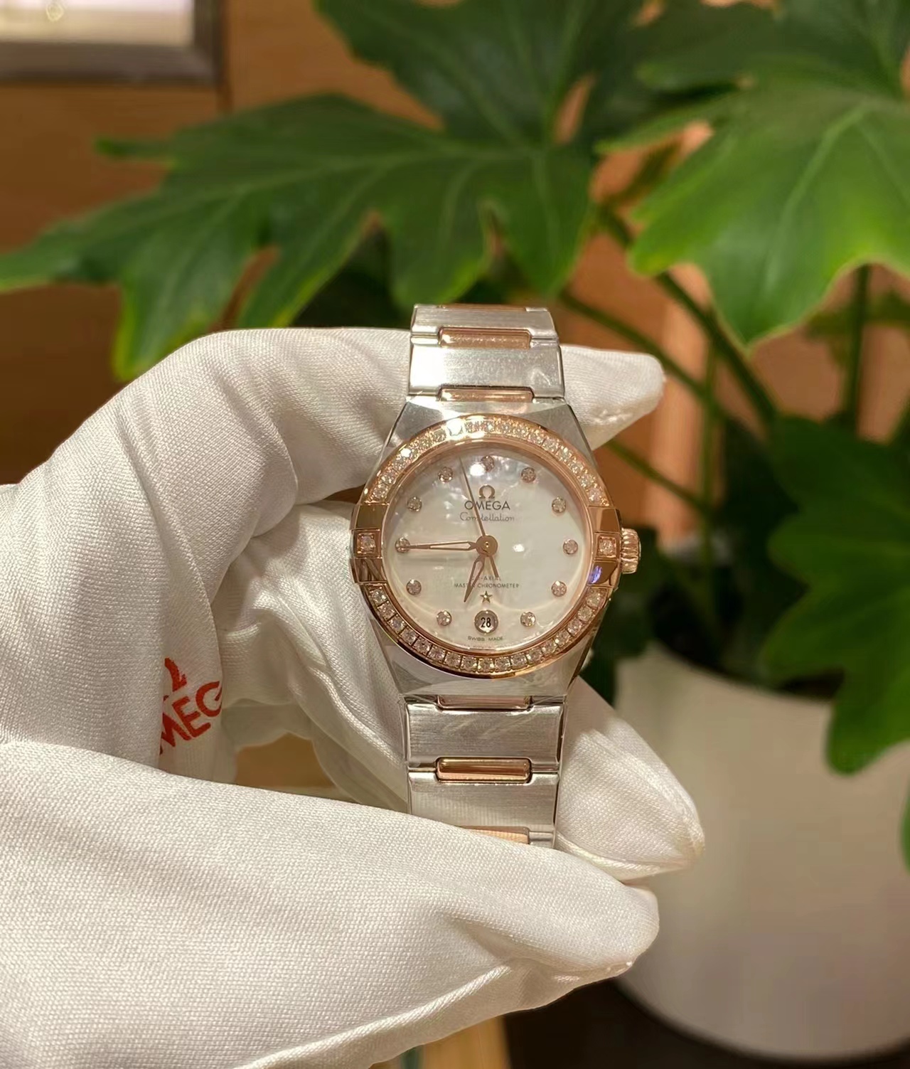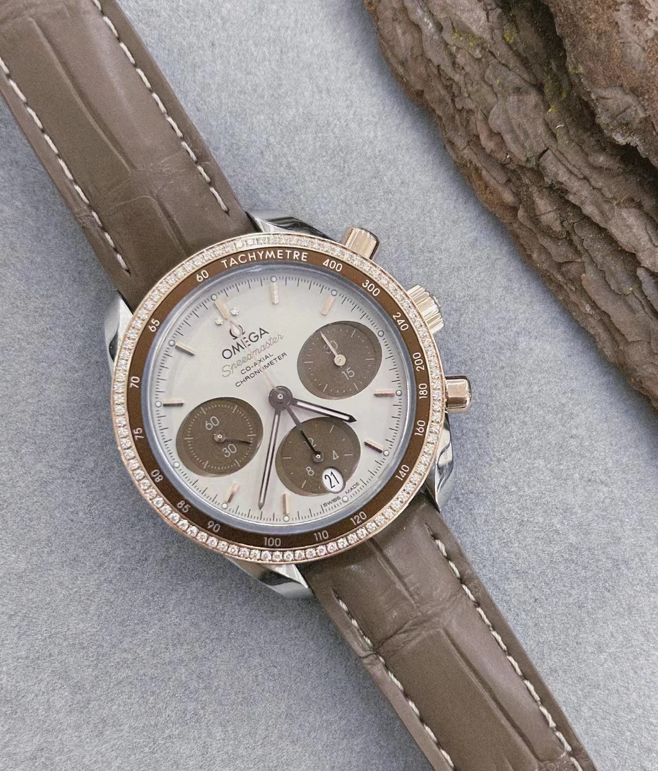 腕表在简约外观、大小以及配色上进行了精心设计,保留了欧米茄著名计时腕表一贯的内在精髓和标志性外观这款腕表采用Sedna18K镀金表壳,搭配双表圈,镶钻表圈内部搭配带有测速刻度的棕色铝质圆环。“卡布奇诺”表盘于6时位置同时设有棕色椭圆形小表盘和椭圆形日历窗口。小时刻度和指针以