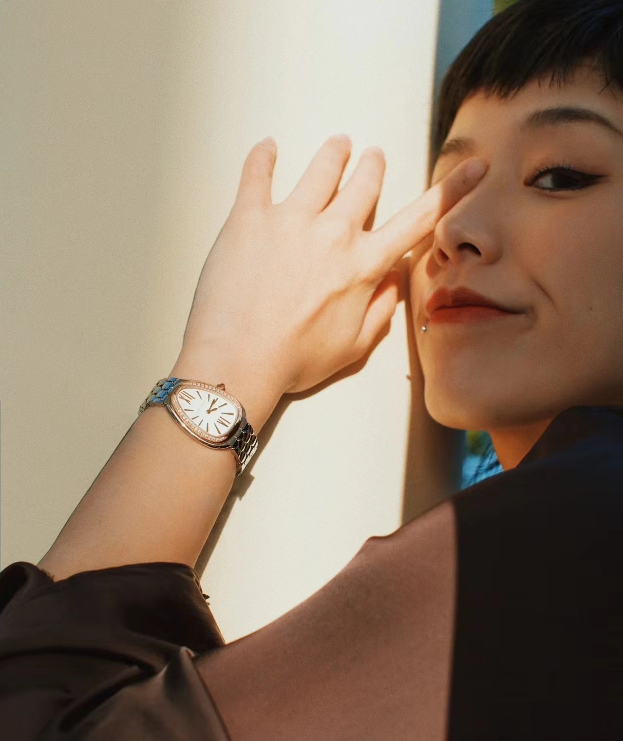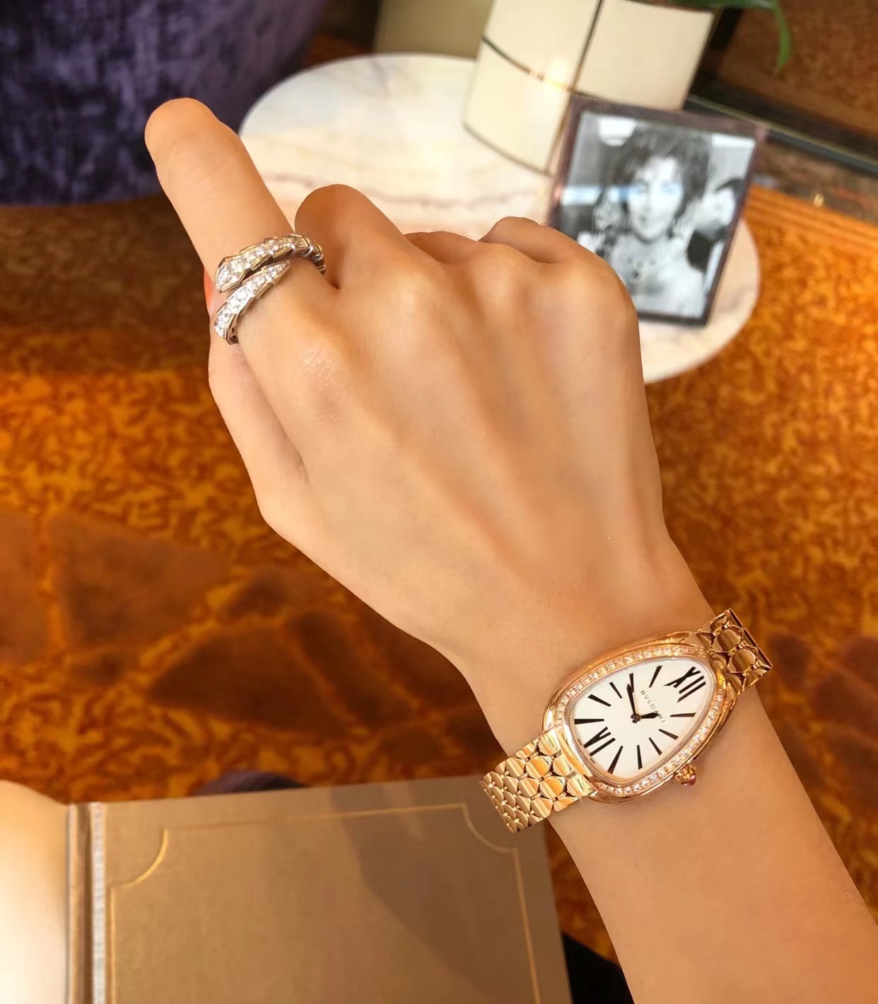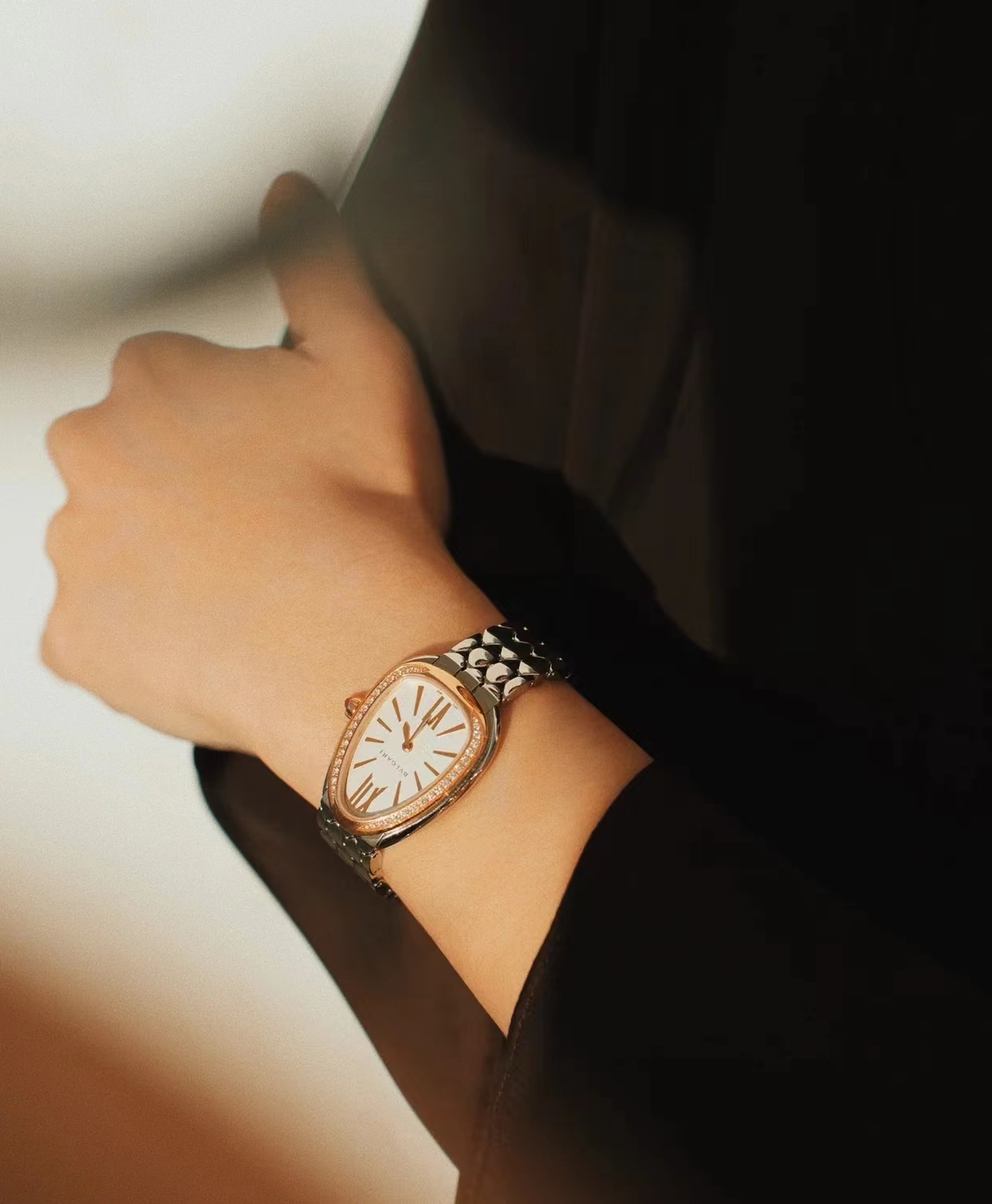 宝格丽鎏光蛇影腕表,搭载石英机芯。33毫米直径镀18K玫瑰金表壳 表圈镶嵌钻石,白银色蛋白石表盘,呈现难得一见的纤薄质感,搭配感性柔韧的表链,其六角形图案从灵蛇的鳞片中汲取设计灵感。精美的外观设计彰显高级珠宝的独特魅力。绝美!!!号称吸金招财进宝手表。