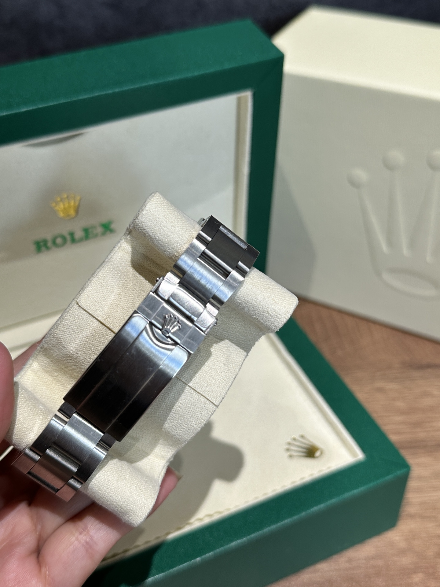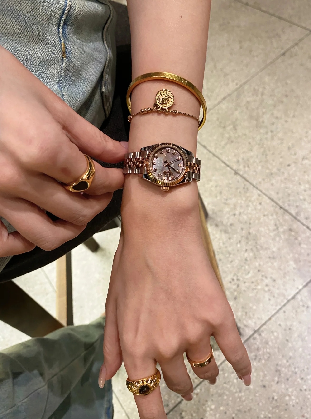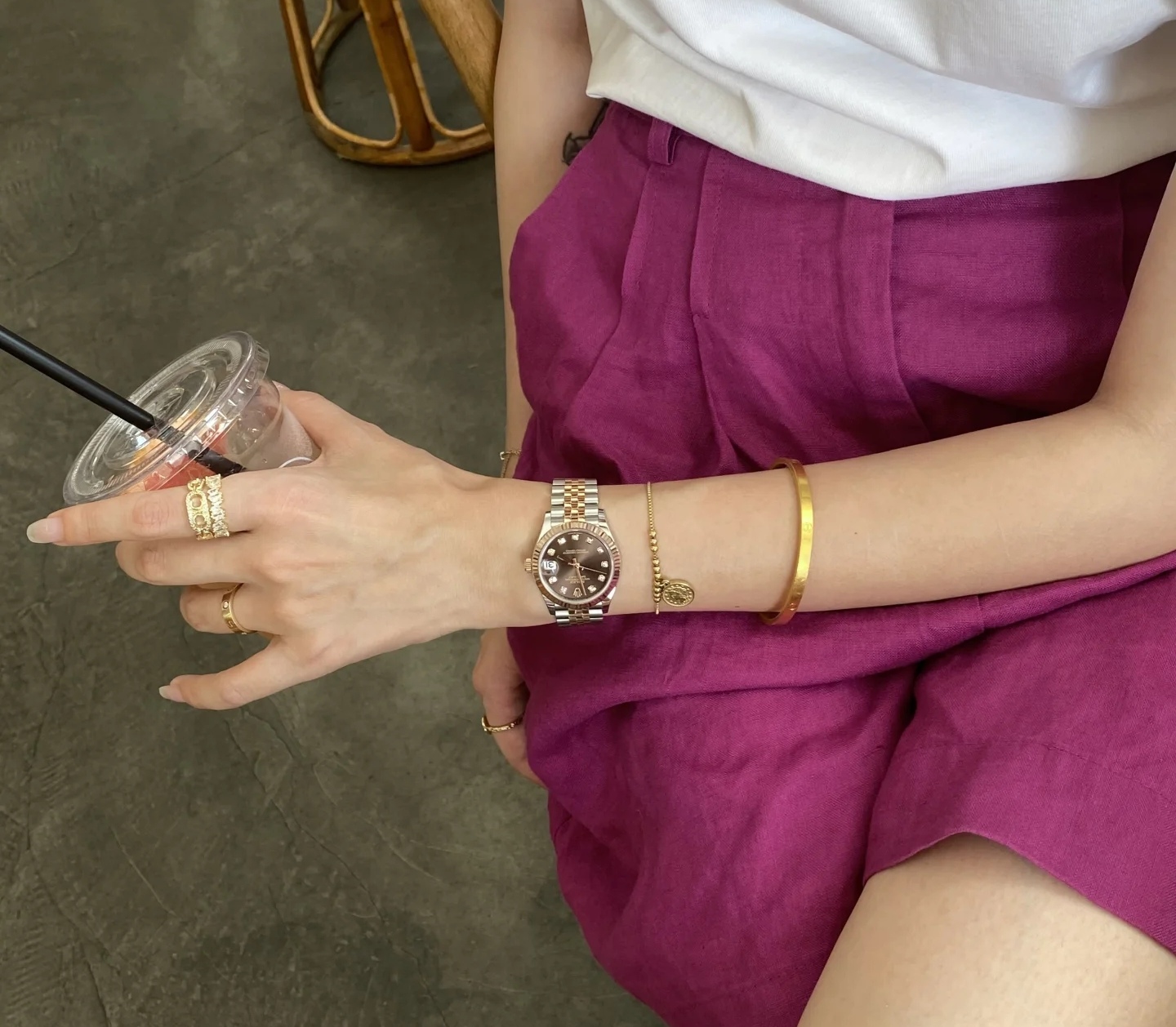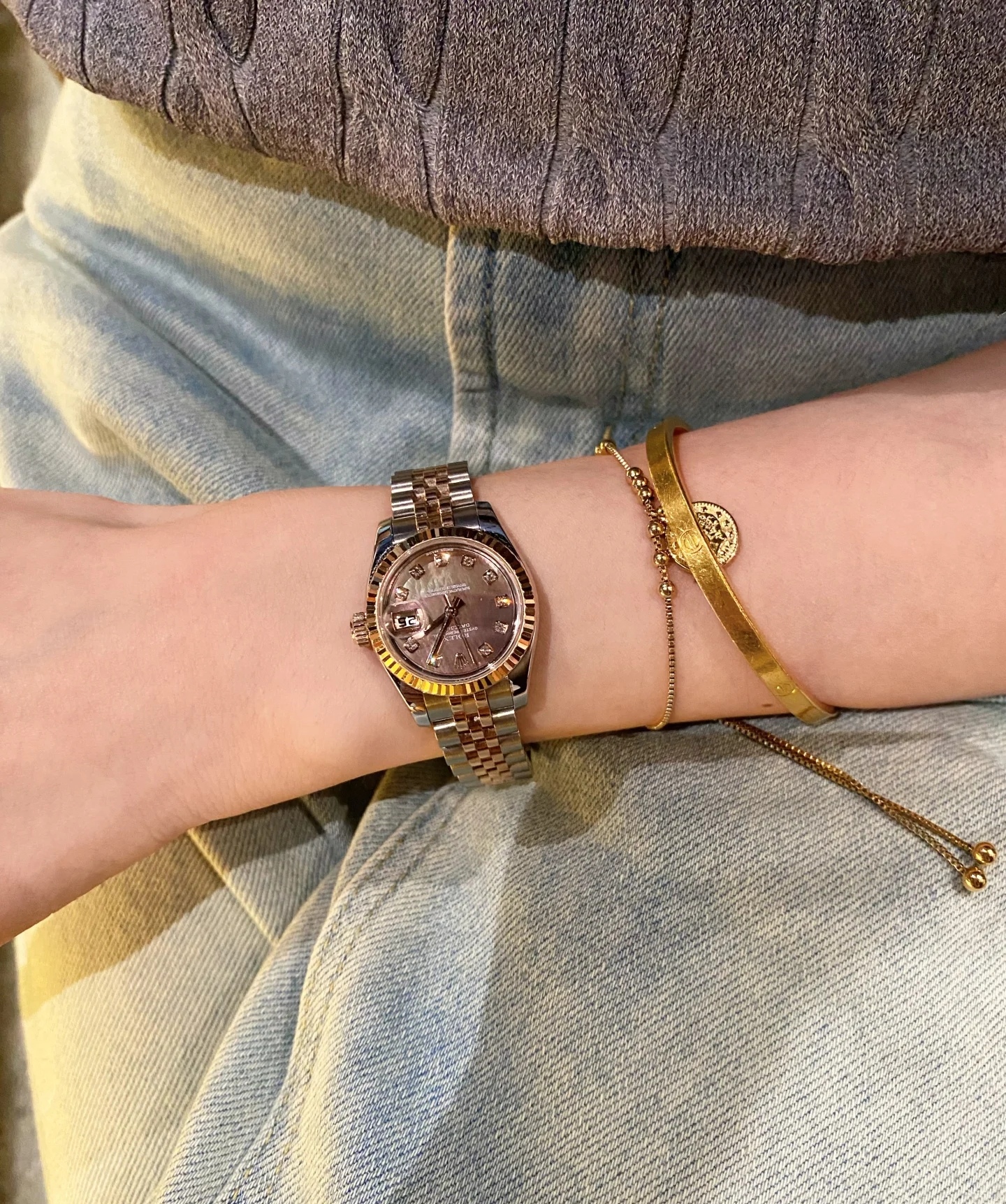 31mm永恒玫瑰金钢表壳,线条柔美,搭配五珠链带,既保留了劳力士的厚重传承,又添一抹现代女性的优雅气质。