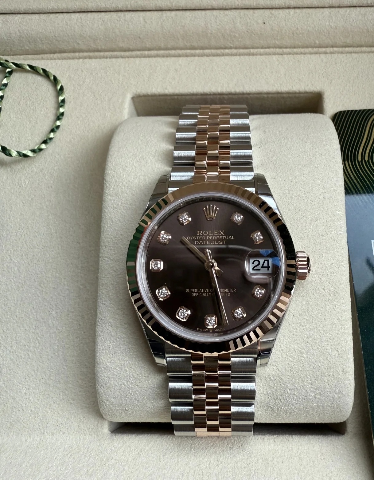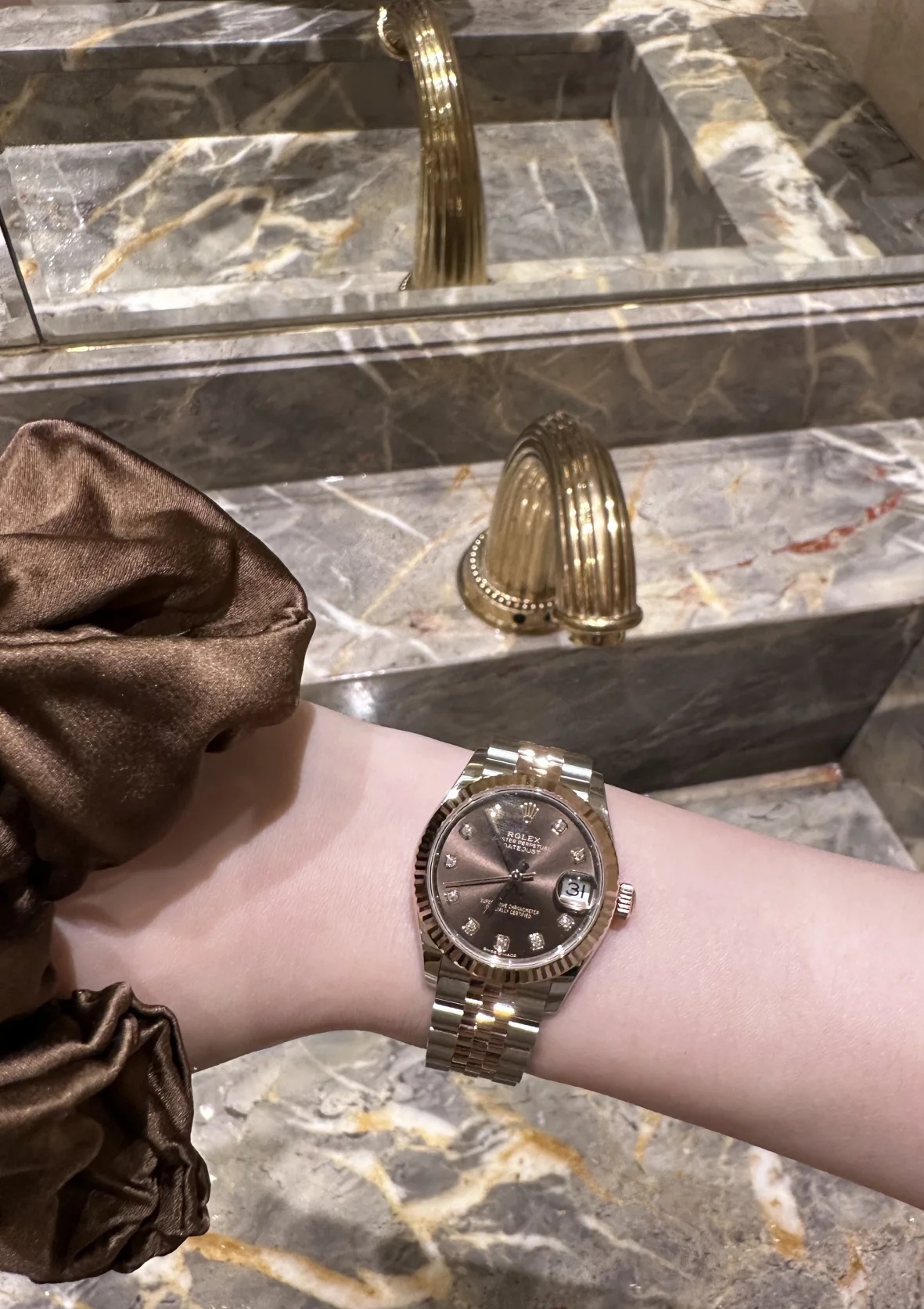 这款劳力士日志型(咖钻)堪称时间与奢华的完美结晶,以温润的咖啡色调演绎经典韵味。表盘,镶嵌璀璨钻石时标,如星河倾泻,与香槟金罗马数字交相辉映,在光影流转间折射出低调的华美。
