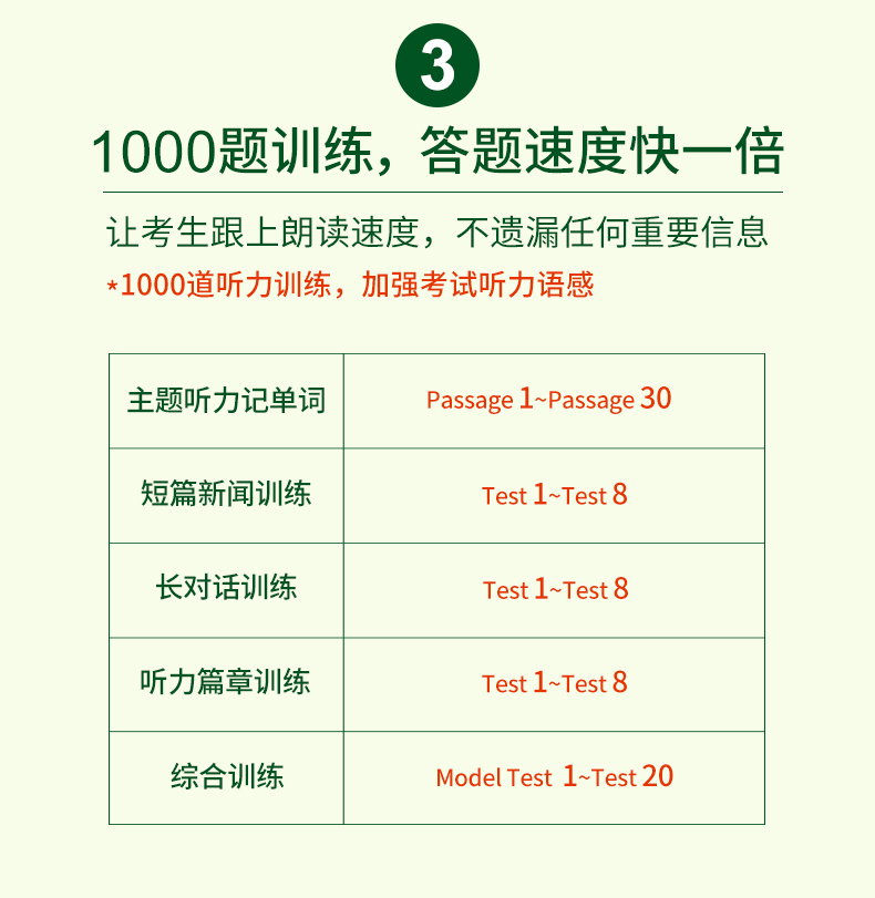 1. 新闻听力8套专项训练+听力长对话8套+听力篇章8套+20套新题型综合模拟训练;