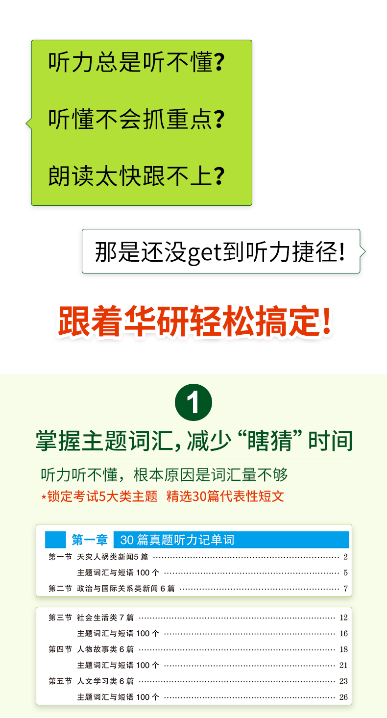 2. 强化英语四级词汇,30篇主题听力记四级单词,总结大学英语四级听力主题词汇与短语;