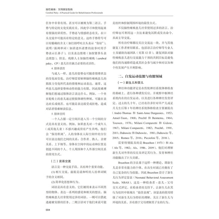 本书引进自 Springer 出版社,由资深脑性瘫痪康复治疗专家 Psiche Giannoni 和Liliana Zerbino 精心编撰,由国内重庆医科大学附属儿童医院的一线临床专家共同翻译打造。书中所述全面涵盖了脑性瘫痪康复治疗的各个方面,不仅系统介绍了脑性瘫痪患儿的系统评定,还对单 / 双侧痉挛、不自主运动及共济失调等各型脑性瘫痪进行详实的康复治疗计划建议。本书不仅分类总结了此类患者的感知觉障碍、吞咽障碍、视力障碍等问题,并针对脑性瘫痪患者的软组织康复、上下肢功能障碍提供了康复治疗方案,还对患者功能障碍的辅助沟通和新的康复治疗技术进行了推荐。本书内容翔实全面,图文并茂,可操作性强,可作为从事脑性瘫痪治疗专业人员的实用执业参考。