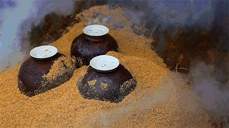 炙酒 |先封住坛口,再覆上草皮土坯,坛子四周拢上谷壳,阴火炙烤数小时。多了这一步,酒中的湿气被去掉,味道会更加醇厚清甜。