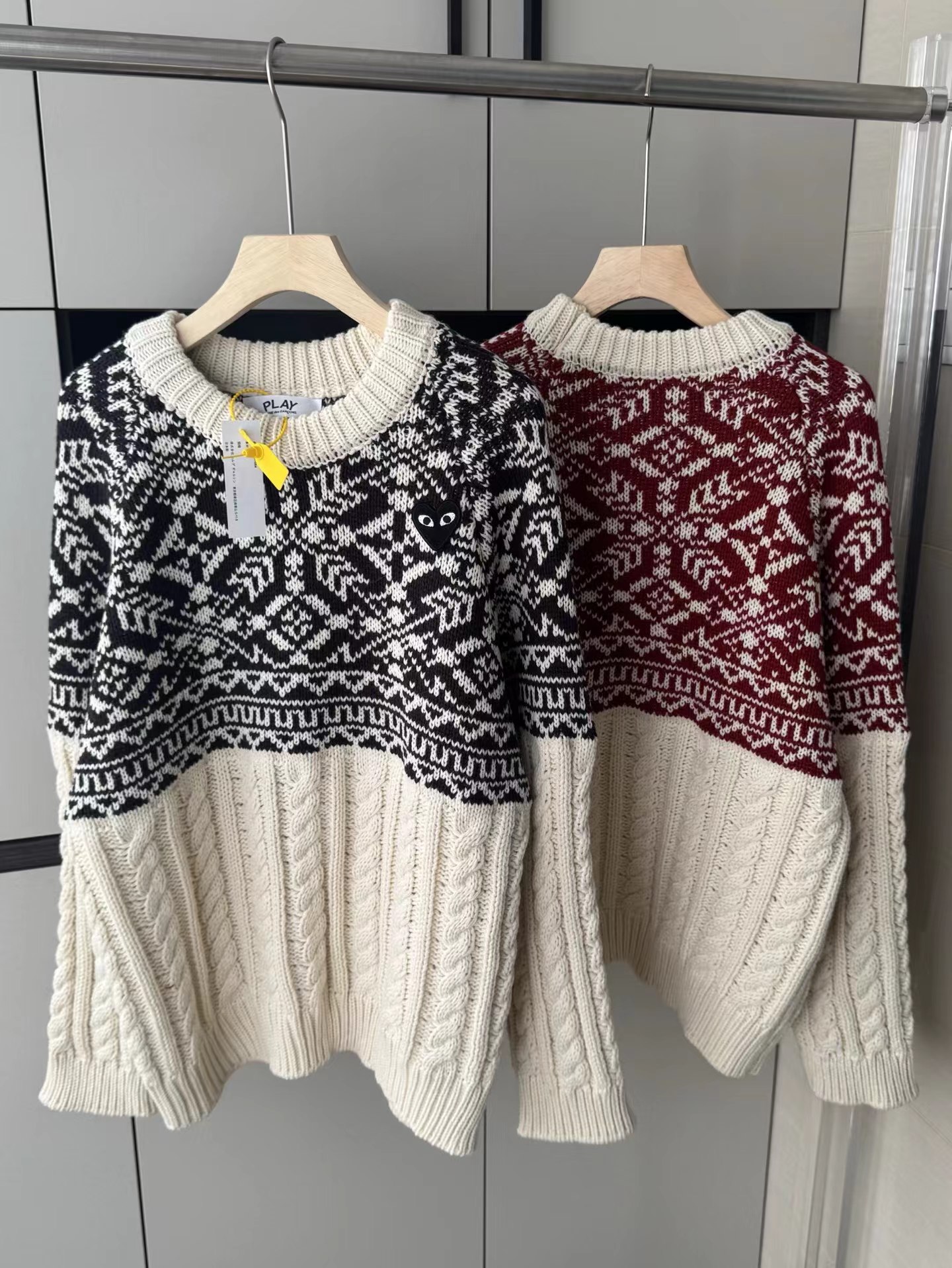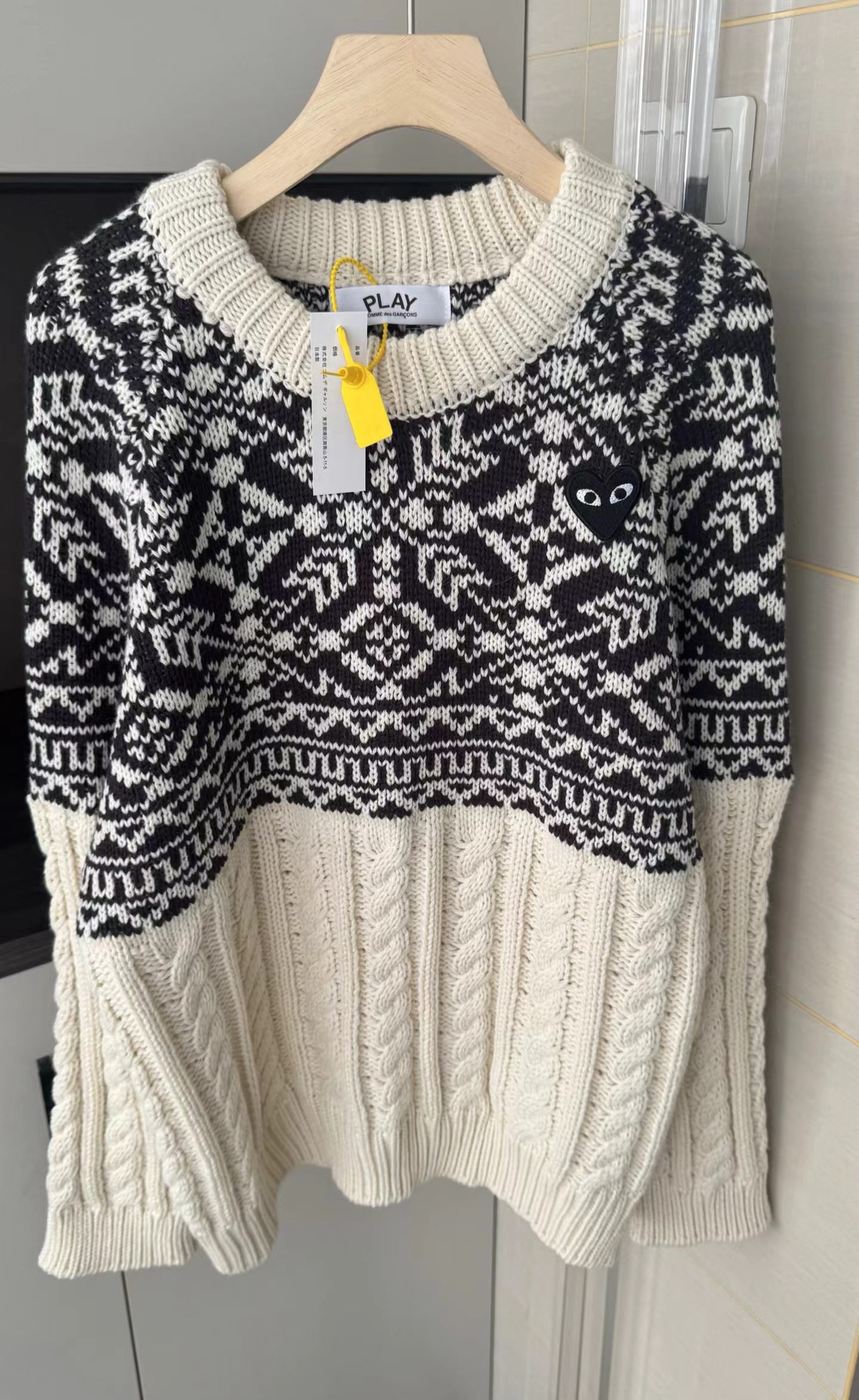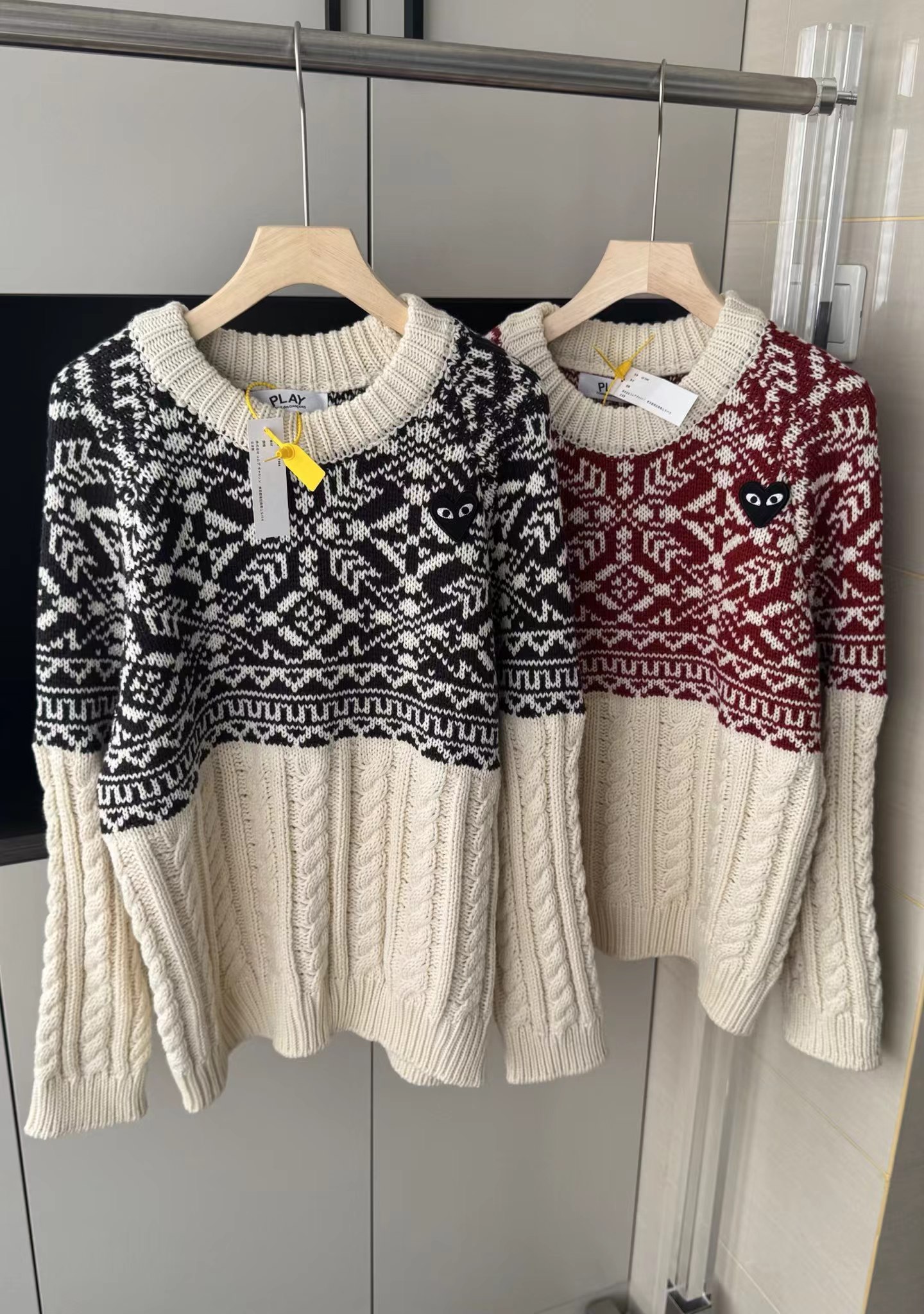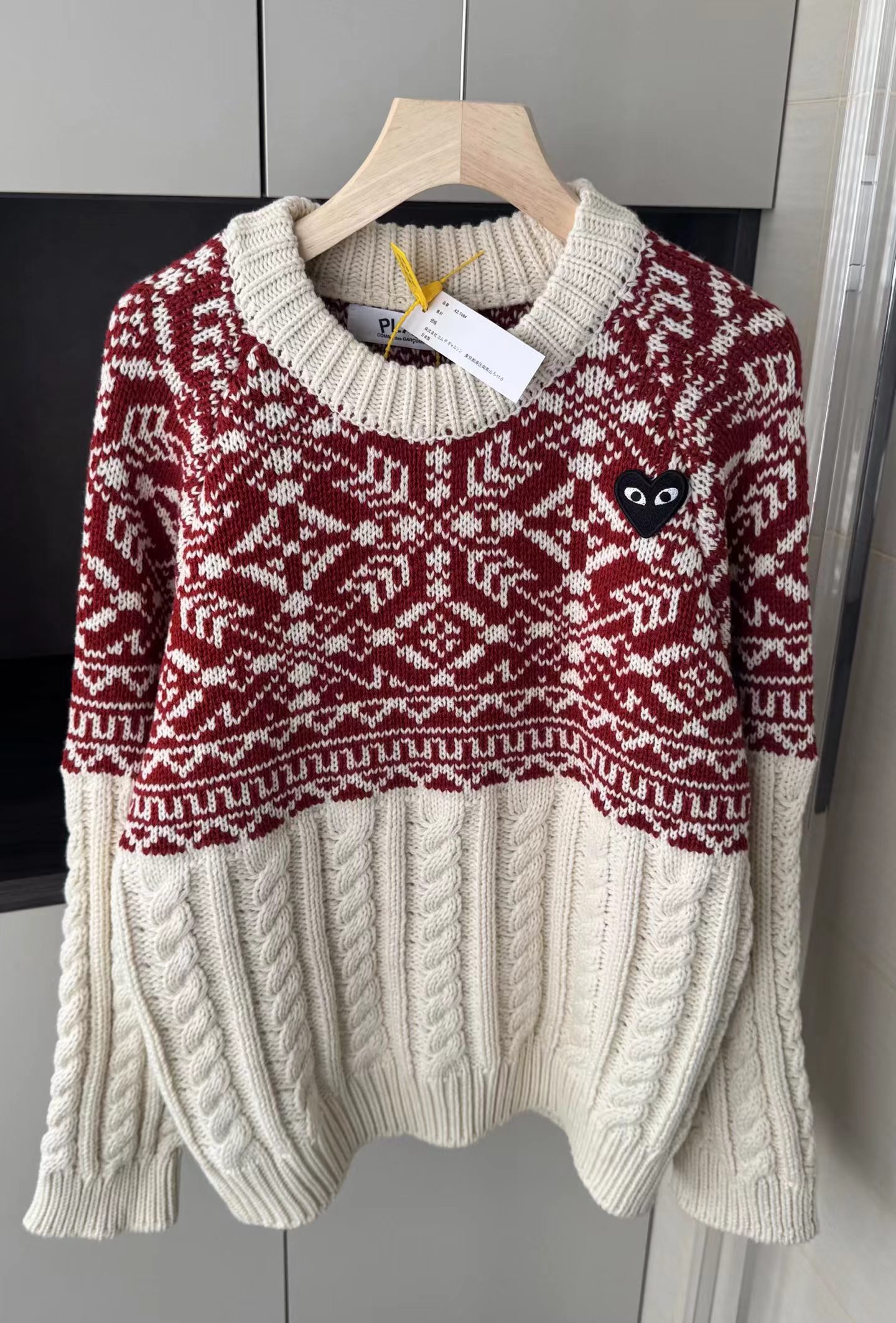 费尔岛花纹麻花毛衣基础圆领版型,领围贴合颈部不紧绷,适配各种内搭;衣身采用短款剪裁,拉高腰线,搭配下装可打造三七分比例;落肩灯笼袖设计,弱化肩线,对各种肩型都有包容度。衣身主体为立体麻花针织纹理,胸前及肩部拼接精典费尔岛黑白提花纹样,撞色设计打破单调,增添北欧复古氛围,花纹处还点缀小巧的爱心刺绣,提升细节jing致感。选用软糯的羊毛混纺针织面料,含绒量高,触感蓬松亲肤,保暖性优于普通针织衫;面料带有适度弹性,穿着无束缚感,且不易起球变形,耐穿性强。整体风格融合复古休闲与甜酷少女感,可单穿搭配黑色百褶裙、牛仔裤,打造韩系日常穿搭;也可内搭高领打底,外搭大衣或羽绒服,作为秋冬叠穿的核 心单品,适配校园、通勤、出游等多种场景。