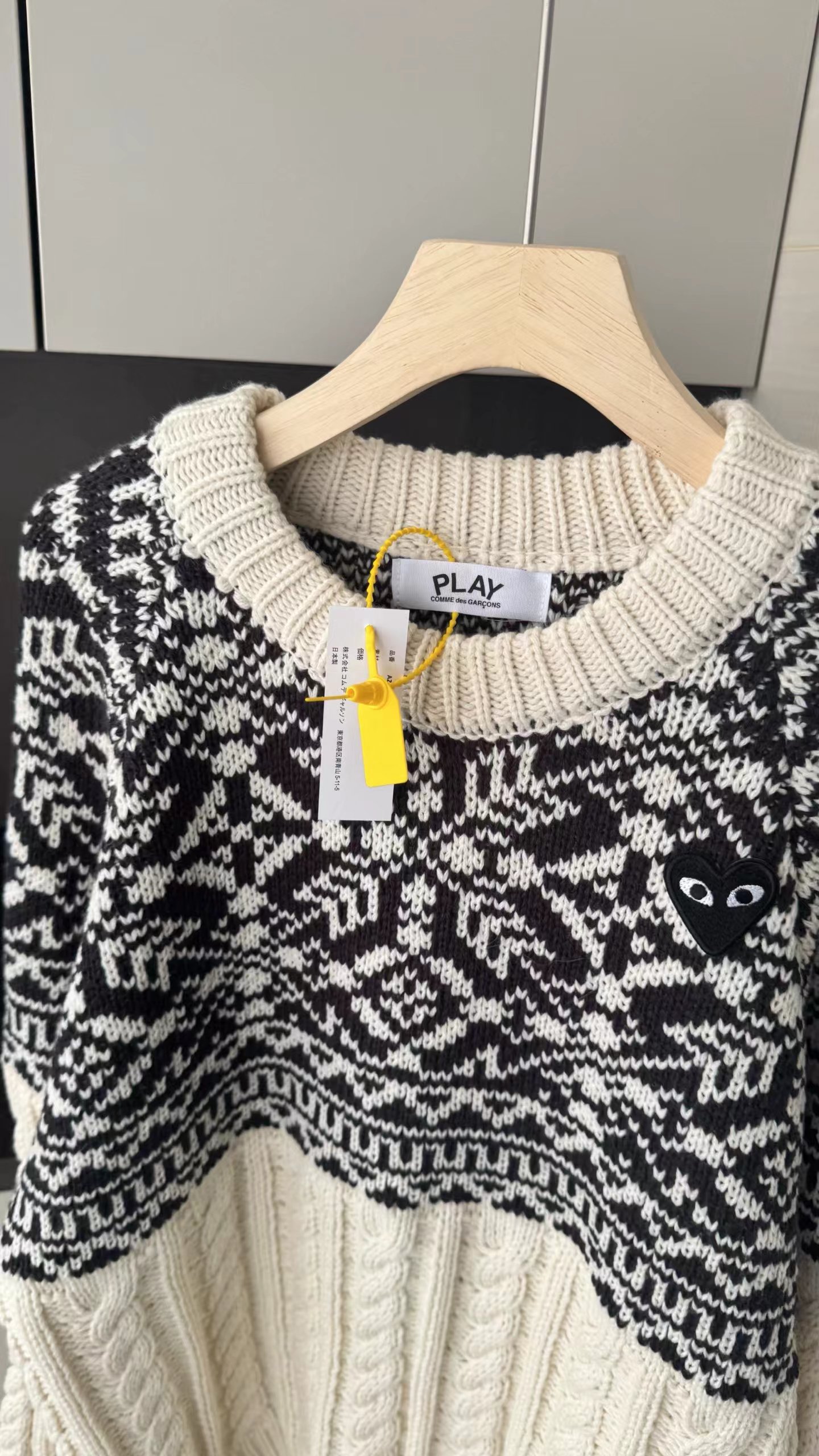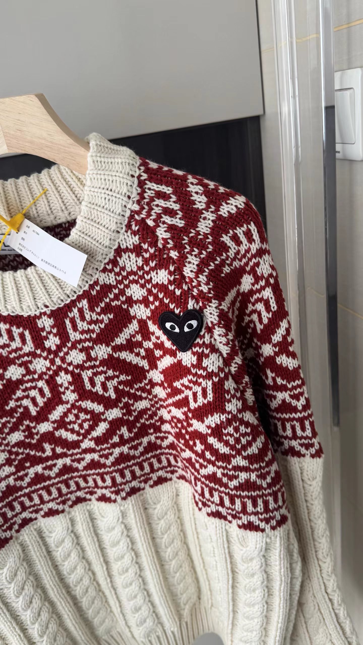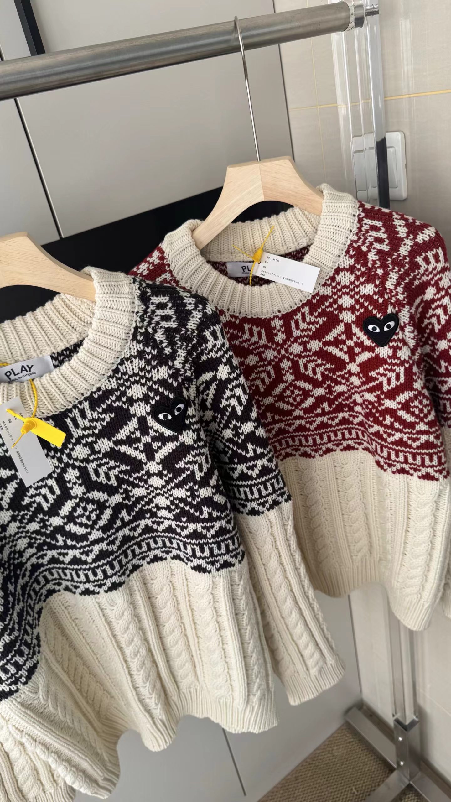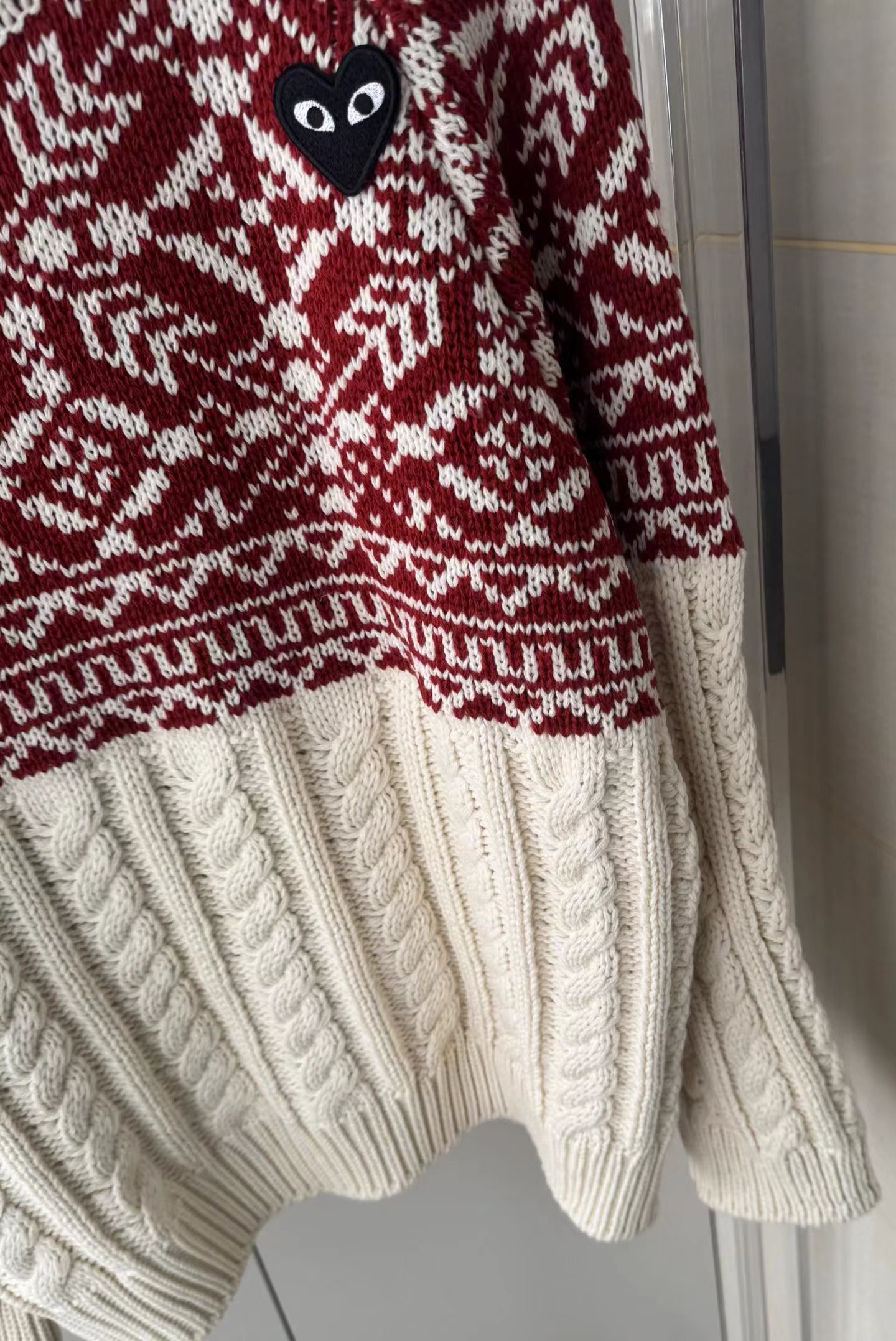 费尔岛花纹麻花毛衣基础圆领版型,领围贴合颈部不紧绷,适配各种内搭;衣身采用短款剪裁,拉高腰线,搭配下装可打造三七分比例;落肩灯笼袖设计,弱化肩线,对各种肩型都有包容度。衣身主体为立体麻花针织纹理,胸前及肩部拼接精典费尔岛黑白提花纹样,撞色设计打破单调,增添北欧复古氛围,花纹处还点缀小巧的爱心刺绣,提升细节jing致感。选用软糯的羊毛混纺针织面料,含绒量高,触感蓬松亲肤,保暖性优于普通针织衫;面料带有适度弹性,穿着无束缚感,且不易起球变形,耐穿性强。整体风格融合复古休闲与甜酷少女感,可单穿搭配黑色百褶裙、牛仔裤,打造韩系日常穿搭;也可内搭高领打底,外搭大衣或羽绒服,作为秋冬叠穿的核 心单品,适配校园、通勤、出游等多种场景。