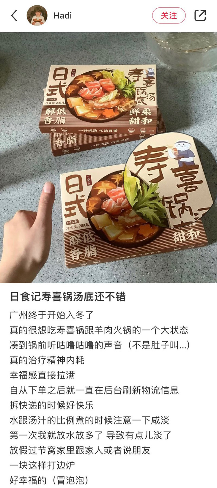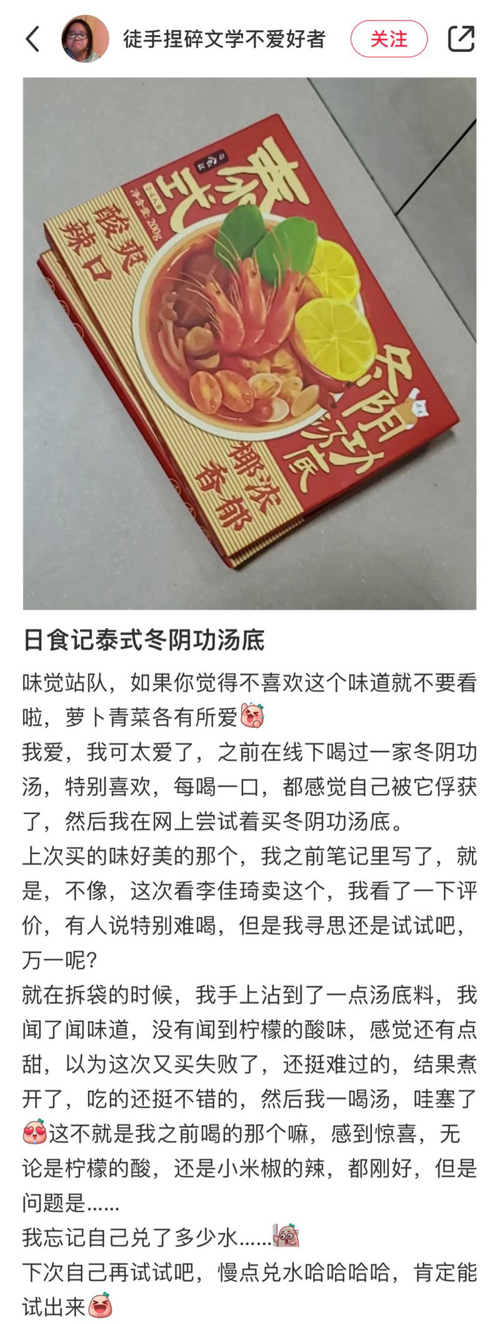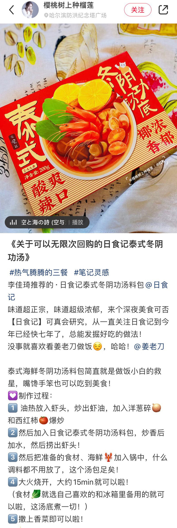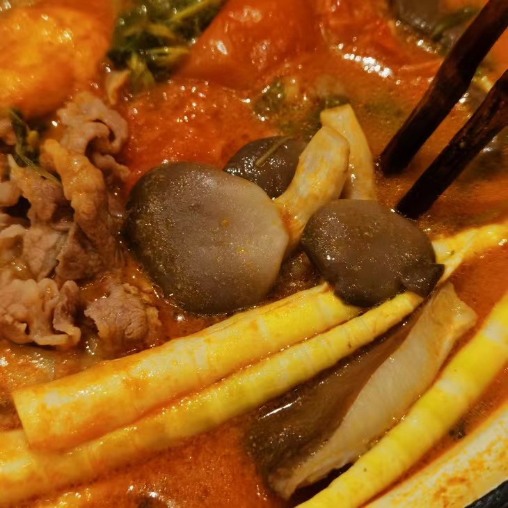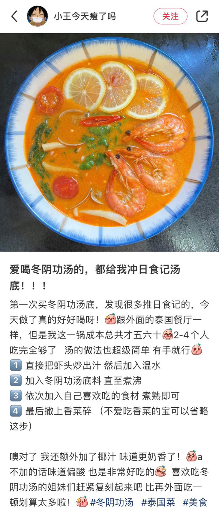 日食记强推的是泰式冬阴功汤底,不像别家用水或者香味剂,配料表D一位是印尼椰浆,再加上猪大骨汤底+番茄打底熬煮,配合云南香茅草、鱼露、青柠汁和小米辣等等多种香料调味,可以煮点大虾,沙白,菌菇和蔬菜,汤头浓郁,异域风味十足!感冒或者没胃口时,真,一碗回魂!还可以拿来煮面,捞饭、炒空心菜,甚至还能调一杯冬阴功鸡尾酒,看大家手艺啦!