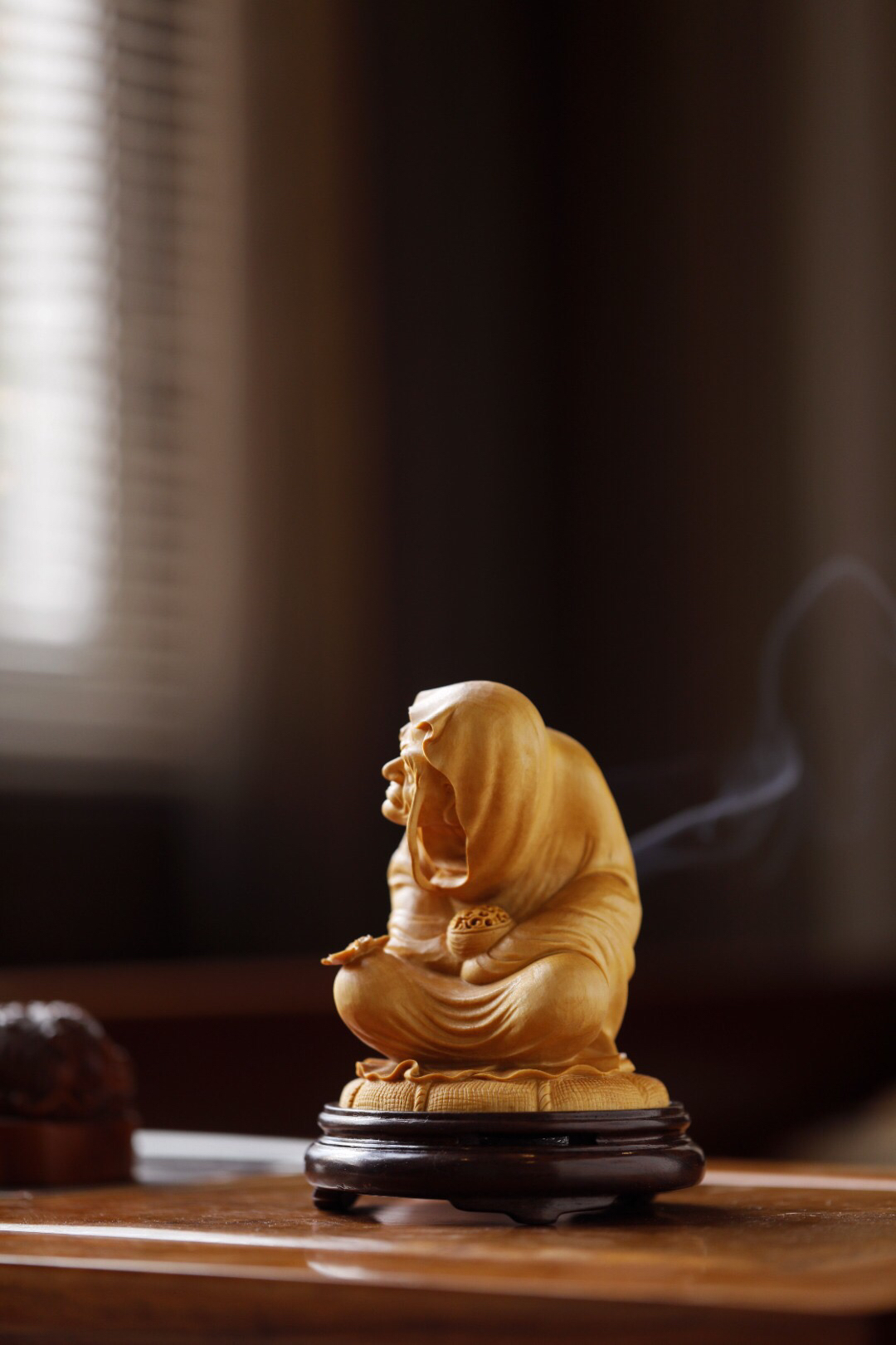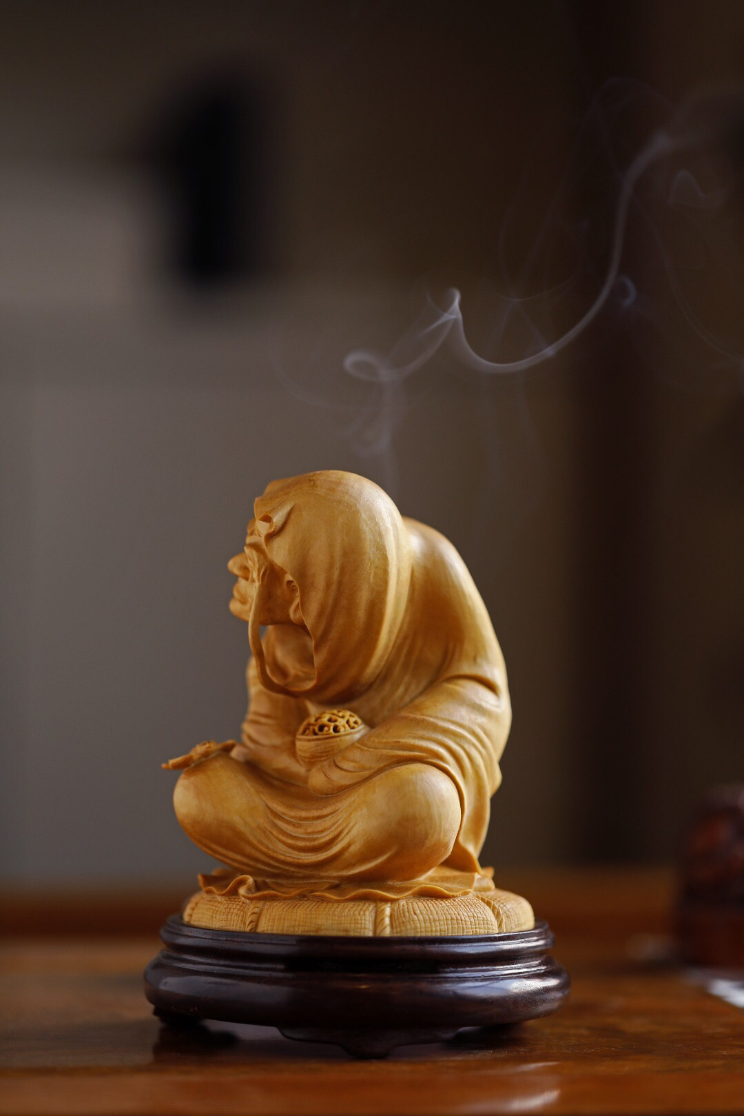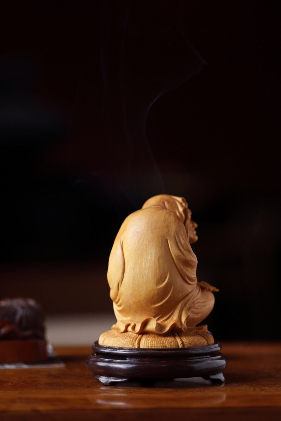 罗汉盘腿冥想,神情安逸,细节拉满💯 点香时,青烟袅袅从罗汉身旁飘出,氛围感直接拉满,