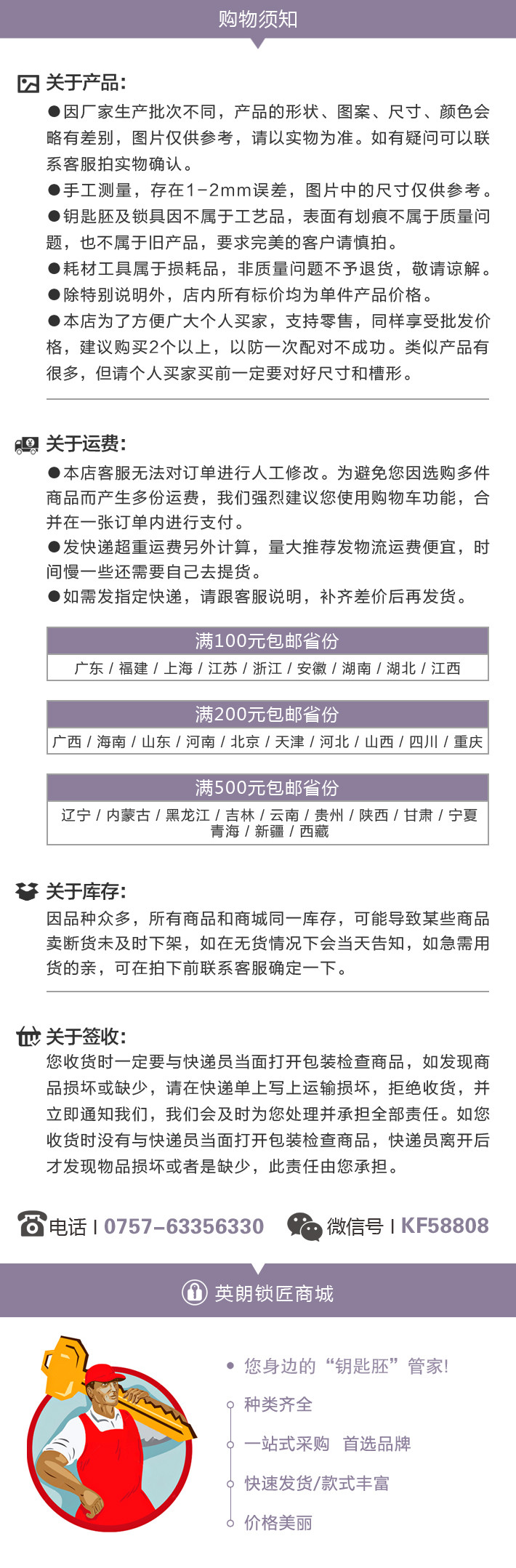 销售各种钥匙胚、锁具、锁芯、锁体、拉手、交通锁、指纹锁、锁匠工具、配匙机及配件、遙控器、拷贝机、门禁卡、钥匙扣等等锁匠用品。