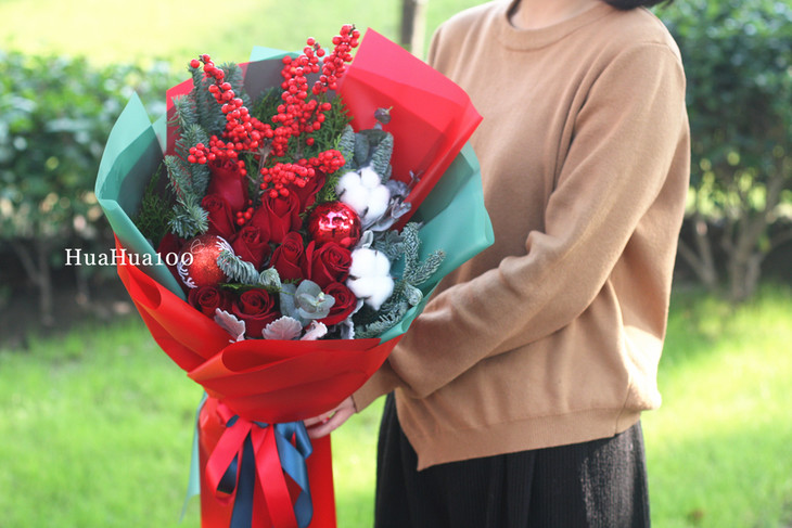 主花:11朵红玫瑰 、进口冬青 、进口诺贝松、棉花2朵