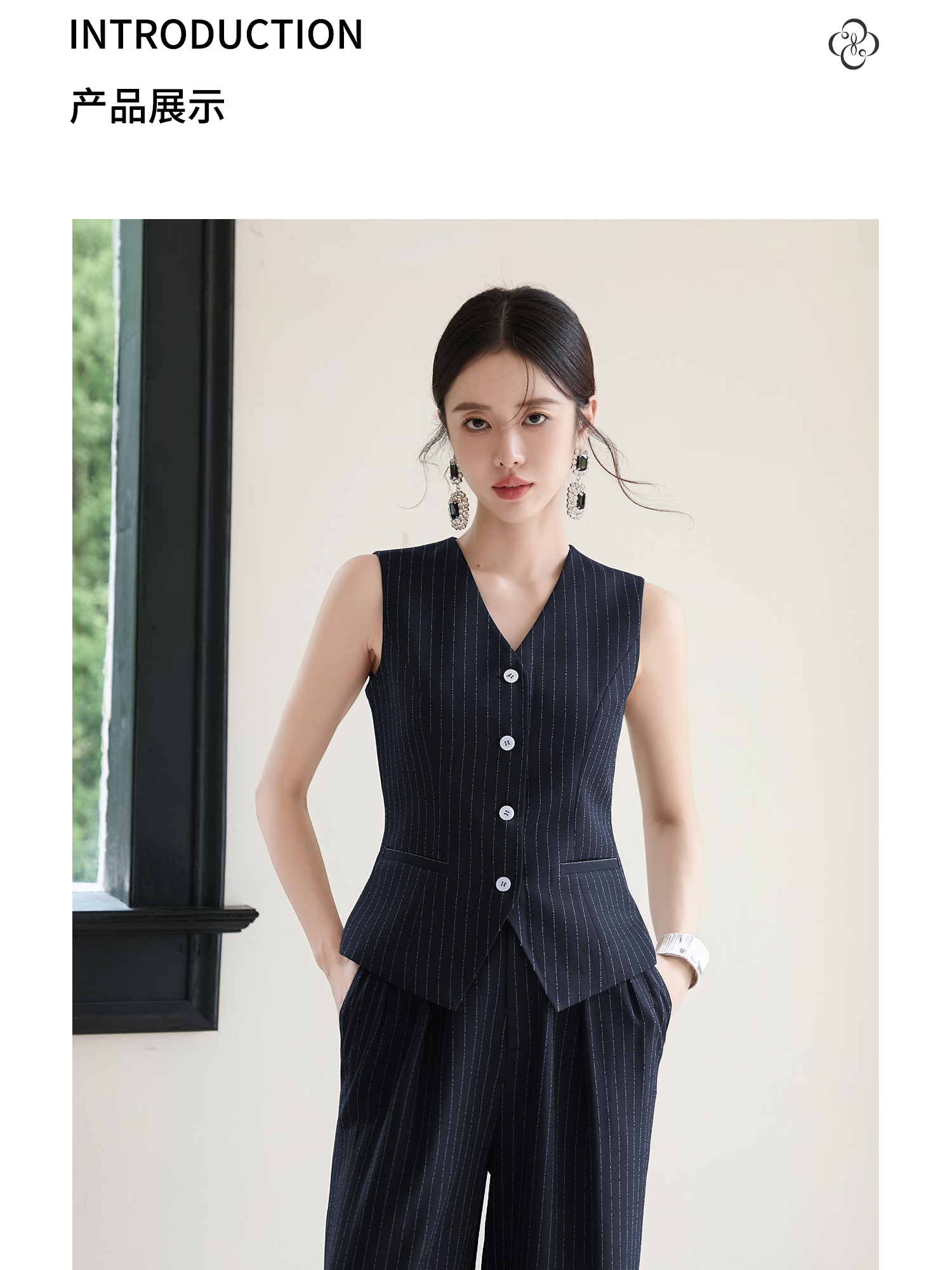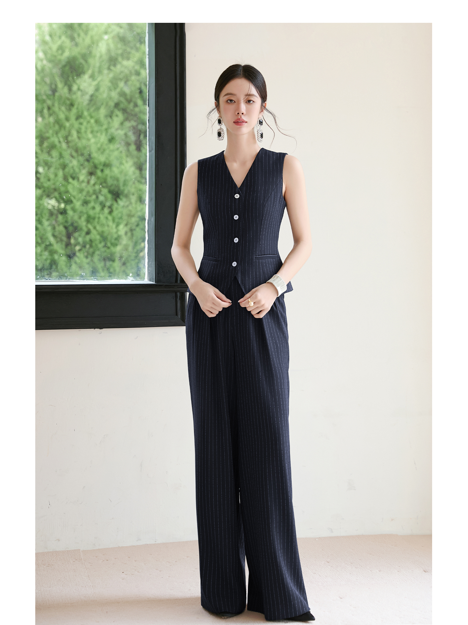 FUYAO扶摇 藏青色条纹西装马甲女秋冬新款复古叠穿无袖背心上衣