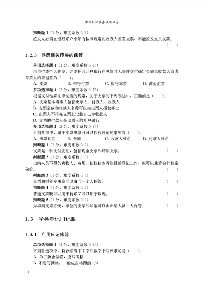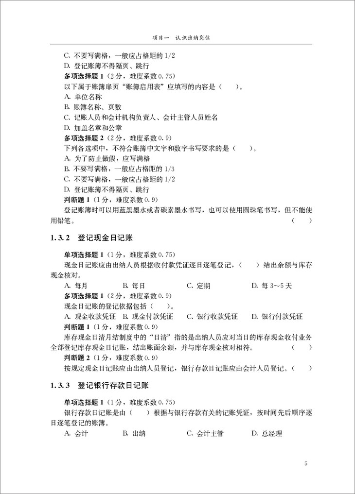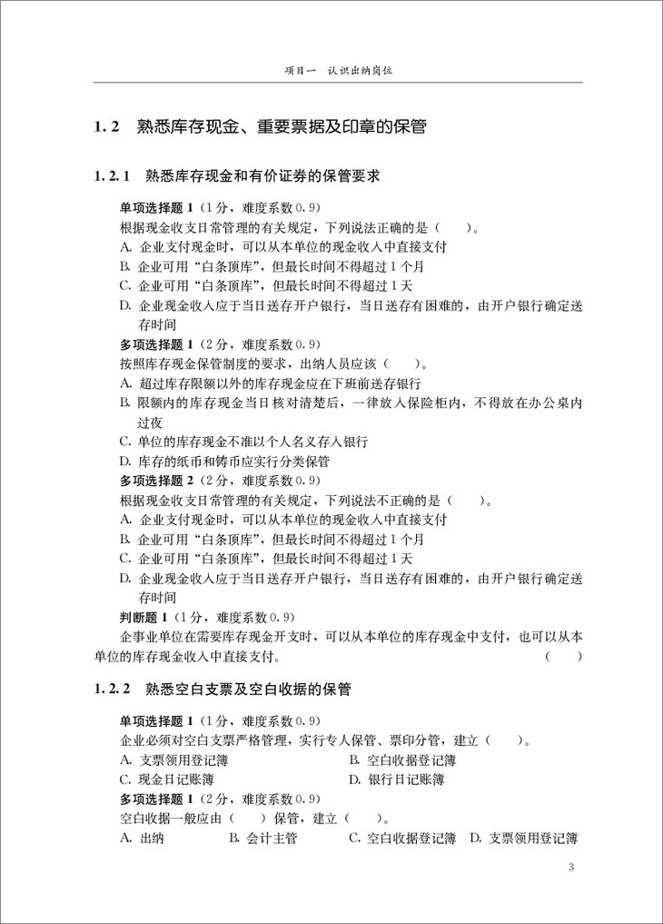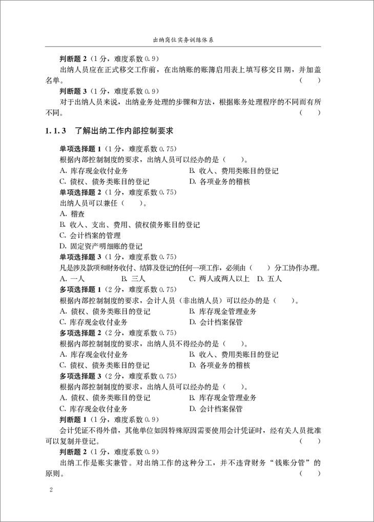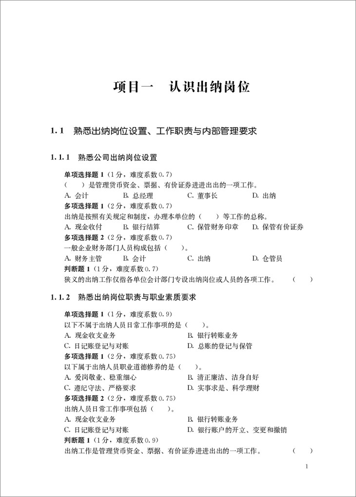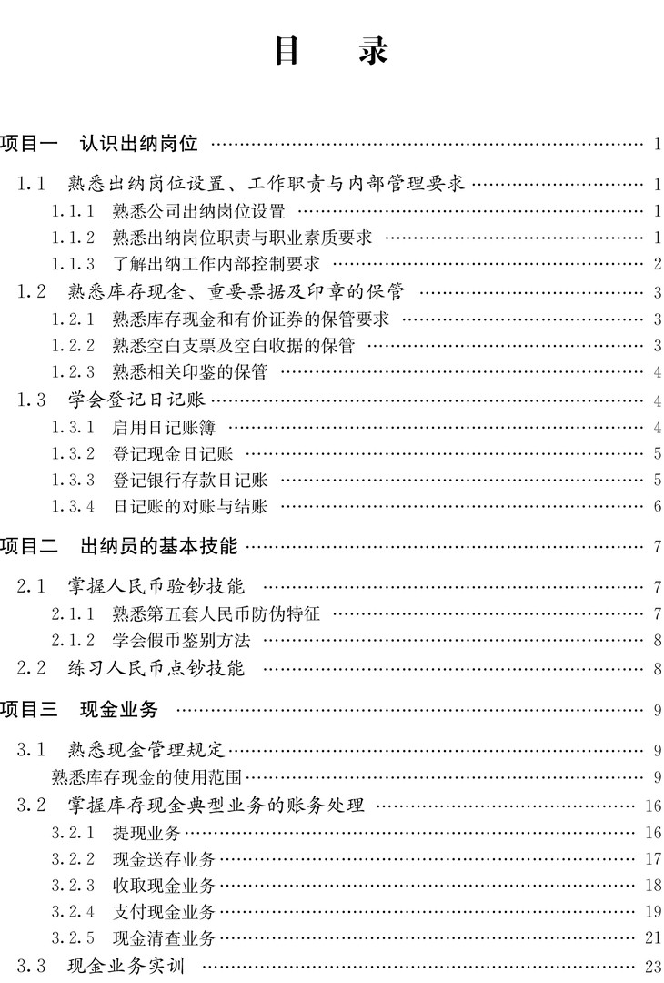 本书内容包括:认识出纳岗位,出纳员的基本技能,现金业务,银行存款业务,银行账户的开立 与撤销,出纳员工作交接等。本书按照教材的项目顺序,以知识点为单位进行编写,每个知识点练习 题分为单项选择题、多项选择题、判断题、实训题四种题型,标明了难度系数,并配备了综合测试题。