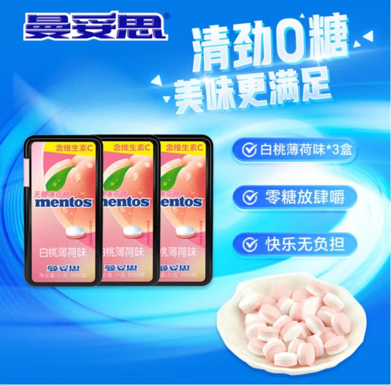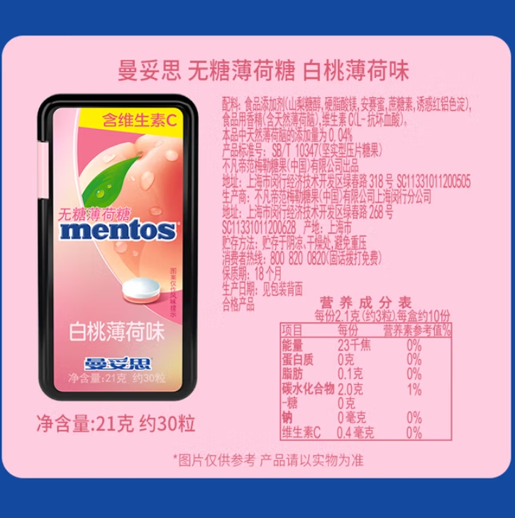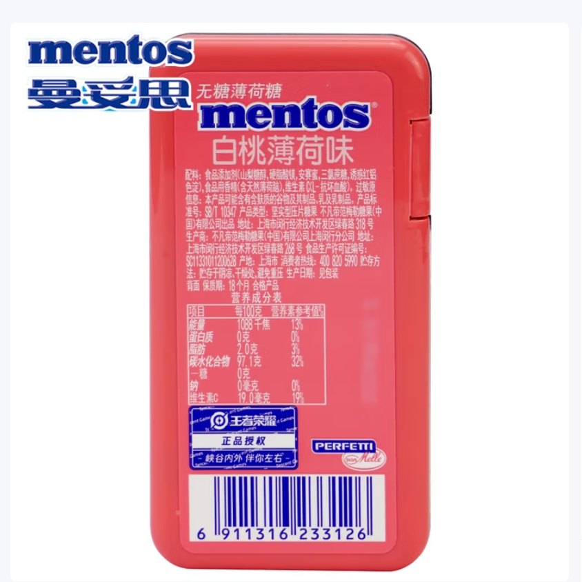 曼妥思(白桃味)无糖薄荷糖盒装21g