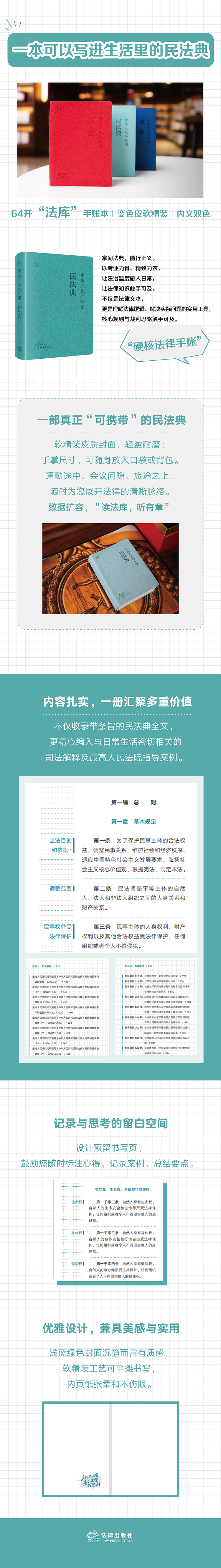 当法典褪去厚重的壳,化身掌间一抹静谧的浅蓝绿;当严谨的法条与生活的笔迹相遇,成为随时可翻阅的智慧陪伴——诚意向您呈现这部打破传统的法律读本:64开《中华人民共和国民法典》便携手账本,一本可握于掌心的法律宝典,一本可书写心事的实用手账。