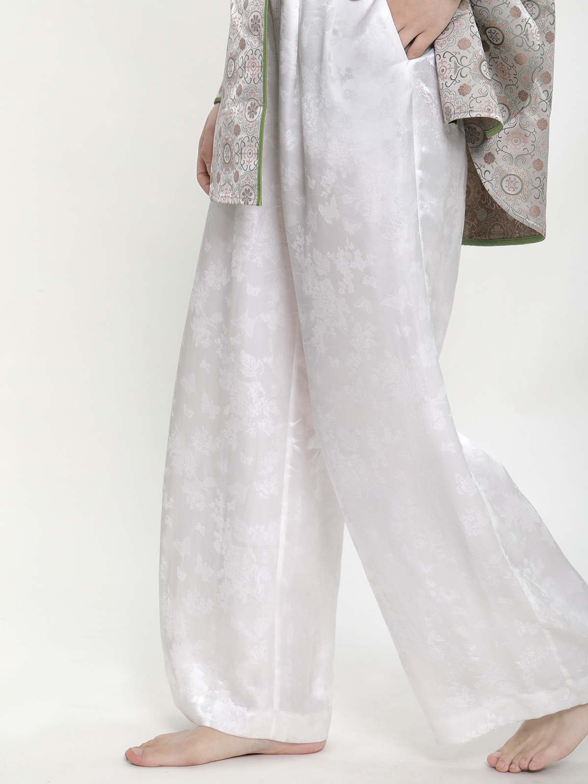 瑕疵|盛唐牡丹 |真丝提花阔腿裤珍珠白平腰版 (蝶恋花纹样)[特价品](特殊商品不退不换)