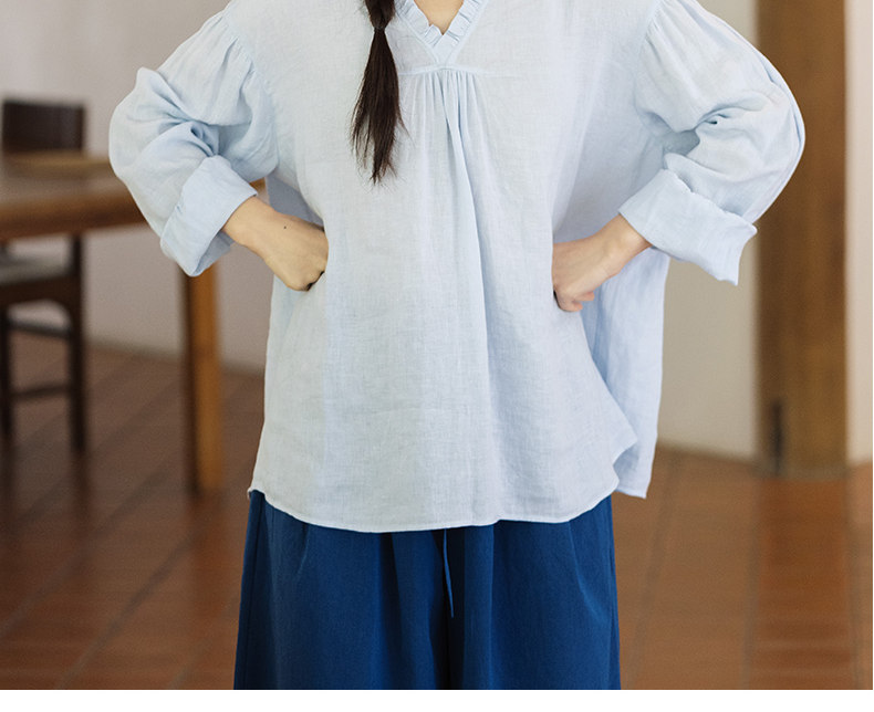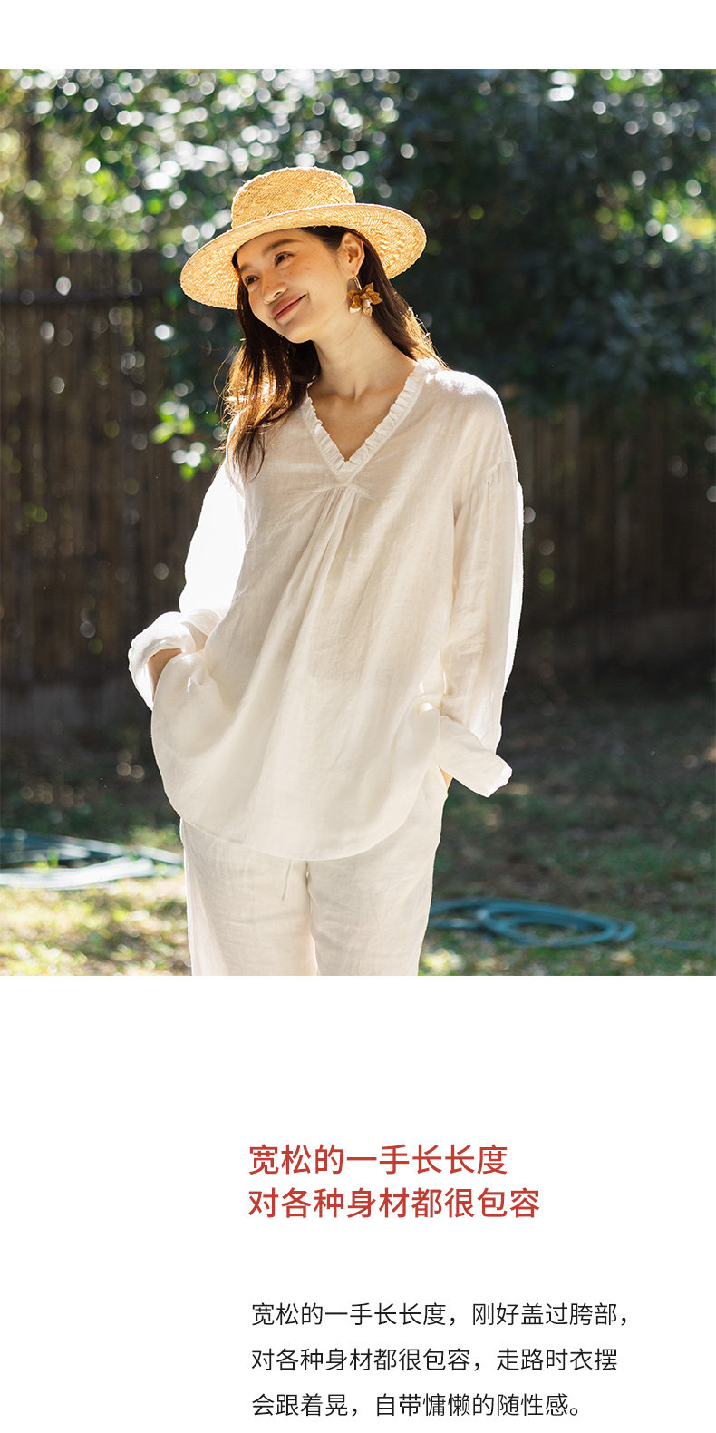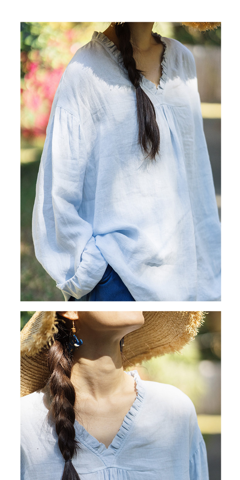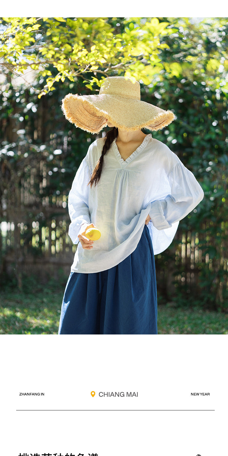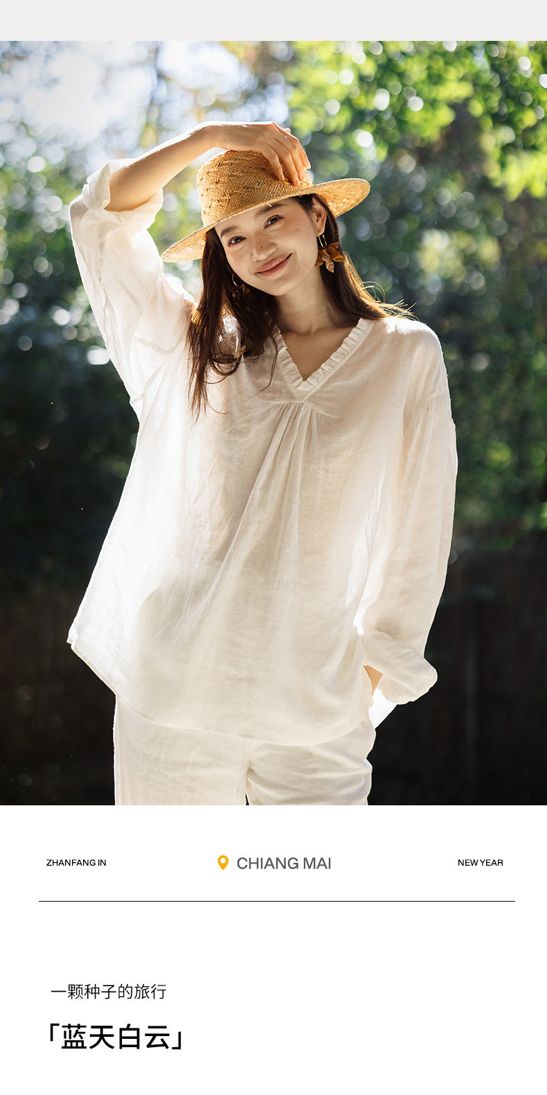 特绽放097朵/蓝天白云*21支纯亚麻木耳边v领一手长碎褶长袖衬衫女