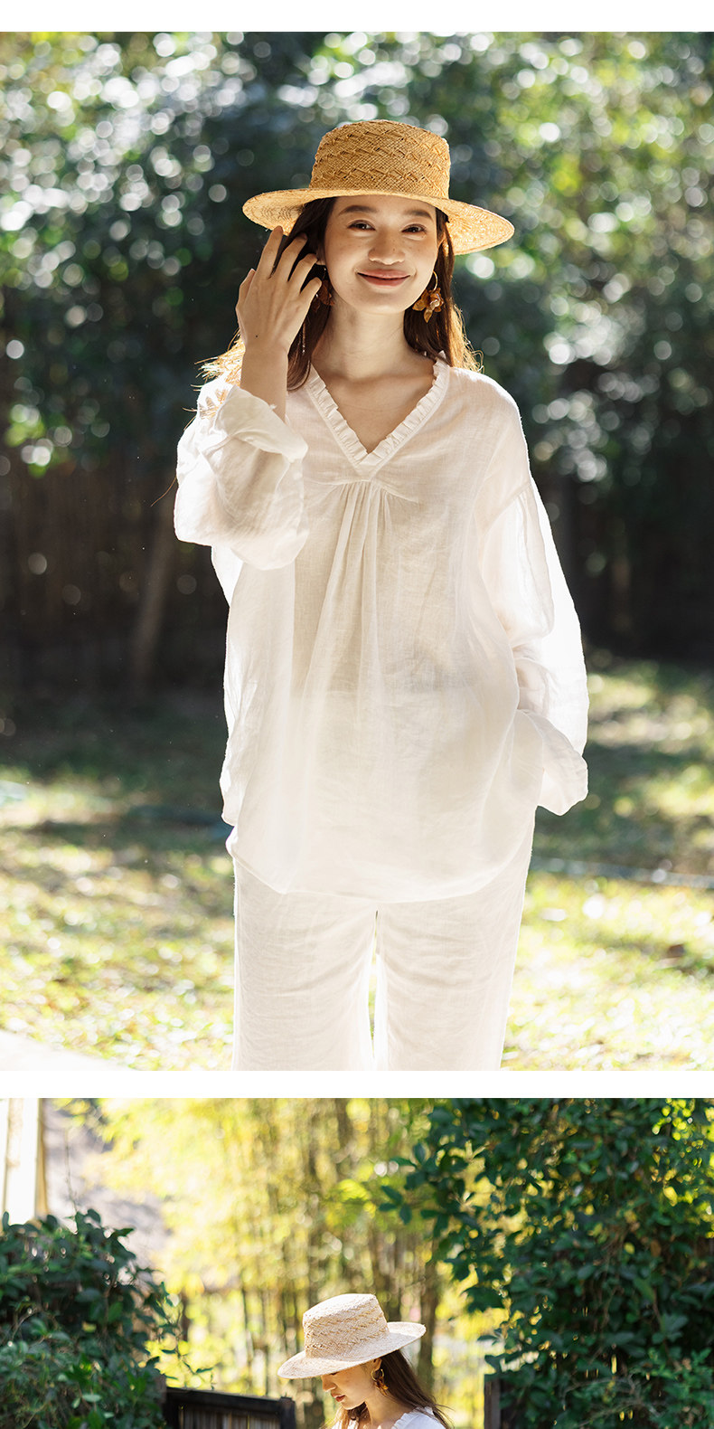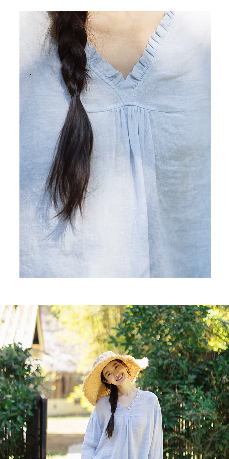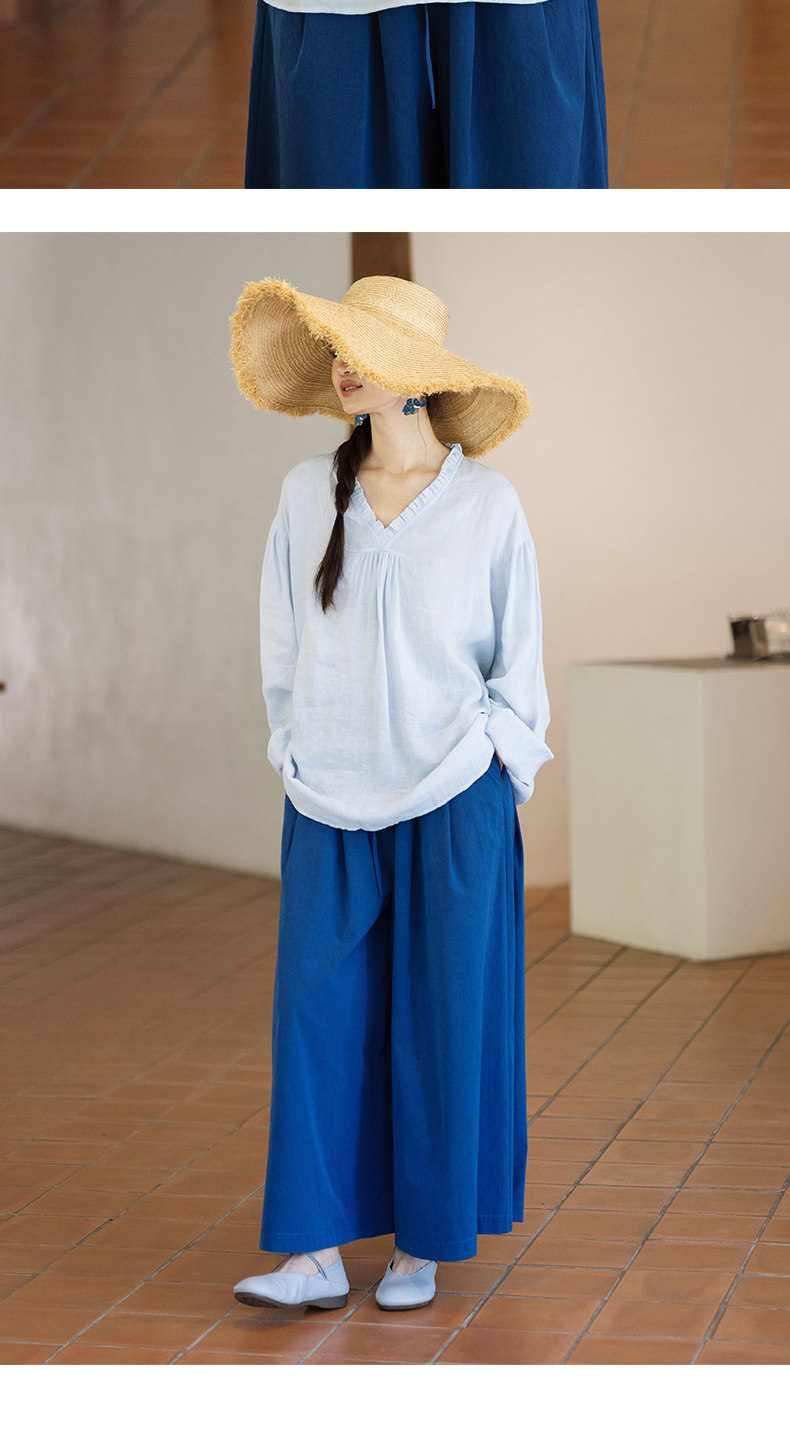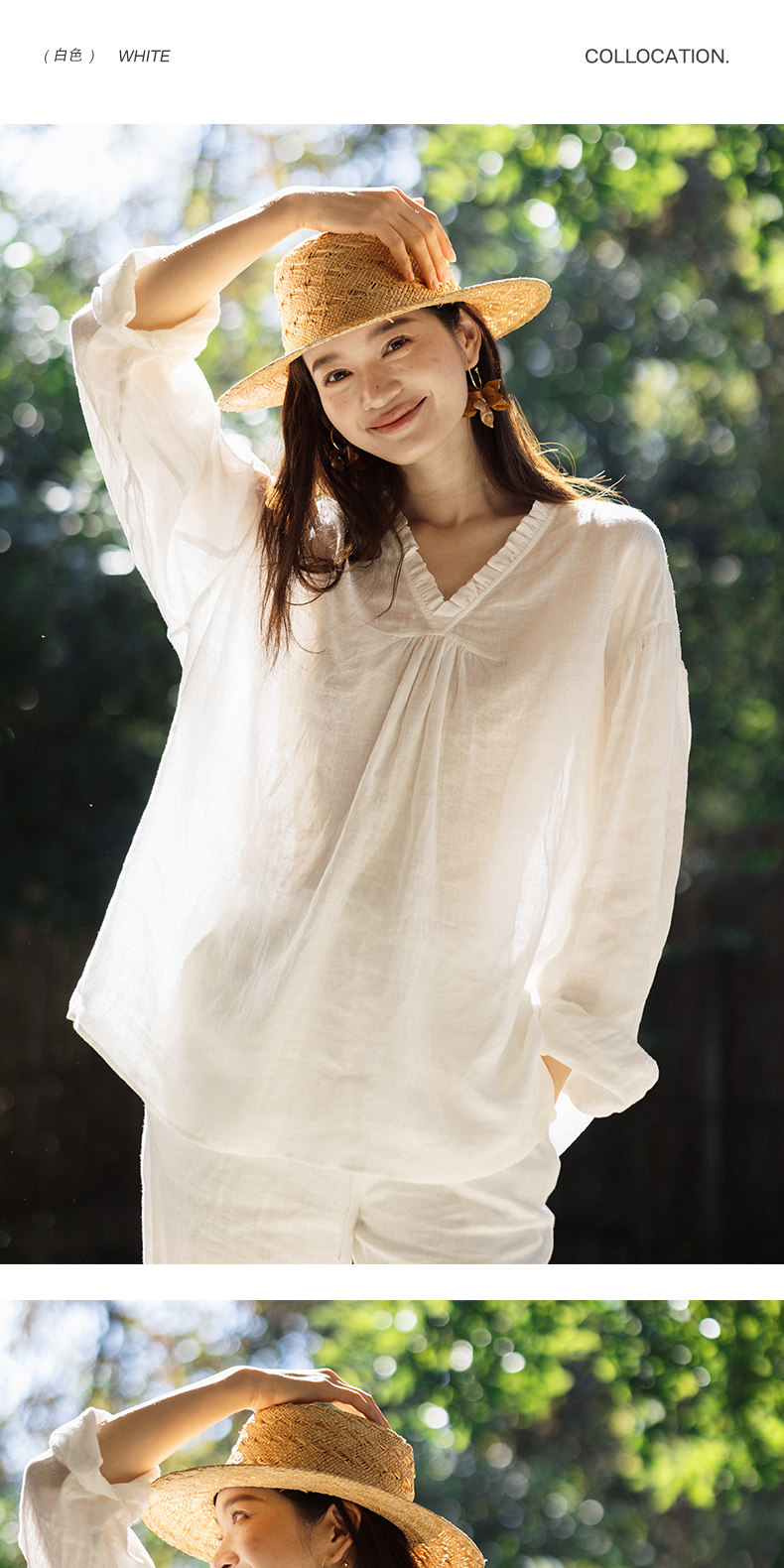 特绽放097朵/蓝天白云*21支纯亚麻木耳边v领一手长碎褶长袖衬衫女