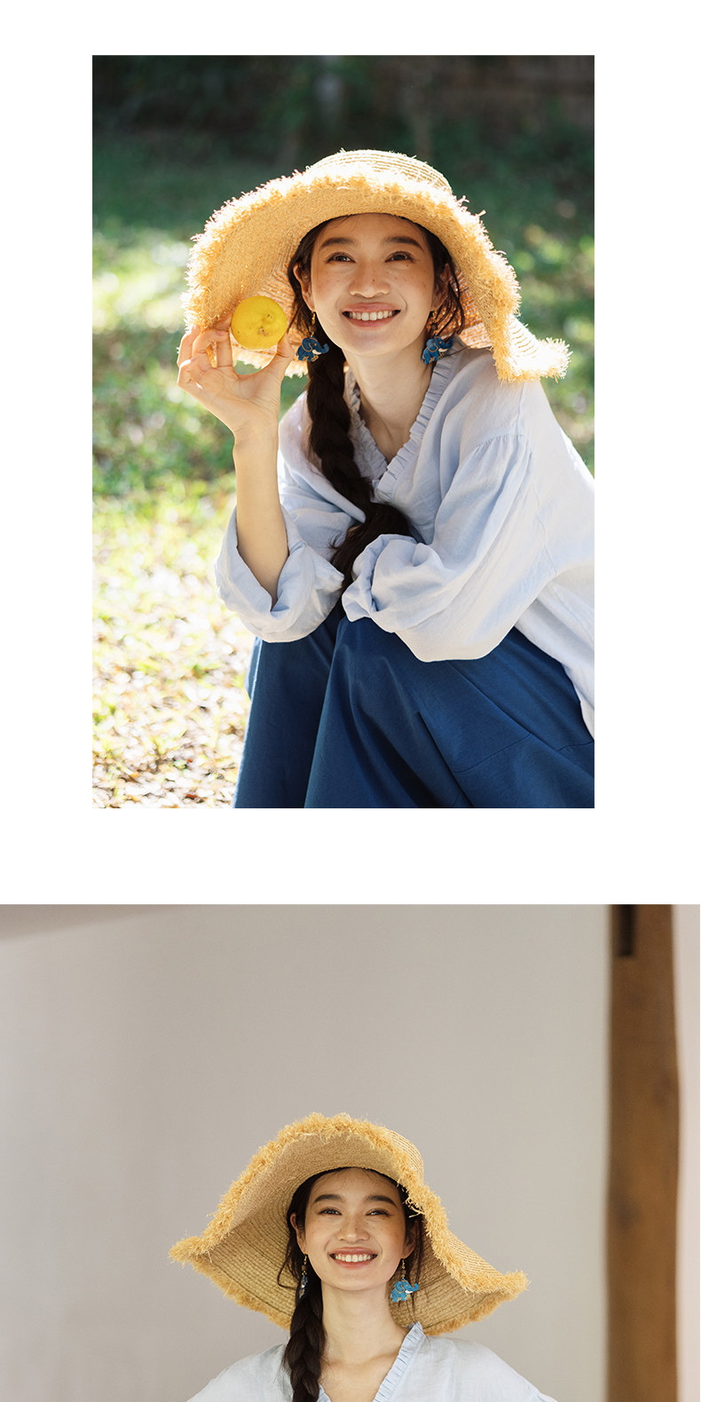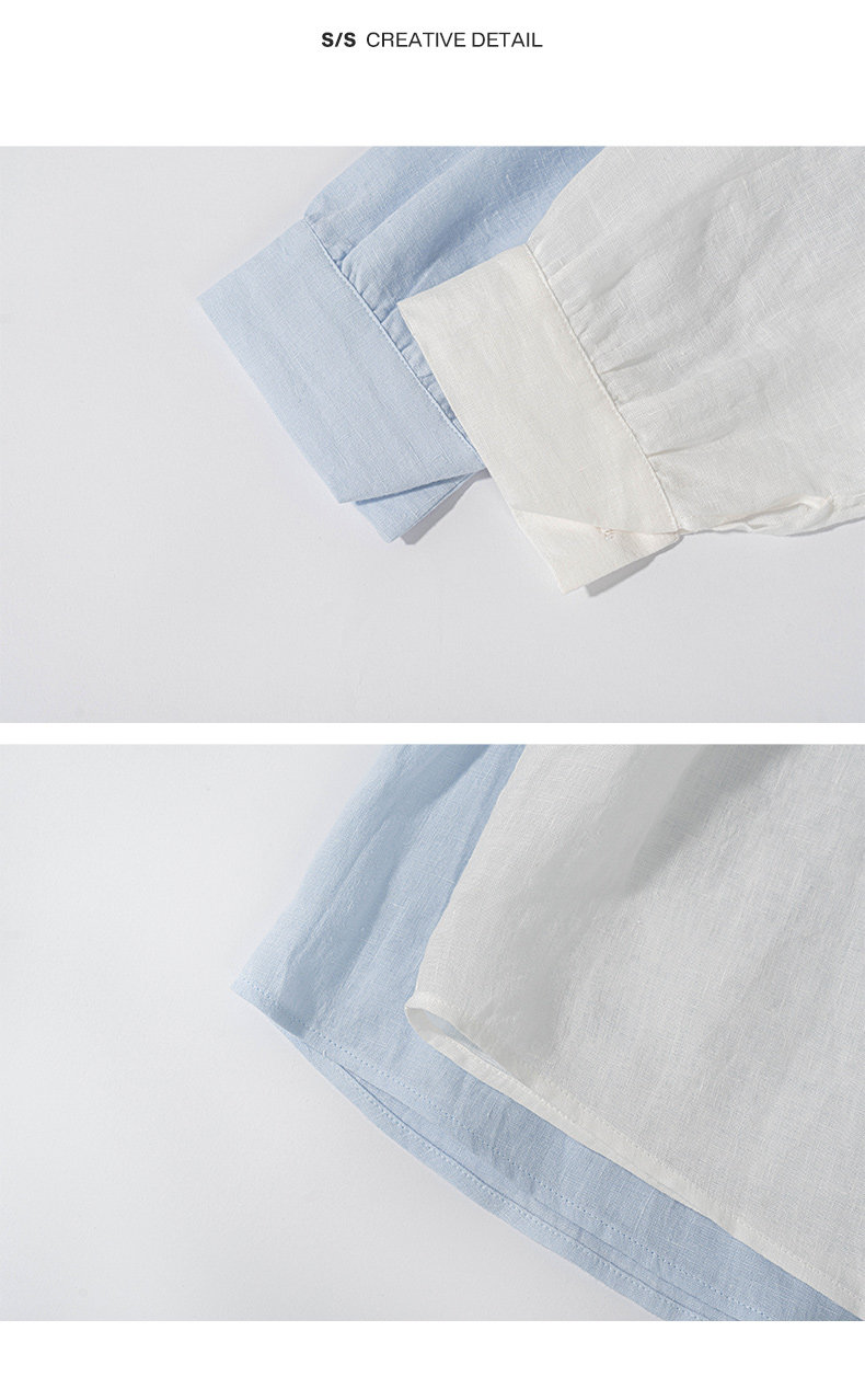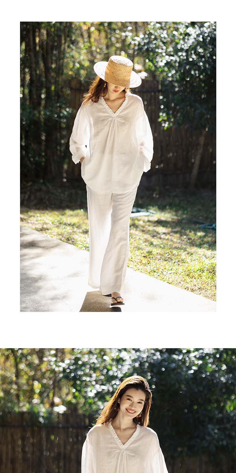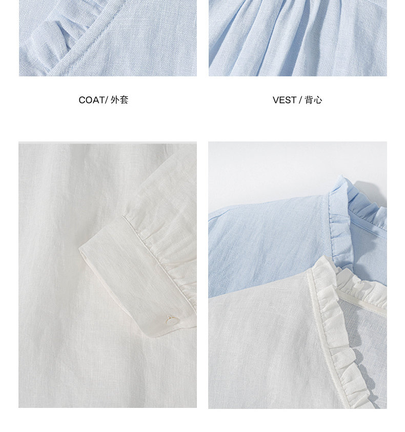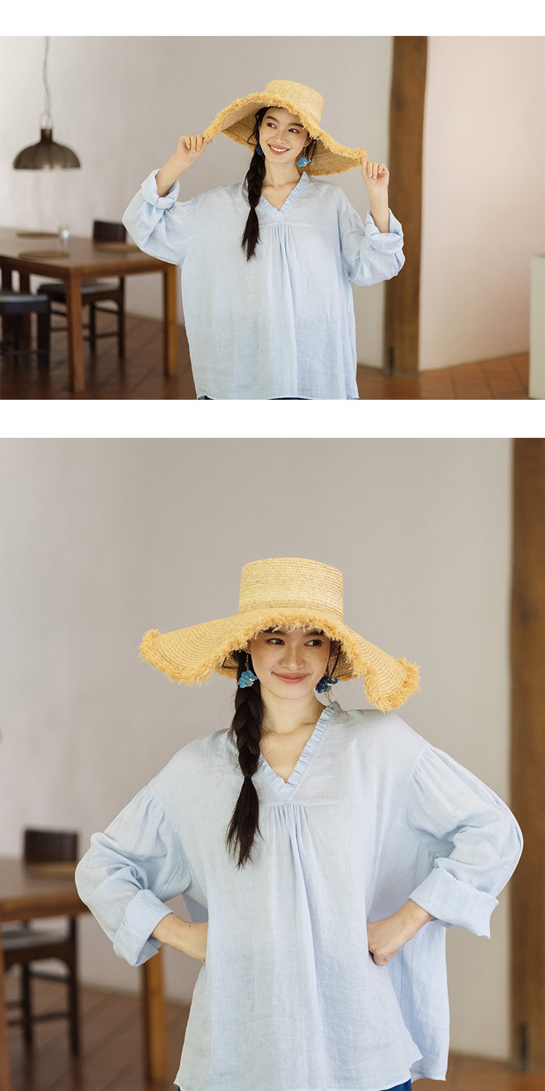 特绽放097朵/蓝天白云*21支纯亚麻木耳边v领一手长碎褶长袖衬衫女