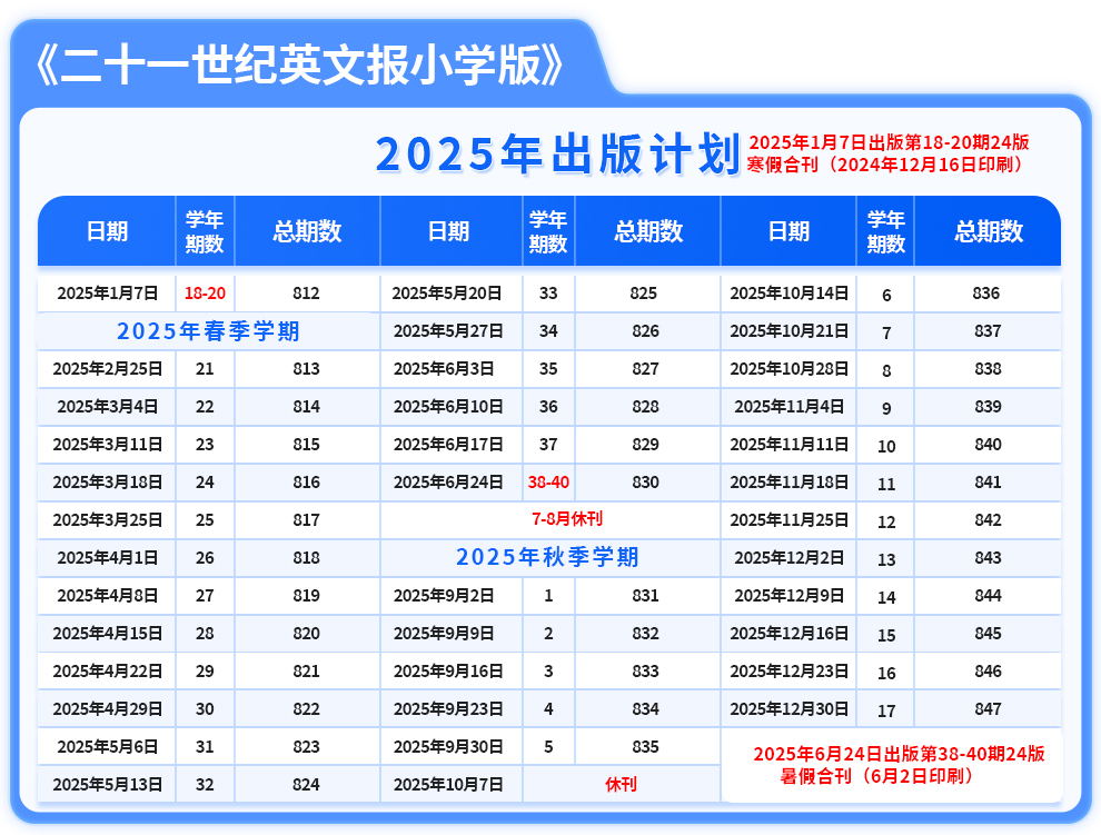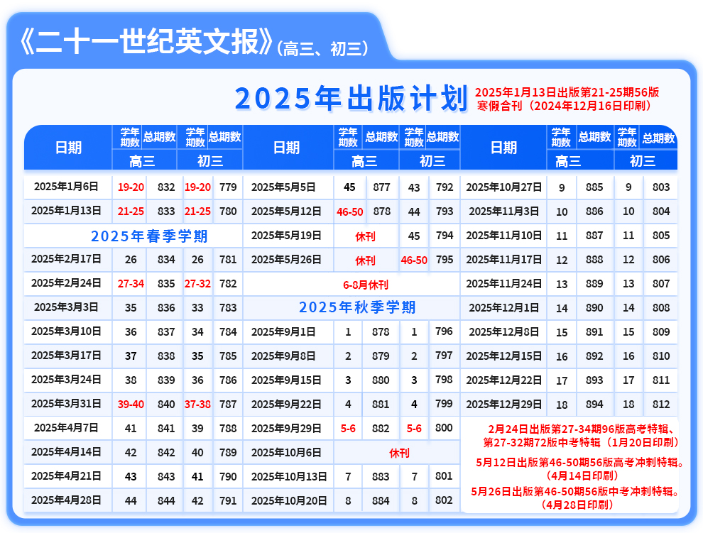 1、21世纪英语报为周刊,少儿画报全年10期,小学版全年40期,初中及高中版全年50期,每月底发出当月出刊的内容。