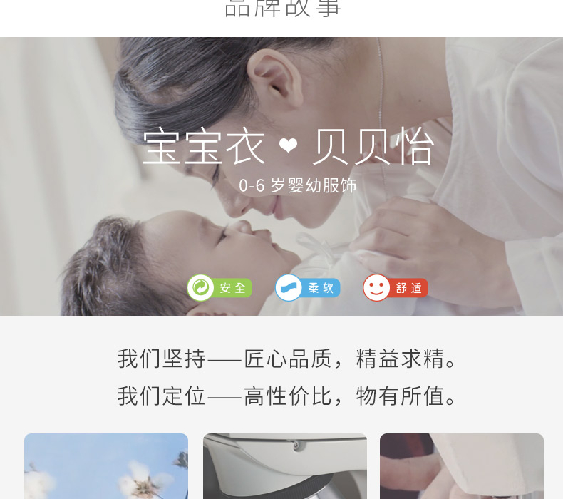 - 贝贝怡专注0-6岁婴幼儿服饰,坚持安全、柔软、舒适的产品理念,为千万中国家庭提供超高品质、安全可靠的婴幼儿服饰产品,妈妈放心,宝宝开心!