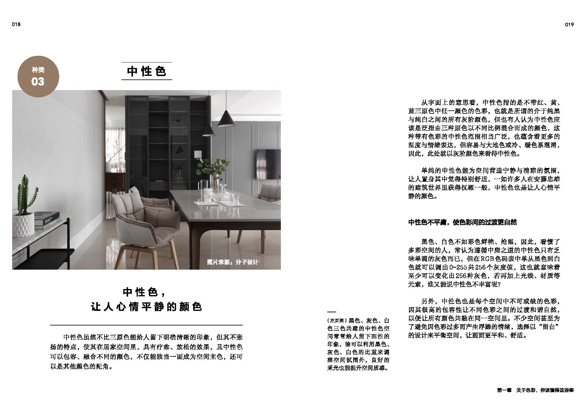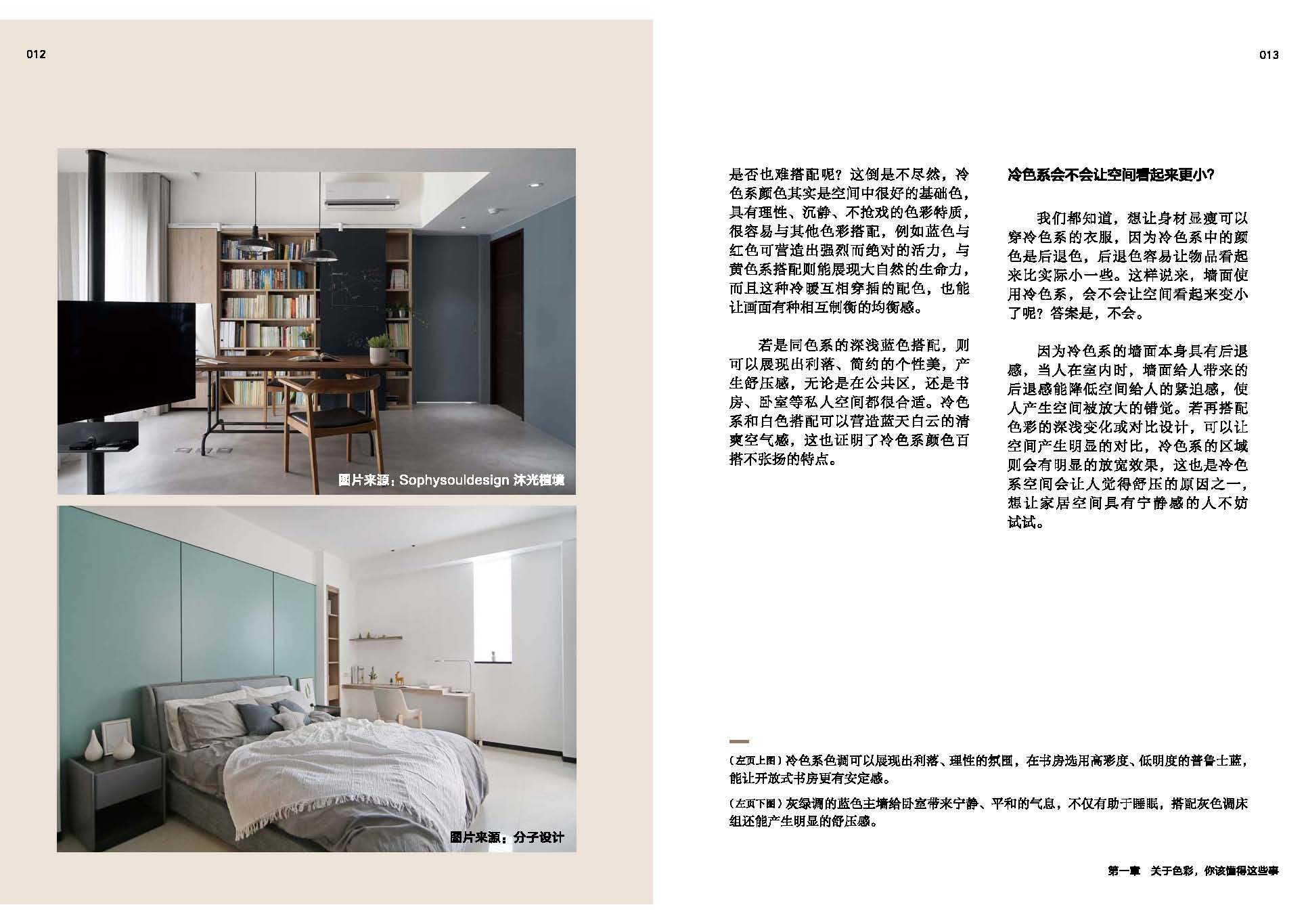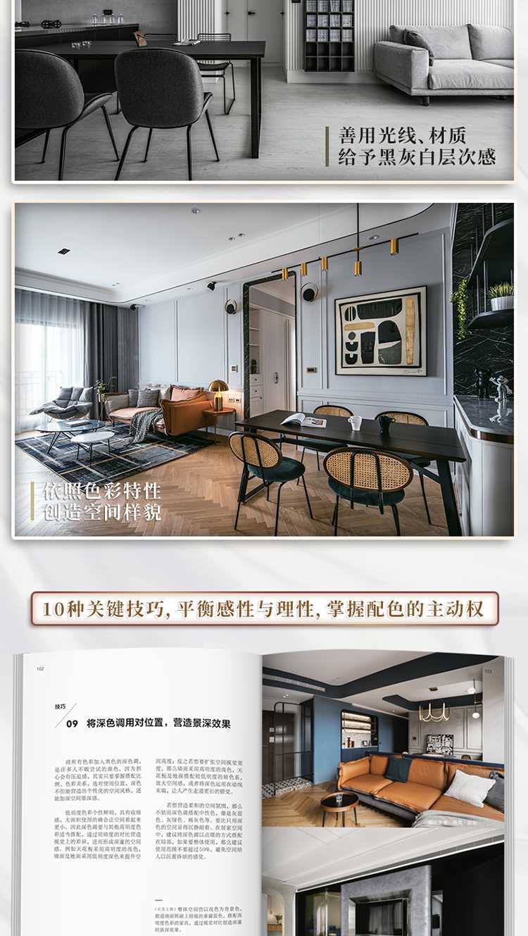 二章:家的配色,你可以这样做。实用配色心法与技巧。这是本书的精华所在。本章提供了坚实的逻辑框架与10个易上手的实用技巧从不会出错的三色比例,到生动活泼的互补色搭配;从和谐的单色渐变,到利用光线与材质为黑白灰赋予层次感。让你在感性与理性之间找到平衡,掌握配色的主动权。
