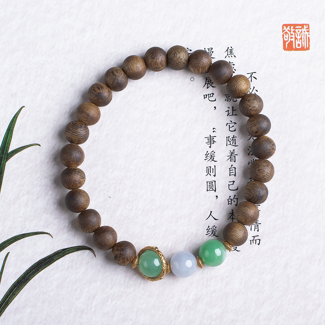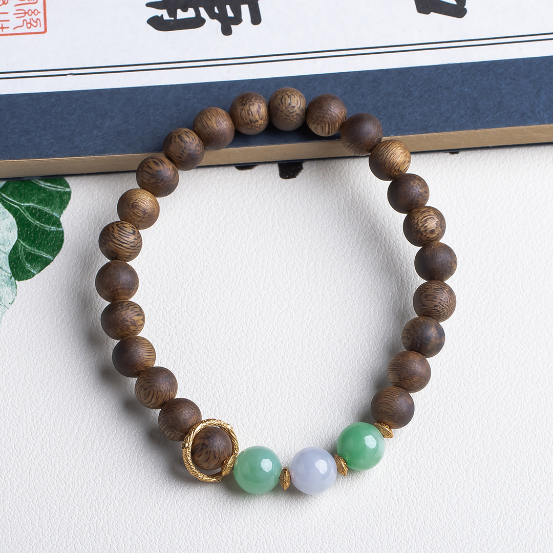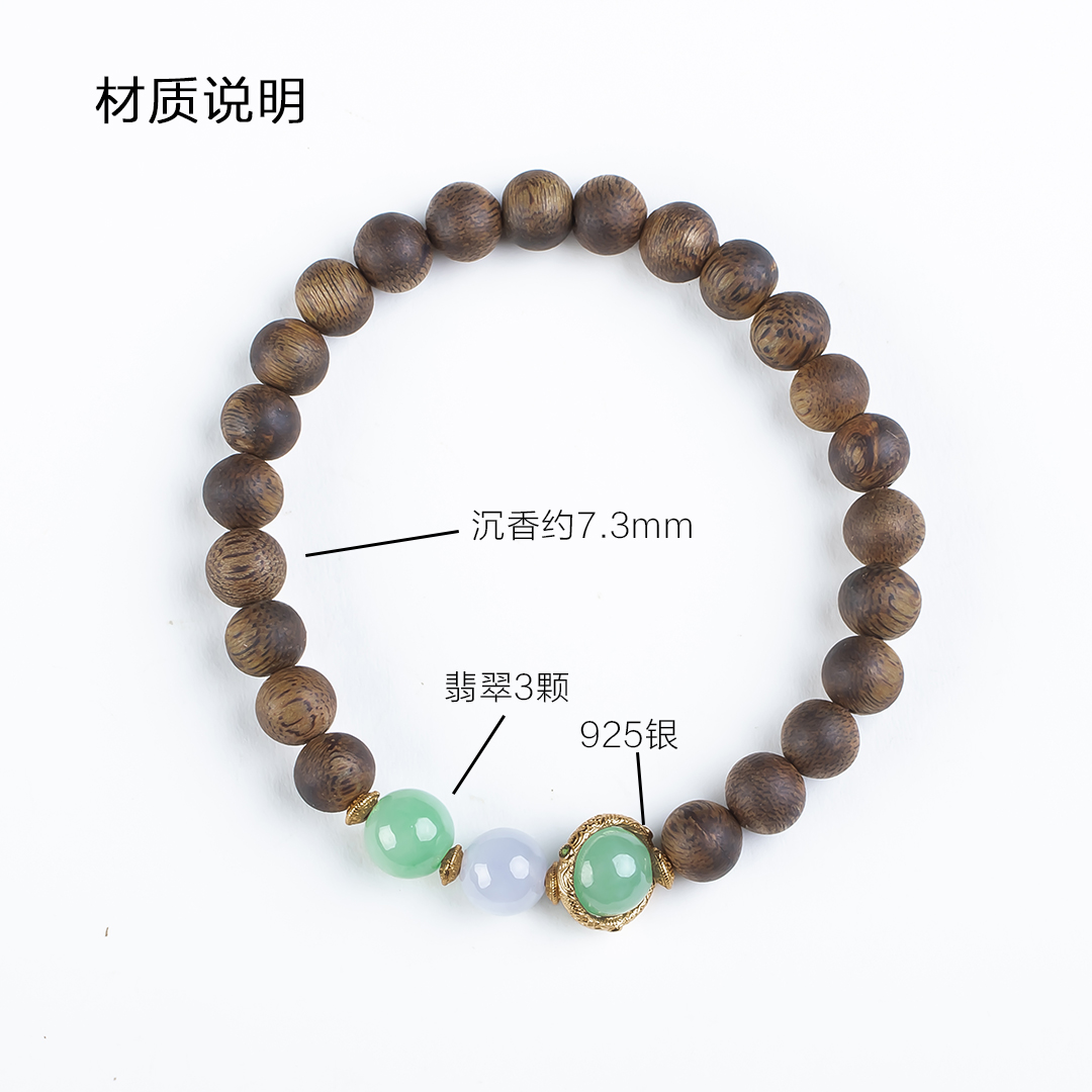xy0476沉香+翡翠转运手串.银,天然沉香约7.3mm,原色原味,香味自然清甜,三颗冰糯底带色翡翠搭一枚转运小跑环,美玉养身,好运在手。