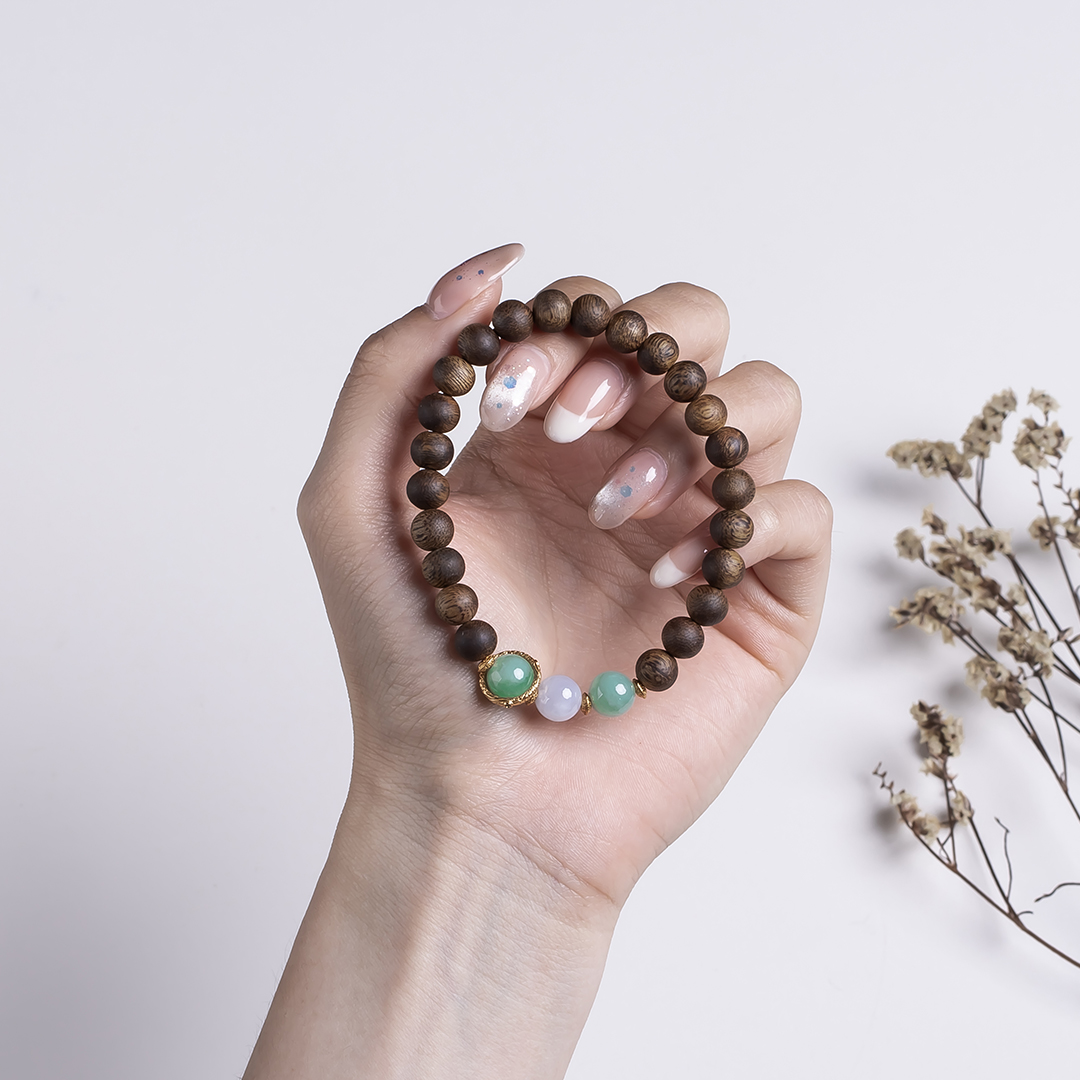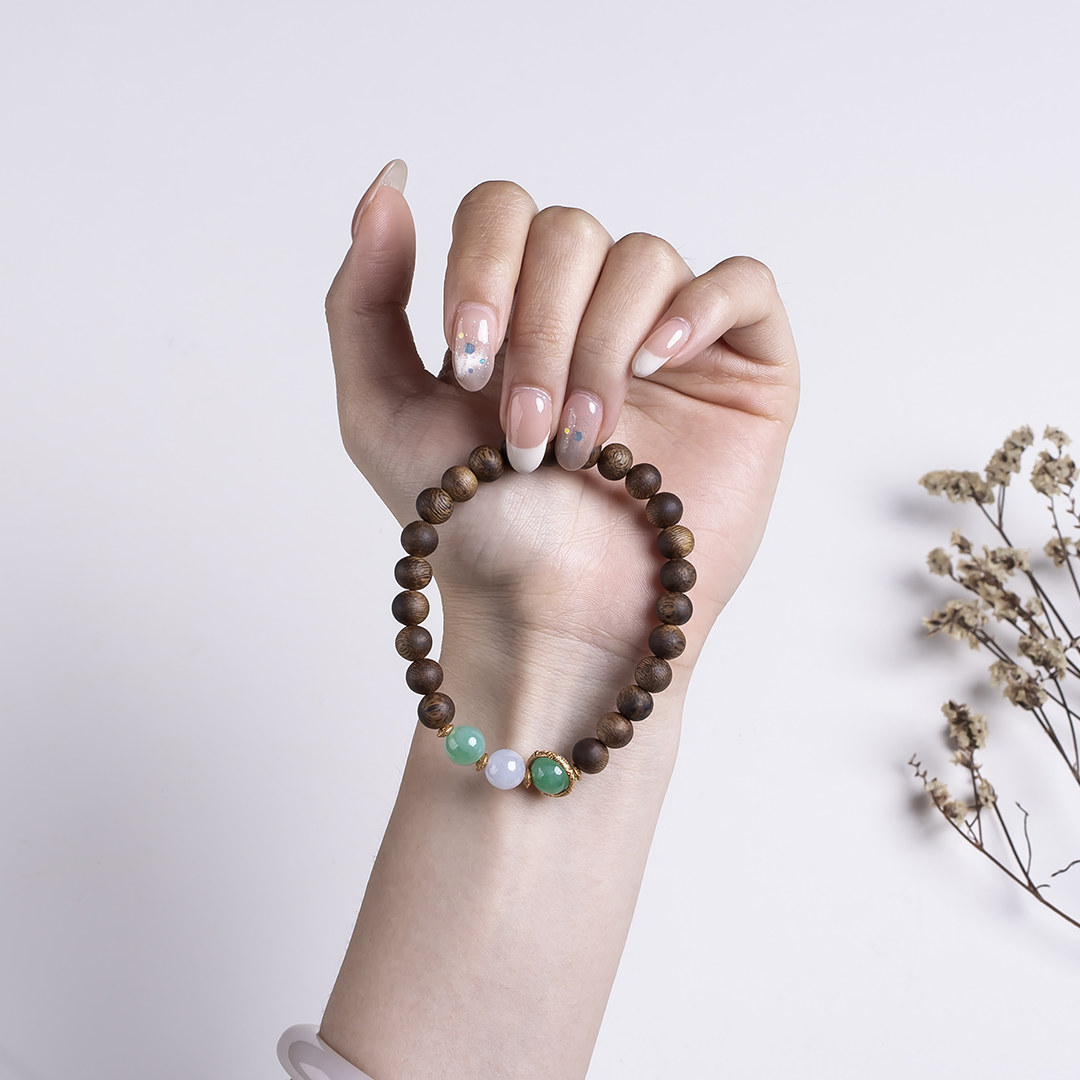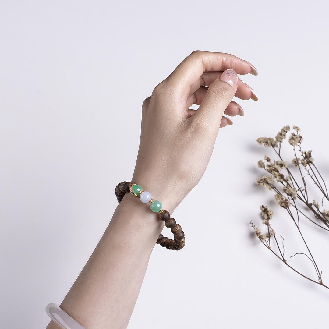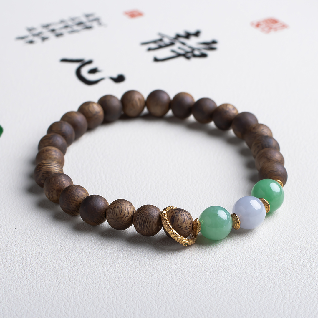 xy0476沉香+翡翠转运手串.银,天然沉香约7.3mm,原色原味,香味自然清甜,三颗冰糯底带色翡翠搭一枚转运小跑环,美玉养身,好运在手。