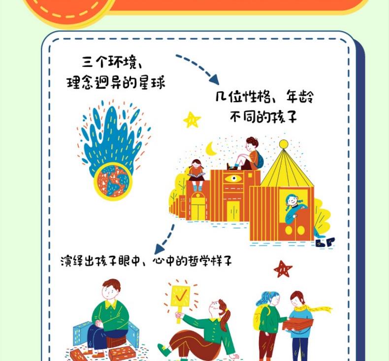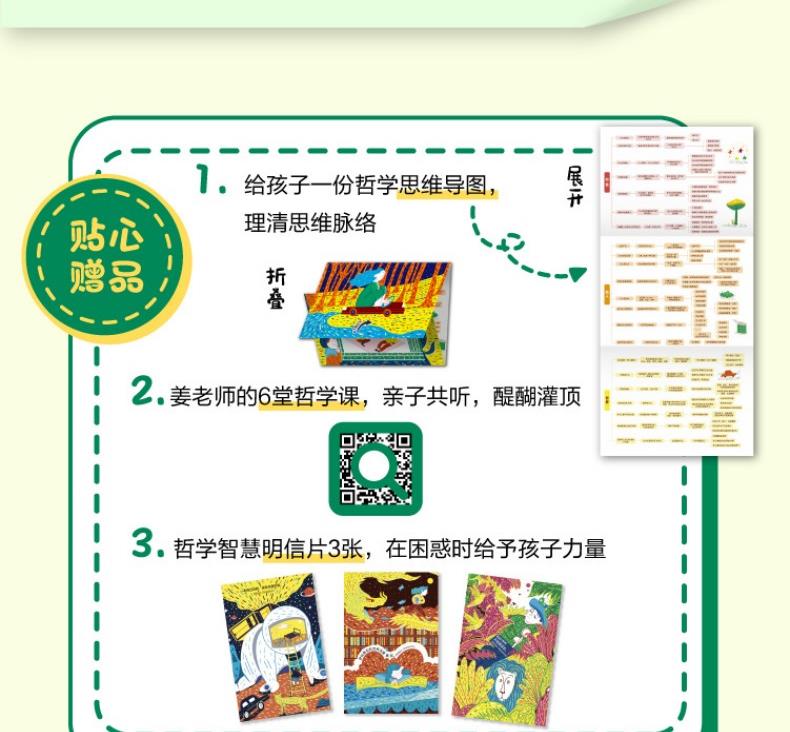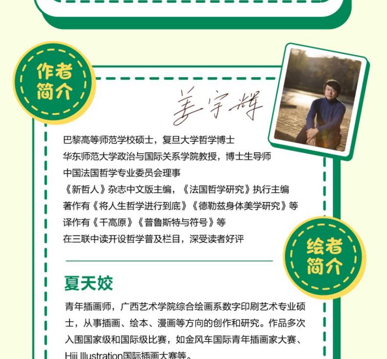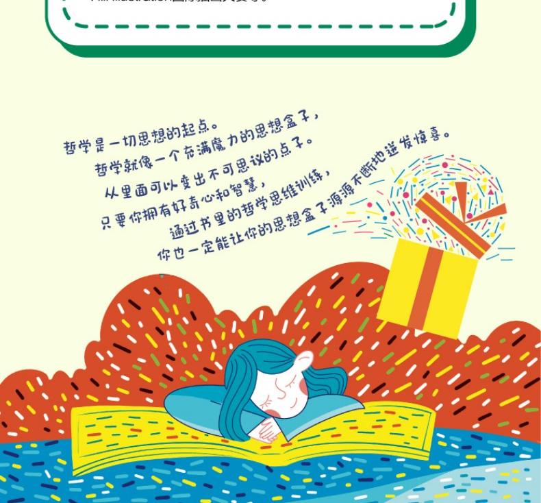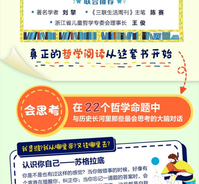 1、让孩子在心智最灵活的阶段遇见优选的哲学启蒙 国内数一数二的大学的优选的青年哲学教授,给孩子讲解哲学,让孩子感受思想的魅力;与历史长河里那些最会思考的大脑对话,学会思维的方法和技能。 2、22个基本哲学命题,涵盖孩子生活的方方面面,让成长不迷茫 主题从“自我”、“社会” 到“世界”,让孩子从自我思考,扩展到身边的其他人再到世界,可以理解我们的生活,理解世界的多元,他人的不一样。 3、用10个哲学思辨方法,培养独立思考能力、逻辑力 书中用助产术、归纳概括、定义法、诡辩等多个哲学思辨角度,对孩子进行思维训练。每个思辨方法都有具体的实例来演示推理、思考过程,让孩子们了解大哲学家是如何一步步得出他的结论的,用哲学培养思维能力、逻辑力。 4、让抽象的哲学变得易读好懂 用现实的案例+虚构的故事,把哲学“道理”原原本本地讲清楚
