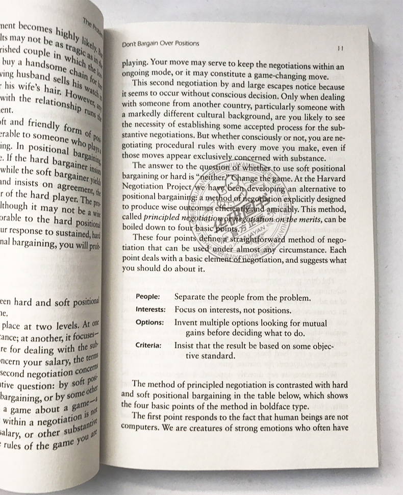 谈判形式千差万别,但基本要素不会变,因此,在各种谈判中,原则谈判方式都完全适用。Getting to Yes《谈判力》便介绍了有关原则谈判的方法。