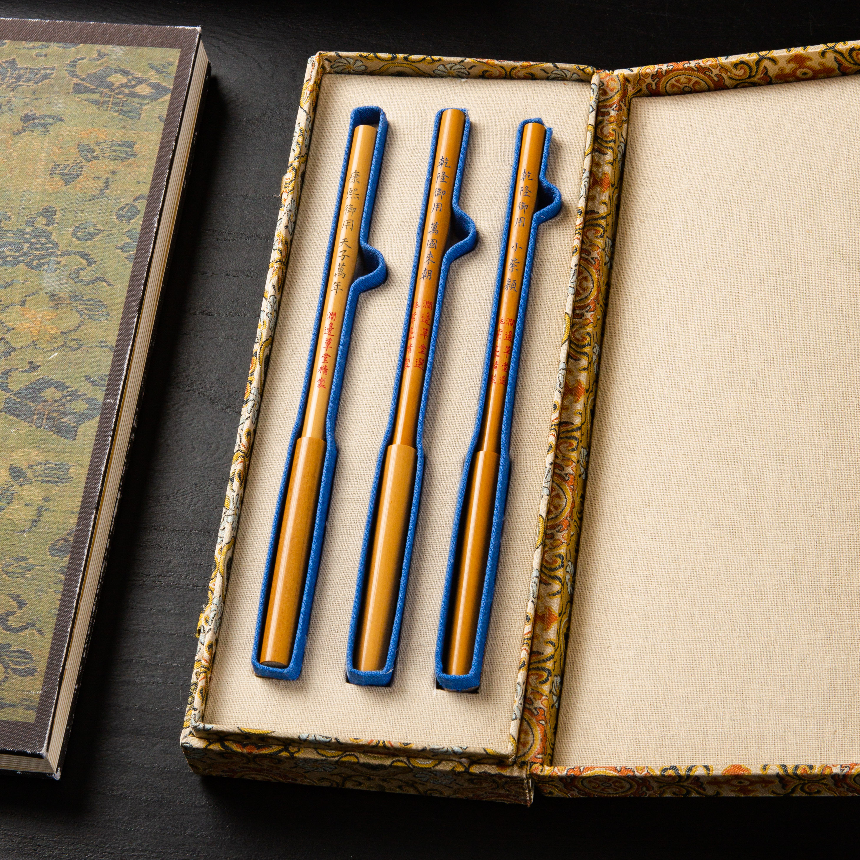 “清宫御用三剑客”毛笔套装,此套笔是按照笔谱中皇帝御用之笔复刻,所用材料为镊子一根一根挑选的顶级紫毫,笔毫由非遗大师精制,兰蕊型笔锋工艺复杂,苏工笔杆,笔杆手工双刀刻字,每一套都配有精制锦盒。