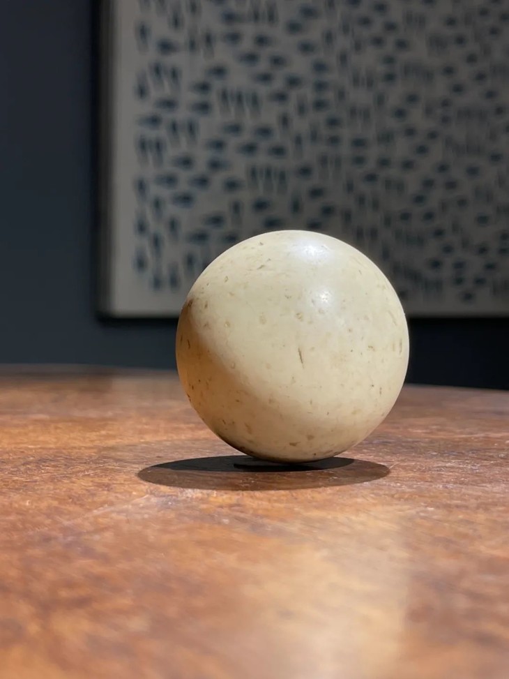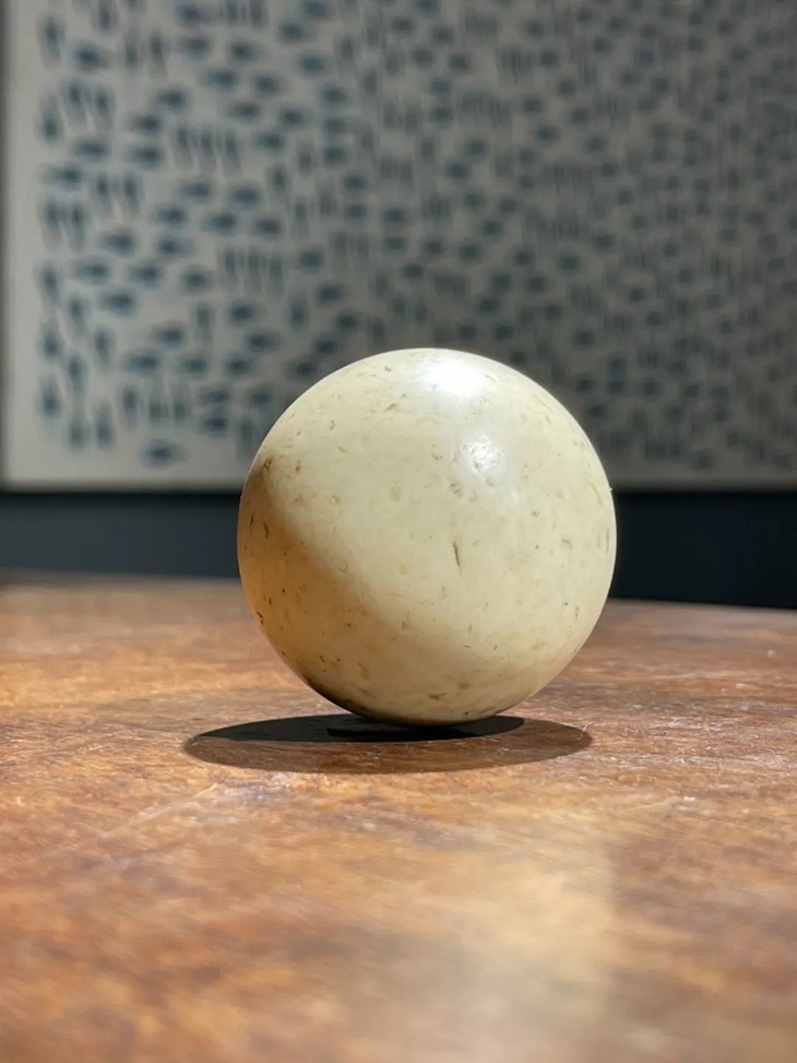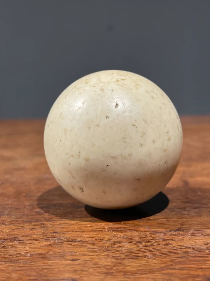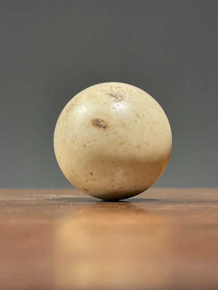 手掌中握一颗或是两颗圆球盘捻或旋转是中国传统健身运动,此种圆球称捻球或是掌旋球,近代或称“健身球”,以手掌耍弄圆球锻练指掌能达到活络筋骨的健身活动。球多为铁质,钢制、玉石、核桃仁,此颗汉白玉圆球取材上好石材琢磨而成掌中球百年以上的老圆球,汉白玉石表面包浆浑厚,握于掌心舒适温润,是难得一见原汁原味的老手捻球。