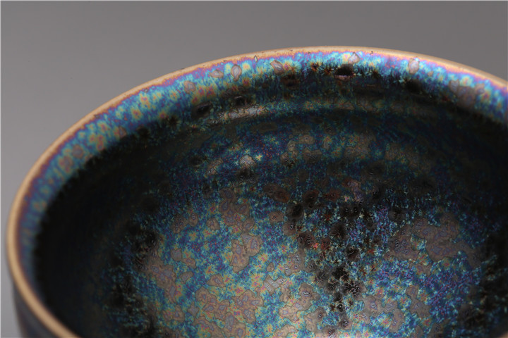 七彩曜变天目釉 罗汉盏器形偏大,杯口直径达到了85mm,非常适合作为主人杯日常品茗,案头观赏。110ml的容量,免去了频频续杯的麻烦。伏案写作,围炉剧谈,一杯足够啜饮七、八次。当唇部与杯沿接触的一刻,您会更加深刻地体会到合适器形、特殊釉料所带来的美妙品茗感受。