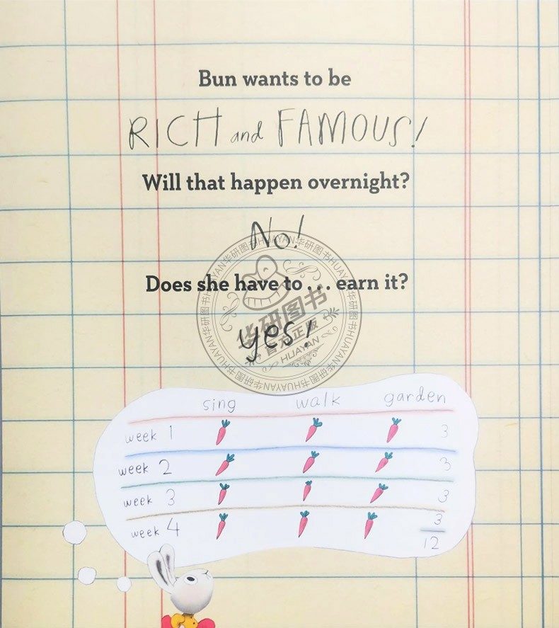 Bun wants to be rich and famous. She loves to sing and knows she’s meant for a career on stage. It should all be pretty easy—her mom can just drive her to the concert hall to perform! But her mom reminds her that most good things, like the garden they are growing, take time and work. At first, Bun isn’t terribly excited by the idea of singing lessons and practice, but as she does the math and daydreams about her future singing career, the more she starts to like the idea of earning her way to stardom—a feeling just as good as being rich and famous!