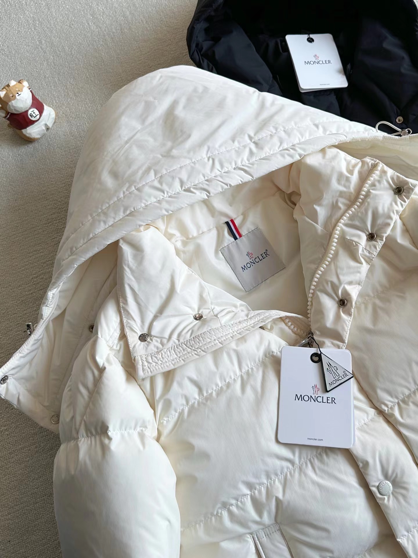 Maya 系列 70周年拉链口袋Logo 纯色徽标宽松短款长袖舒适透气羽绒服 填充白鸭绒,保暖度满分,北方过冬也无压力! 标志性设计: 肩膀饰以品牌标志性超大金属拉链,极 具辨识度,彰显Prada工业美学风格。糕级配色: 哑光黑色与柔和白色(Sandstone)碰撞,形成鲜明对比,低调中透出不凡品味。