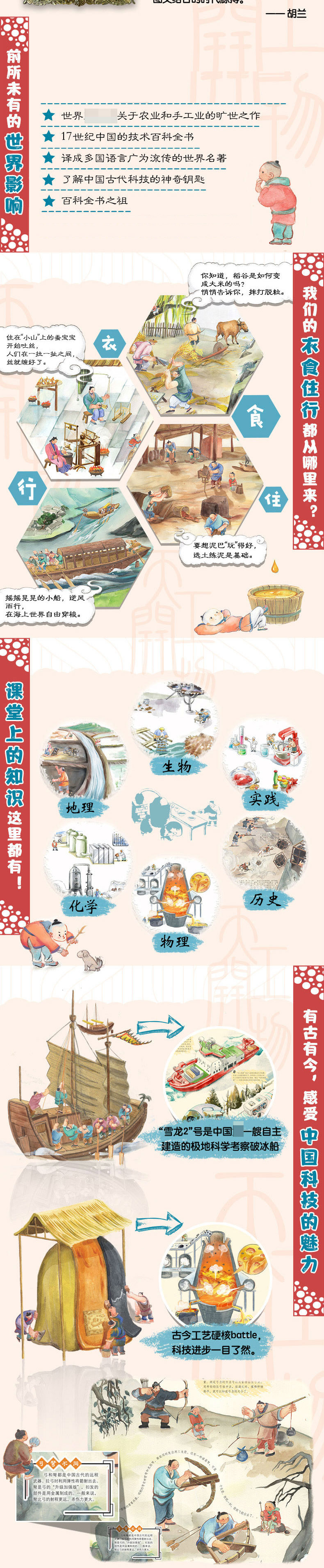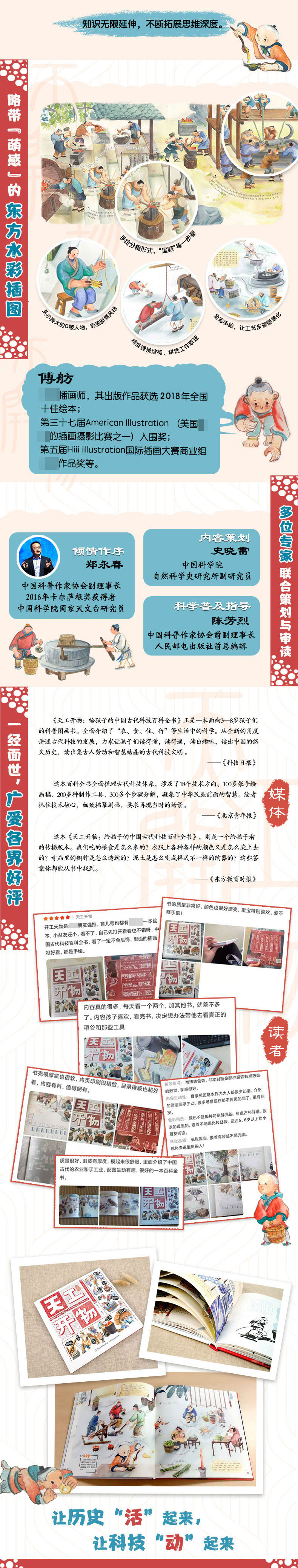 1.入选2022年向全国青少年百种优秀出版物、获文津奖等重磅奖项。入选中华优秀科普图书榜2020年度榜单、获2021年度桂冠童书、获首届“童阅中国”原创好童书奖等,拿奖拿到手软! 2.VR升级礼盒,让孩子体验5G新阅读。童趣出版与中图云创强强联合,推出新版VR礼盒,让孩子沉浸式感受古代技术,置身现场参与劳动。 3.内容承袭阅读指导目录指定书目,与实践类课程内容完全贴合,培养孩子核心素养。与科学、综合实践课内容相贴合,培养孩子核心素养。传统文化、科学原理、综合实践……打好课程基础,拓宽知识面。 4.涵盖面之广,内容之详尽,全面梳理古代科技体系。18个技术方向、100多张手绘画稿、150多个情景展示、200多种制作工具、300多个步骤分解,凝结了中华民族千年的智慧。 5.国际大奖画手献作,历时三年精心打磨。头小、身大的人物形象,彰显新颖独特的绘画风格。以分镜形式细腻“追踪”每一步骤,真正探究科技原理与细节。 6.义务教育科学课程标准组成员、教科版《科学》教材主编、中国科普作家协会副理事长郑永春专为此书倾情作序。中科院自然科学史研究所专家全程参与审校,向孩子们传递准确的科学知识。 7.古今技术对比,在科技浪潮中感受“科技强国”的魅力。3D打印、导弹、无人驾驶……每章一页现代科技,延伸知识展示现代科技给人类生活带来的巨大飞跃。