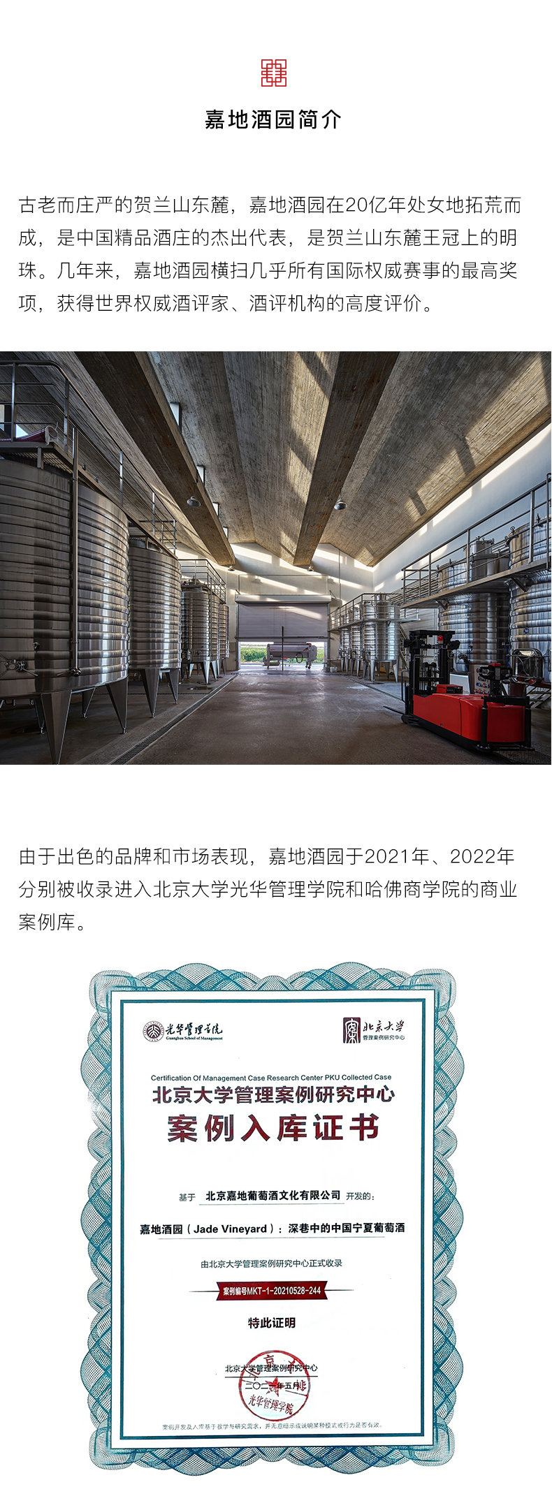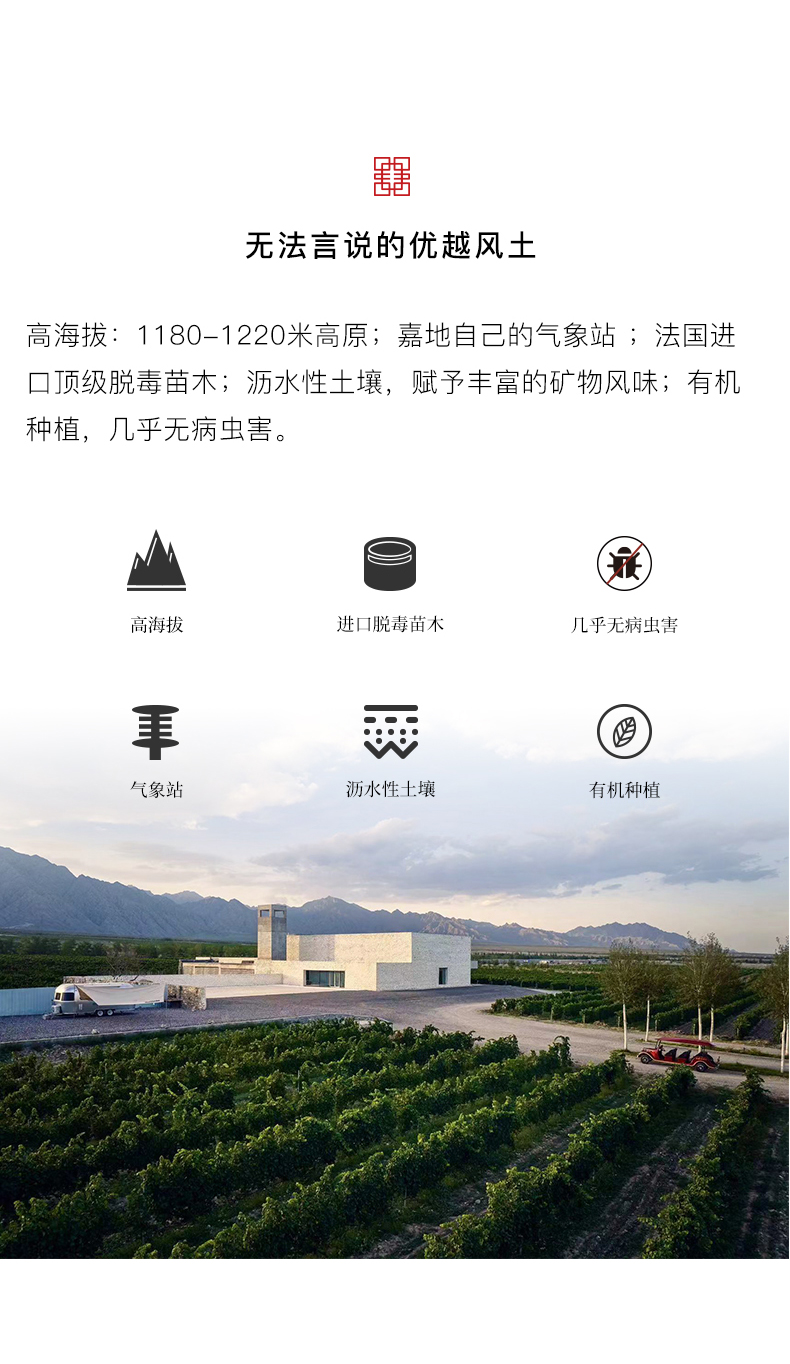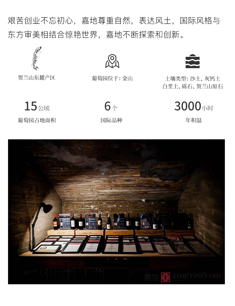 - 嘉地酒园,英文名称 Jade Vineyard 寓意一块美玉,坐落在银川贺兰山东麓。作为中国新兴精品酒庄,怀揣着要做中国顶级葡萄酒的梦想。