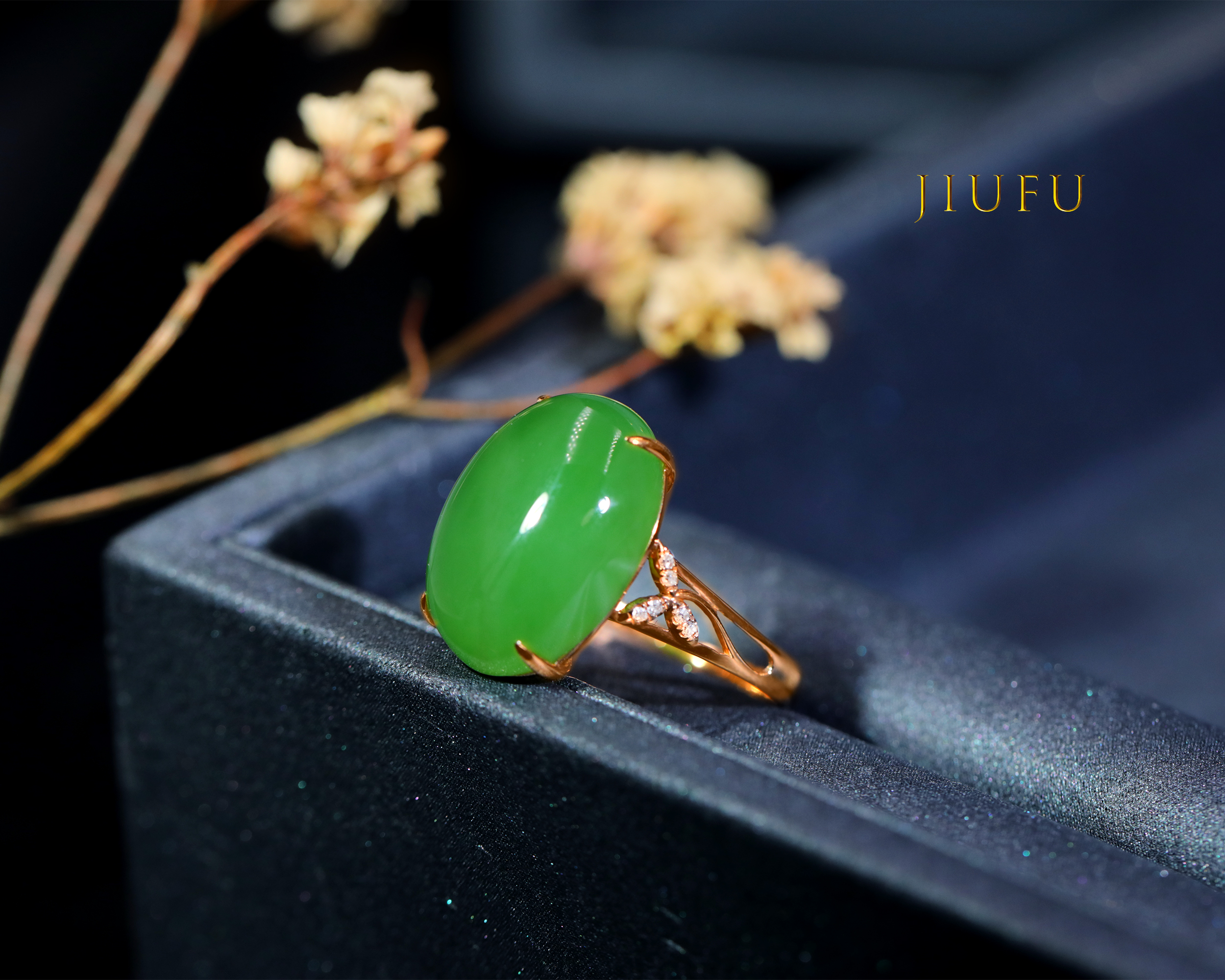 18K玫瑰金和田玉(碧玉)镶钻戒指